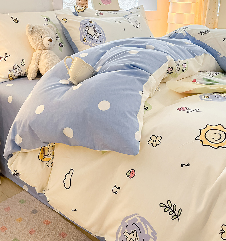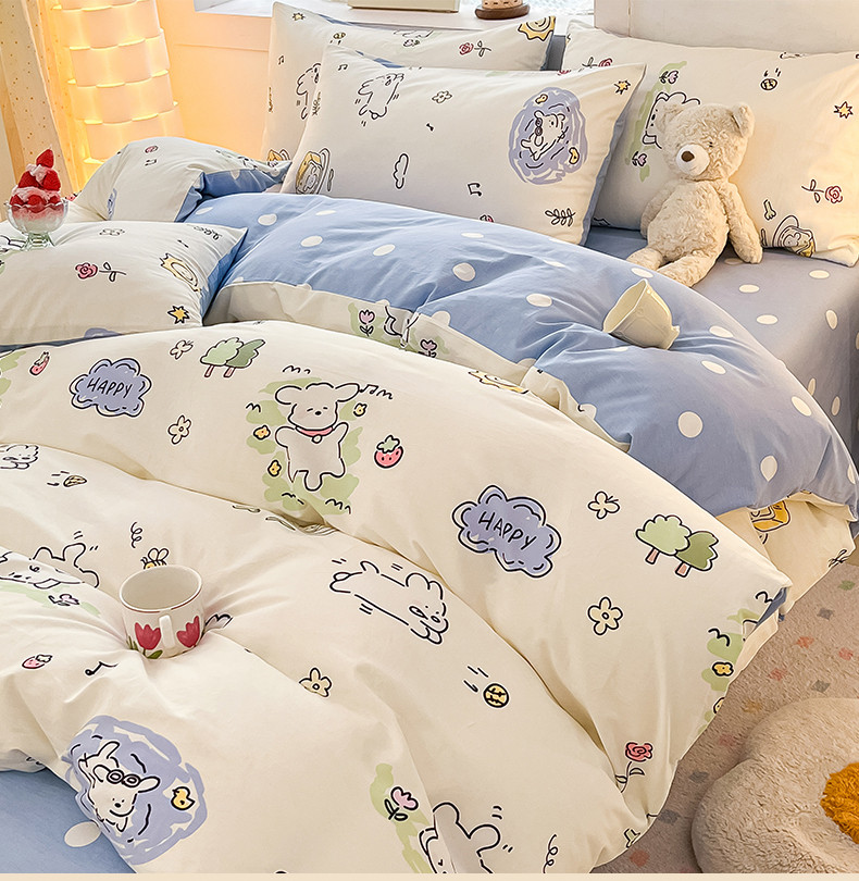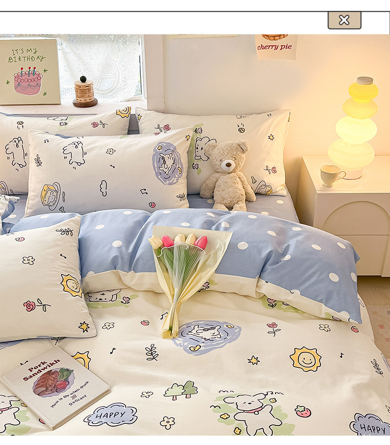 (总)曼之夏 2025新款全棉纯棉40支学生季卡通印花四件套,椰蓝小腊肠,茶茶狗,格子猫,嗨皮狗,开心屋,可爱多,可可汪,玛奇朵,奶昔小熊,泡芙小象,曲奇小狗,趣味熊,甜甜圈,甜心猫咪,童画,小狗日记,樱桃熊仔