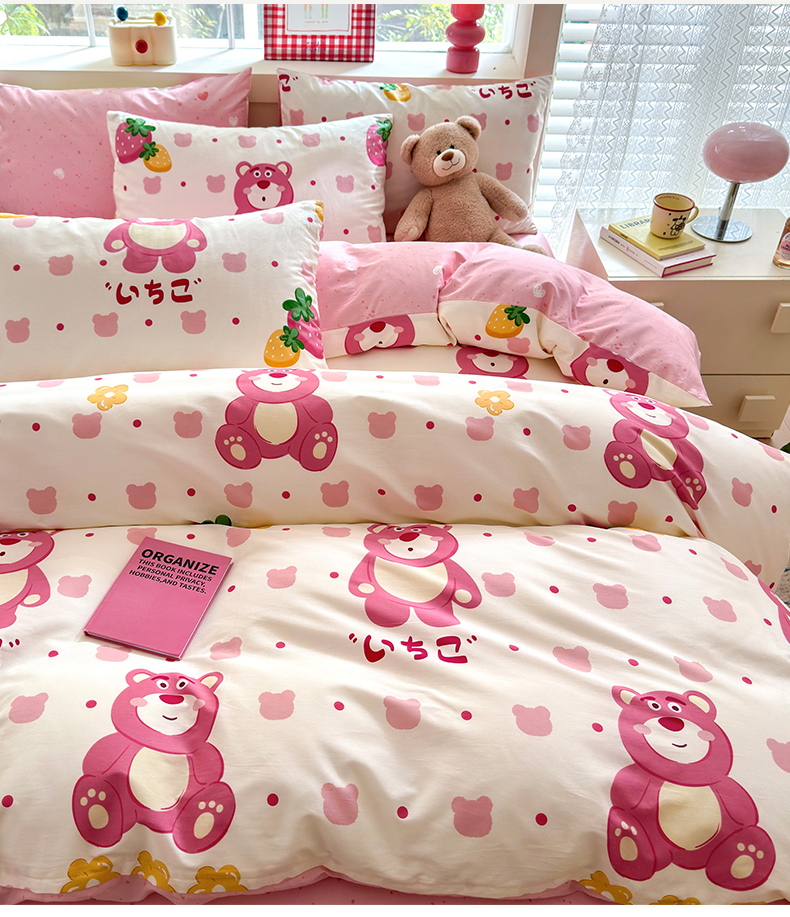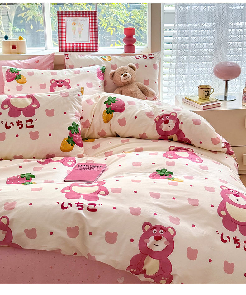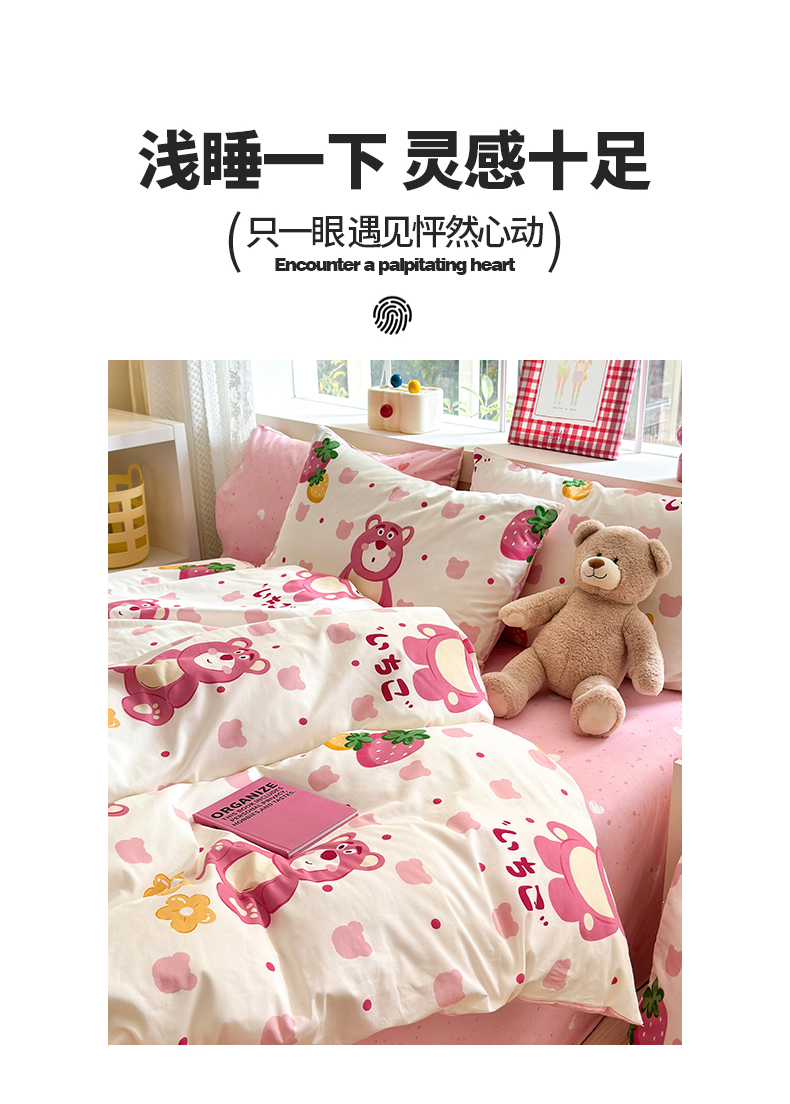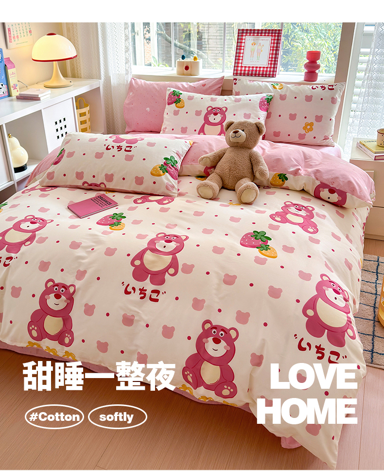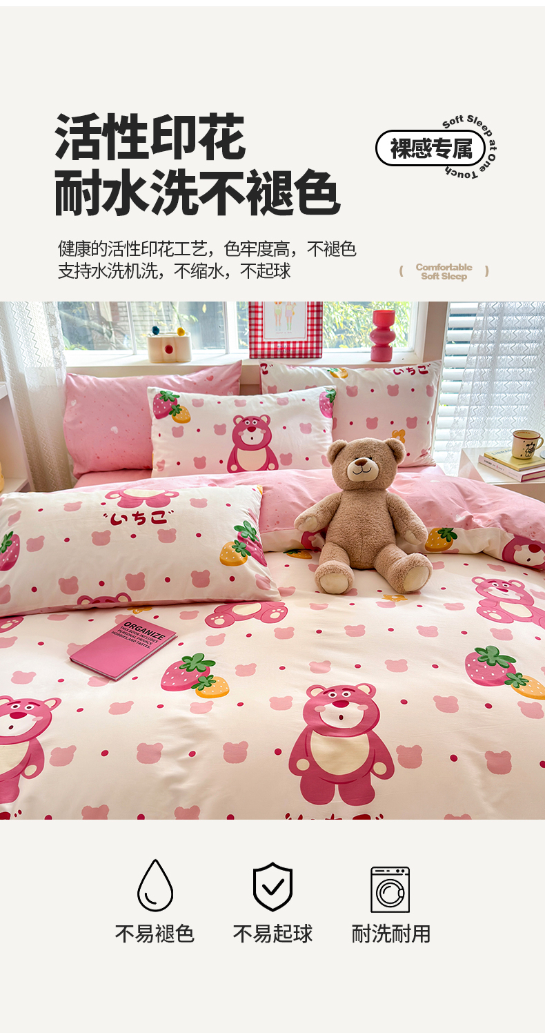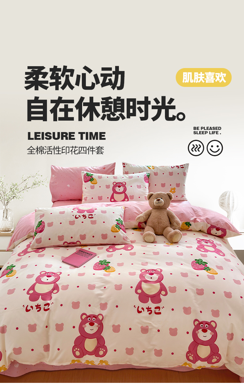 商品名称:清雅福 2024新款全棉13372小清新活性印花四件套 开心草莓熊