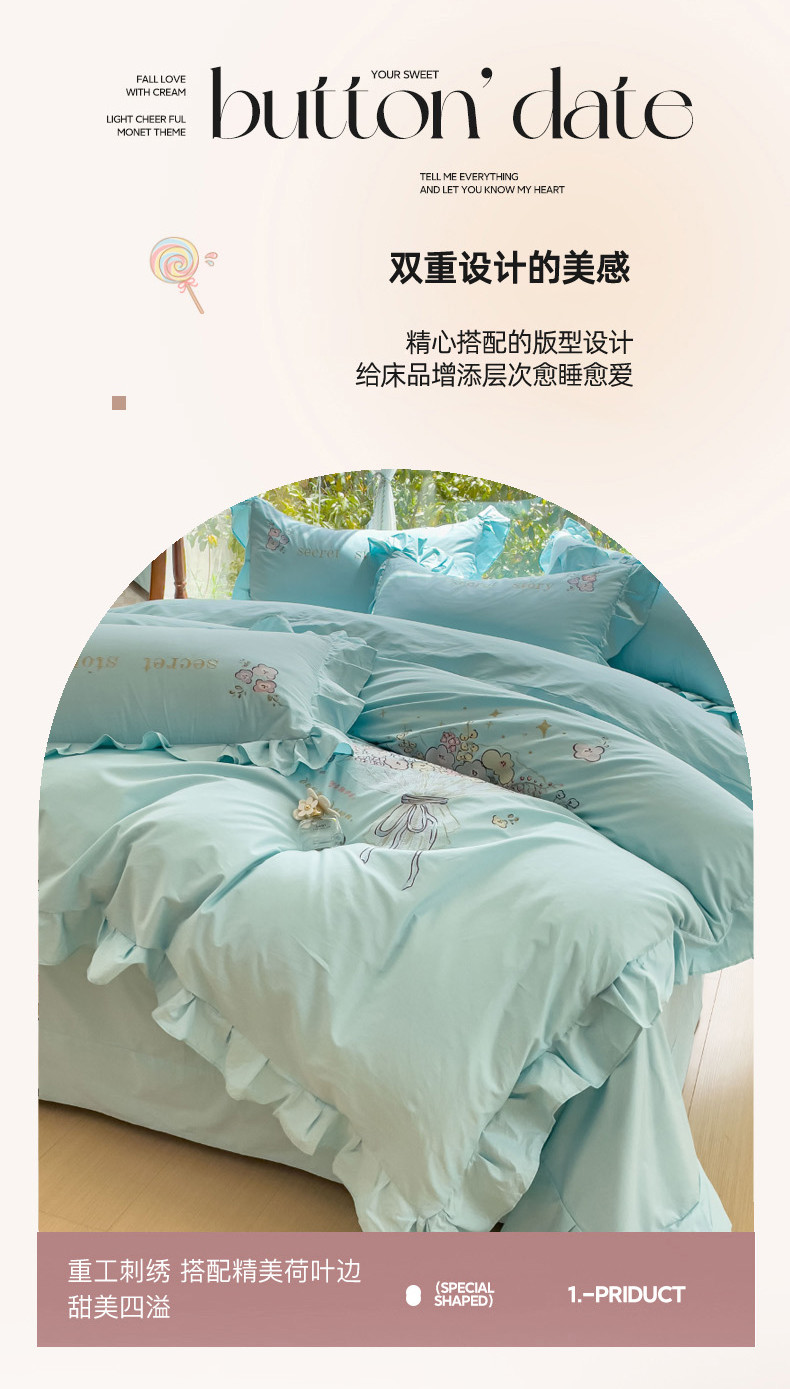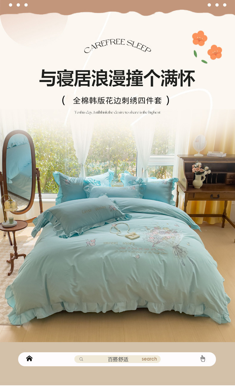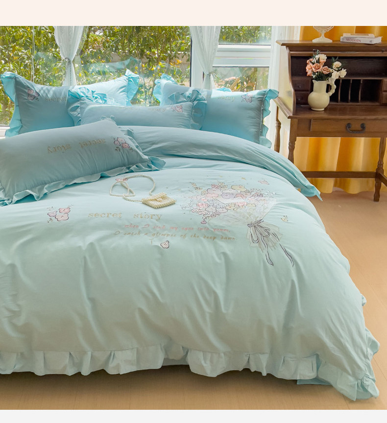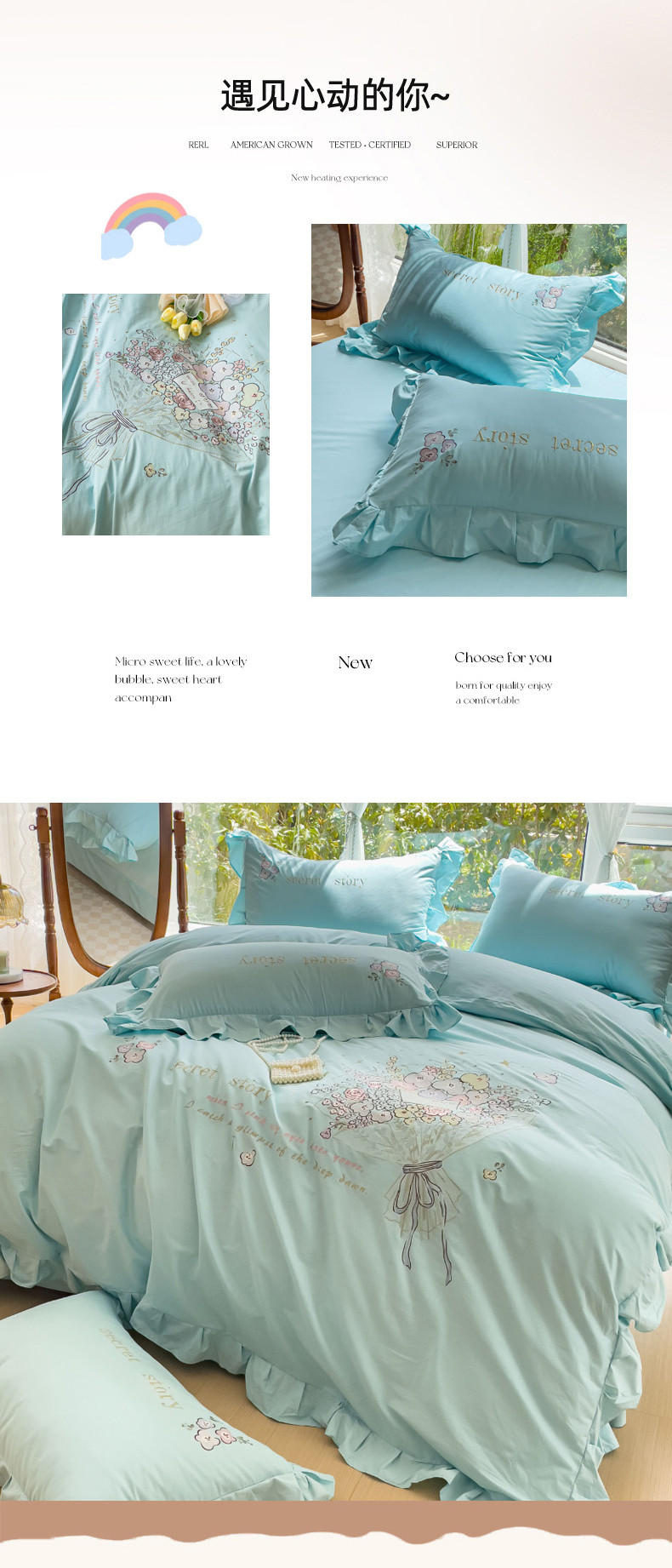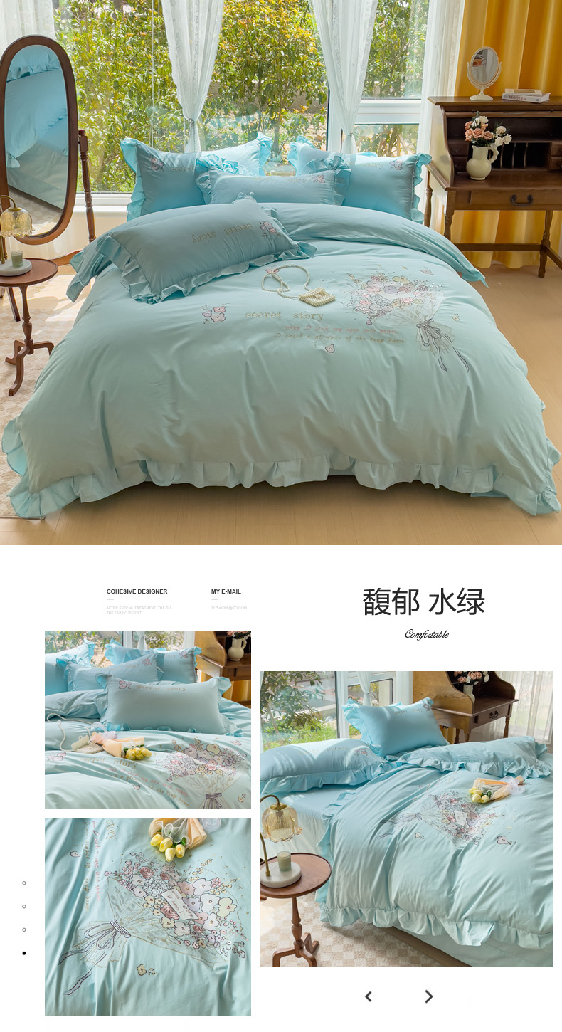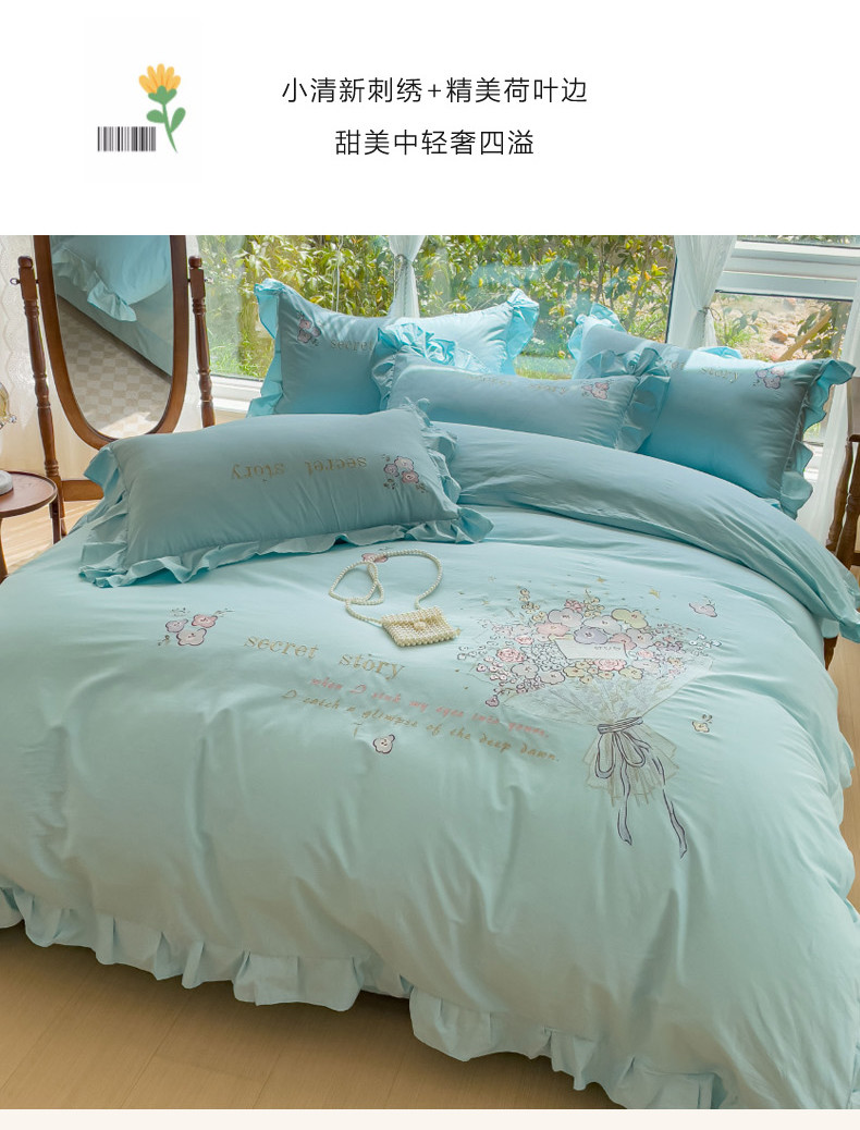 星尚家纺 2024新款全棉水洗棉韩版花边绣花纯棉四件套-馥郁 水绿