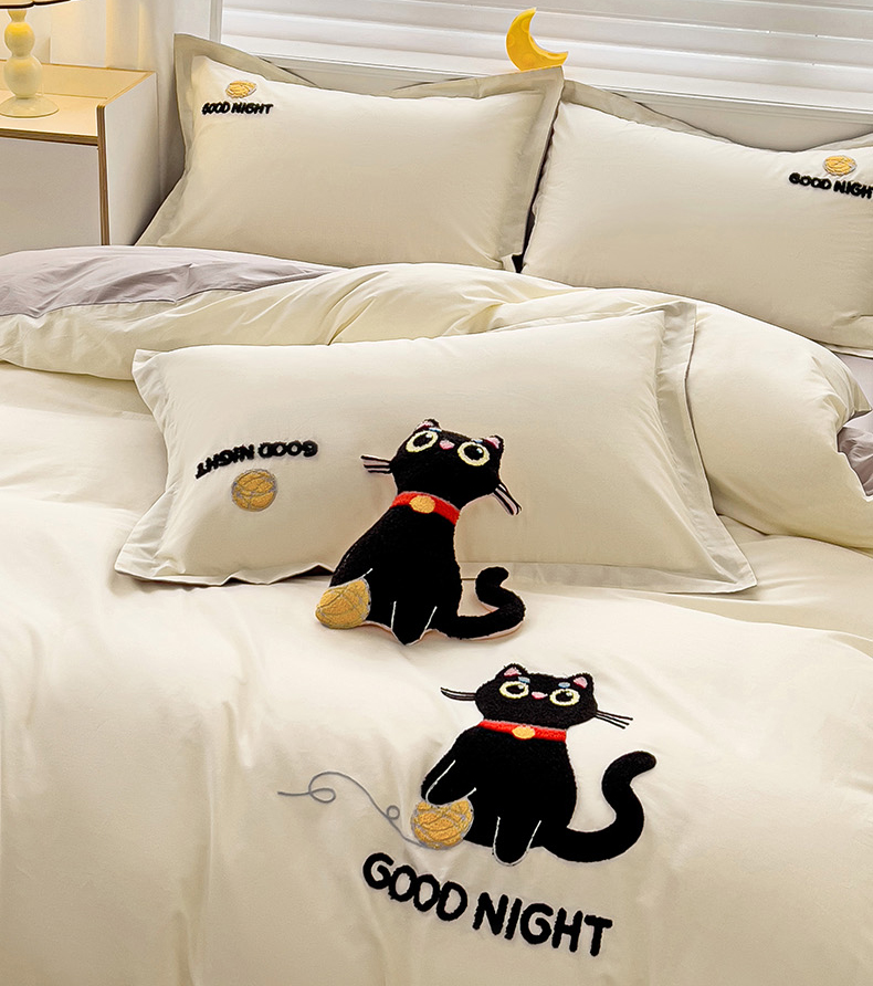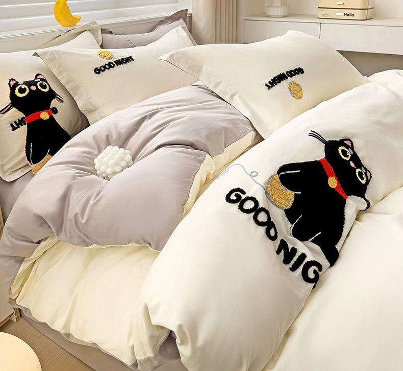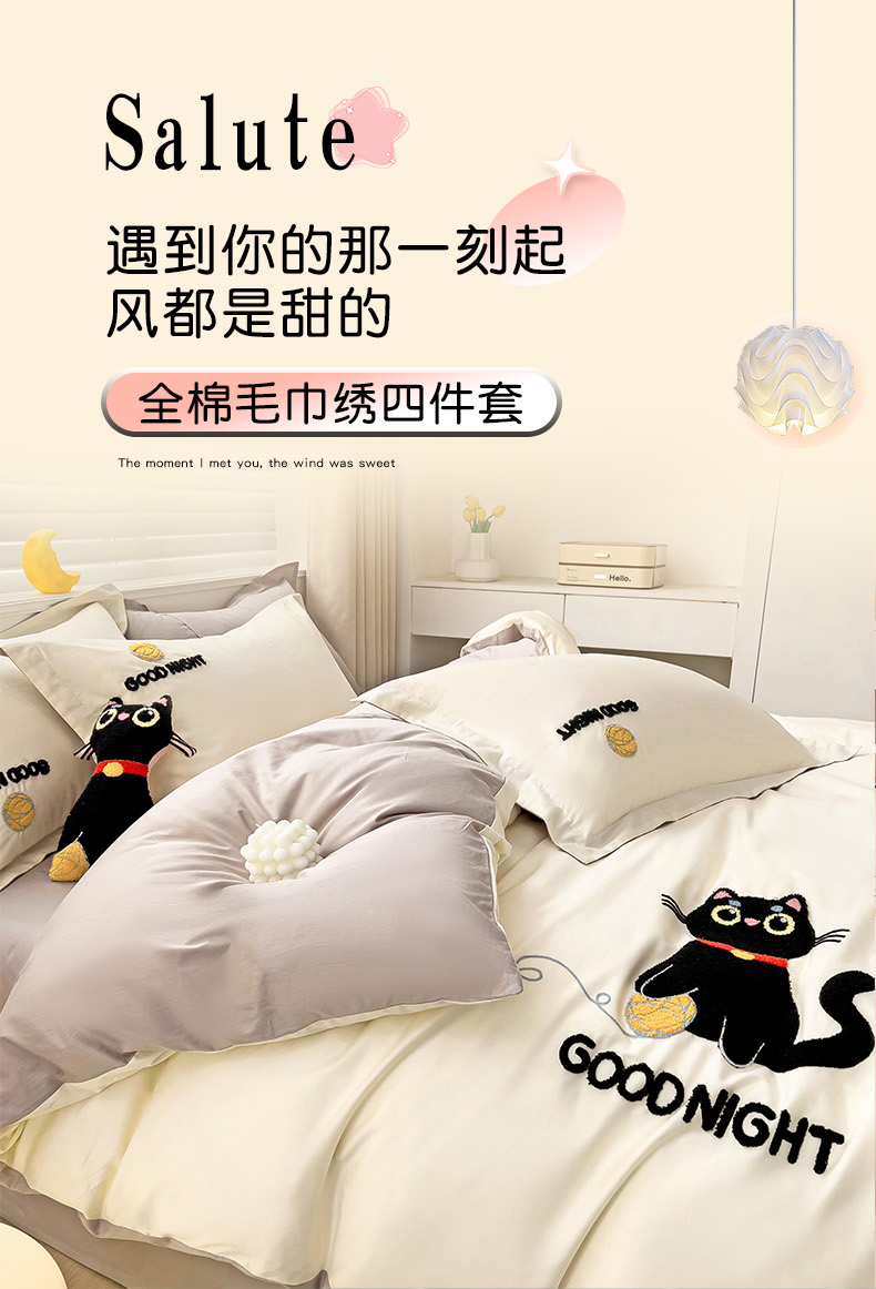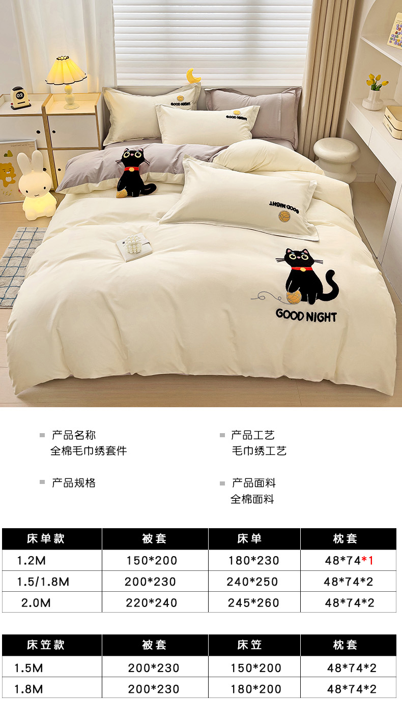 商品名称:娜娜 2024新款全棉亲肤舒适毛巾绣卡通系列四件套 可爱猫咪-奶昔白