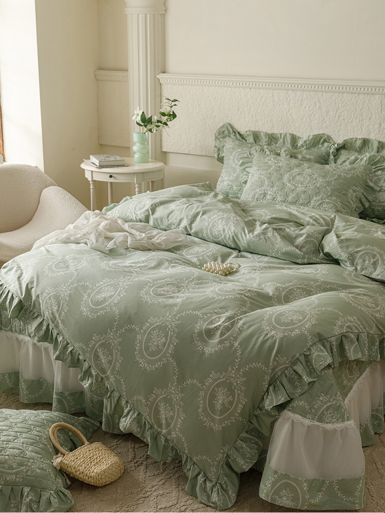 (总)胜权家纺 2025新款全棉13372法式床裙款活性印花四件套,莫妮卡-湖绿,莫妮卡-酒红