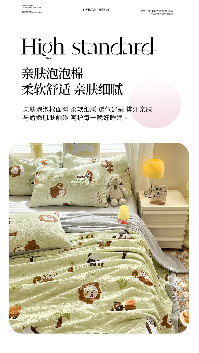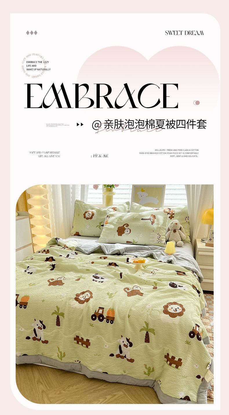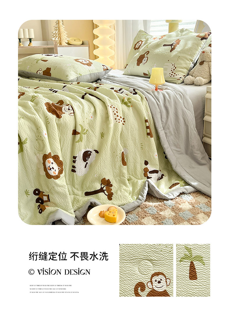 商品名称:妖妖家纺 2024新款有氧水洗泡泡棉印花四套泡芙棉夏被四件套 动物园记