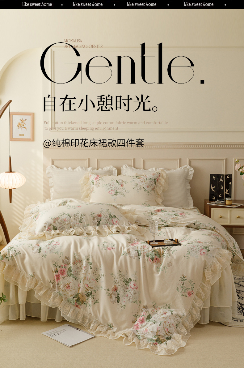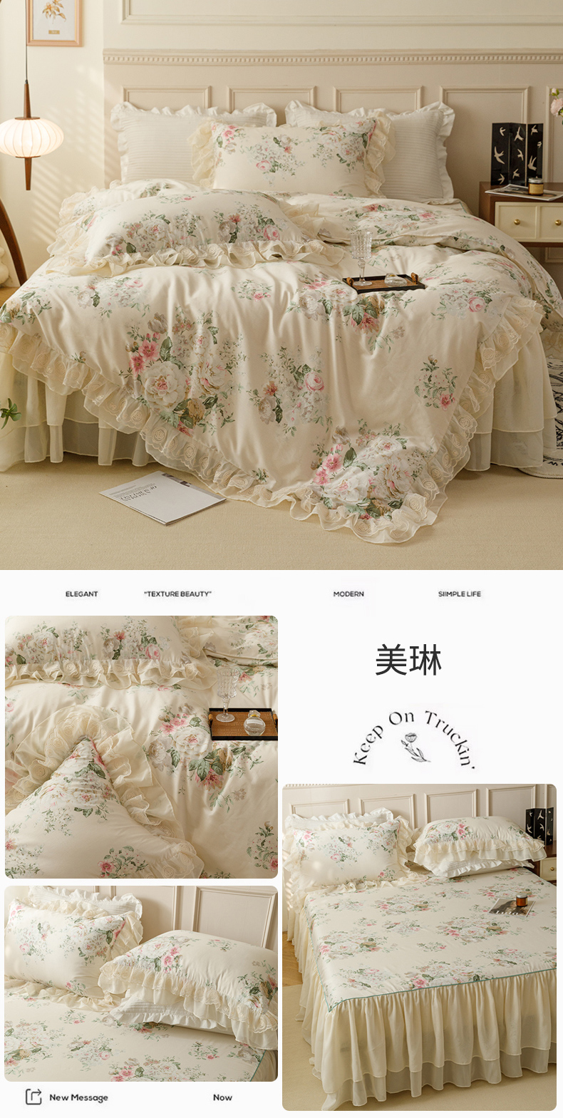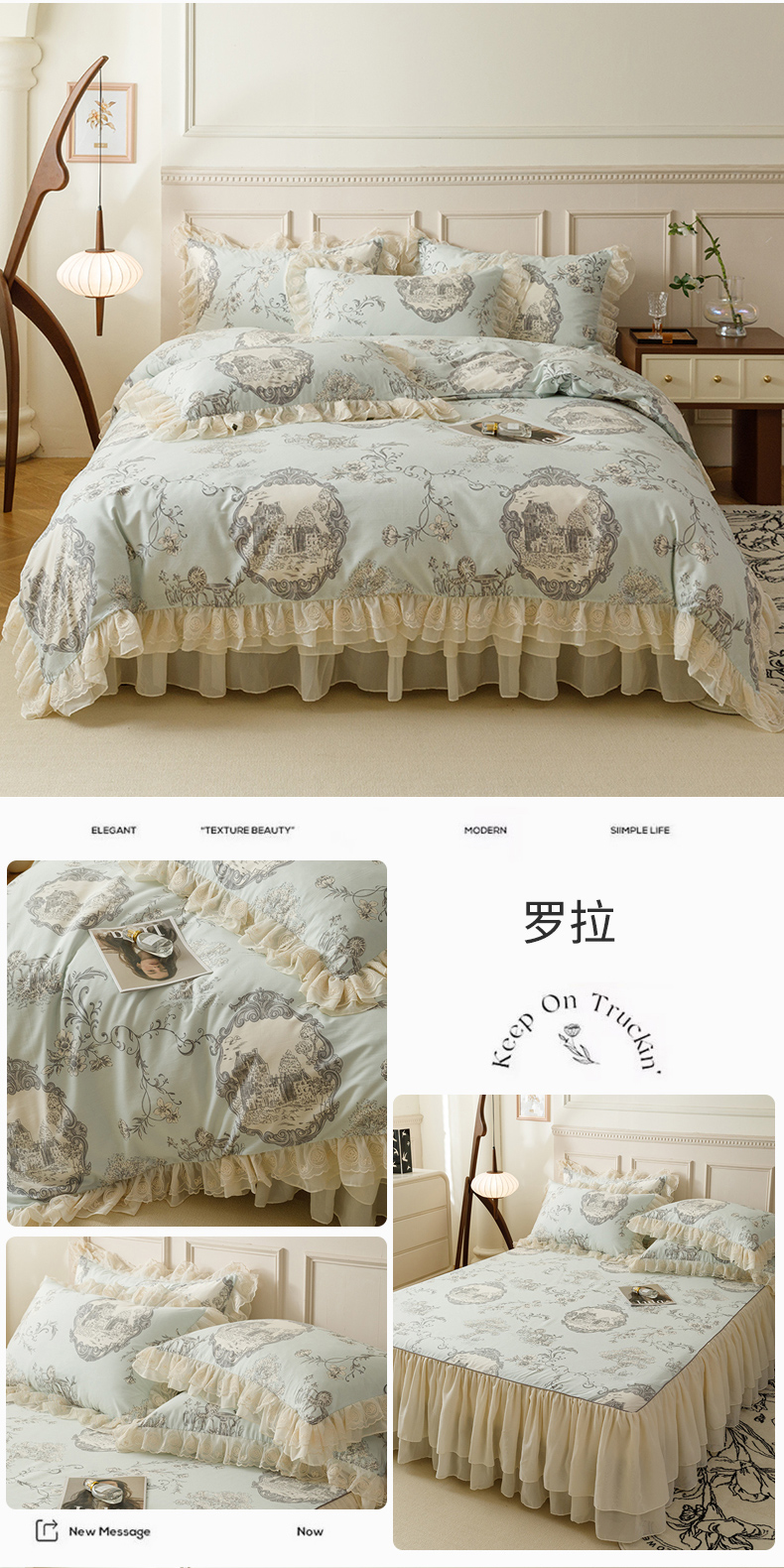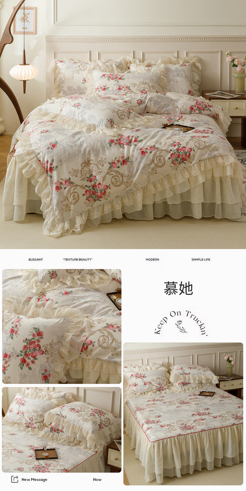 商品名称:(总)菊上家纺 2024新款40s全棉复古法式雪纺蕾丝花边印花床裙款四件套