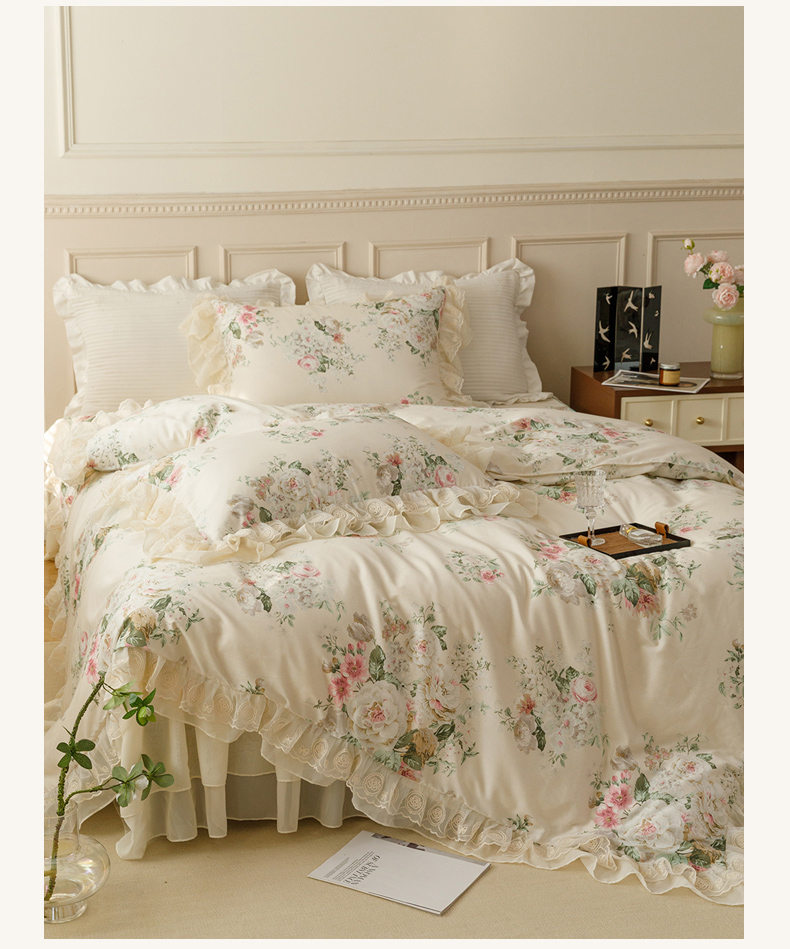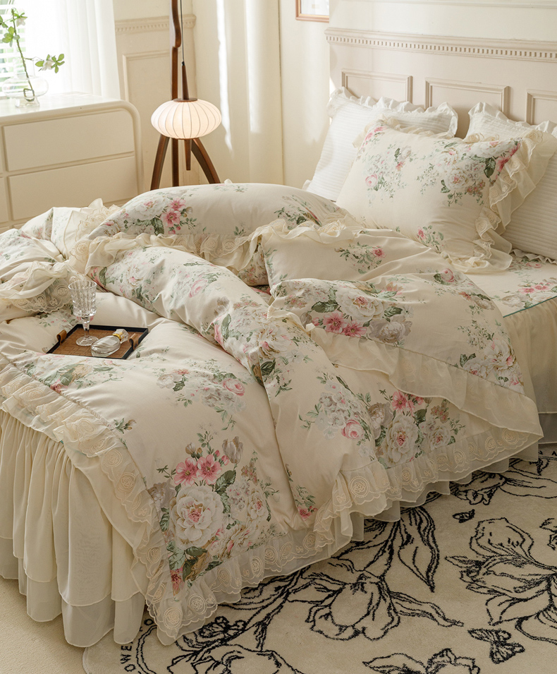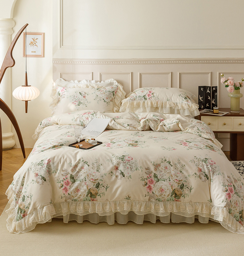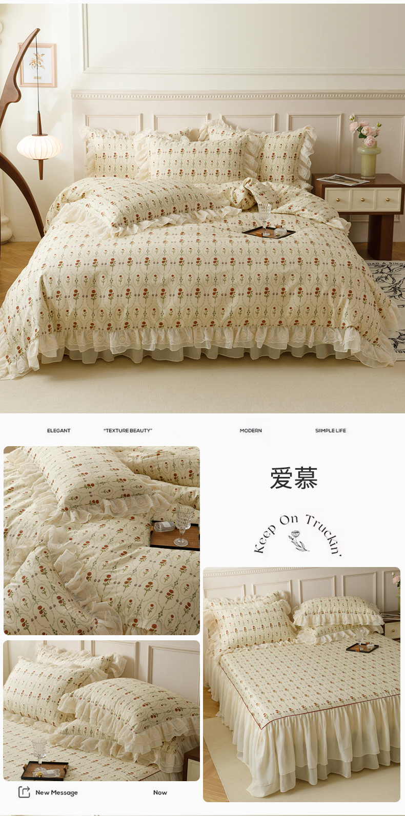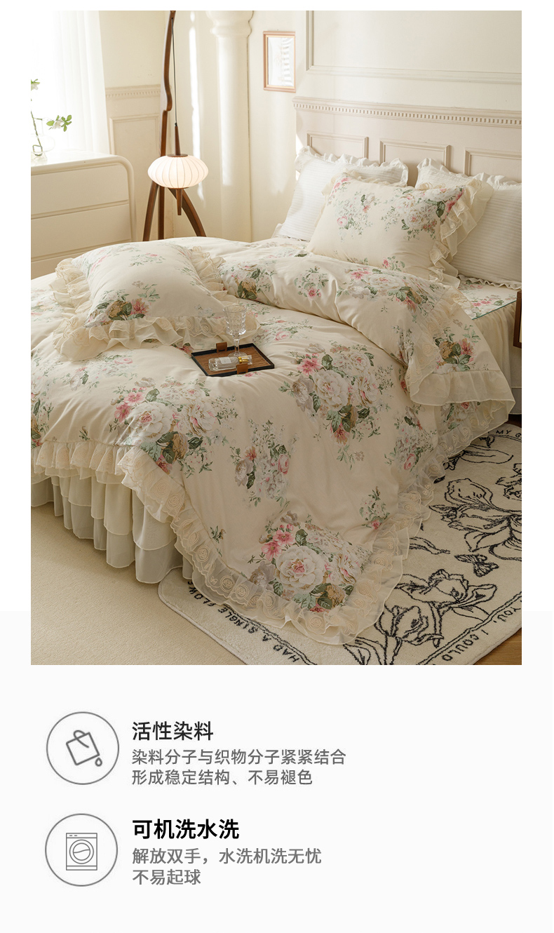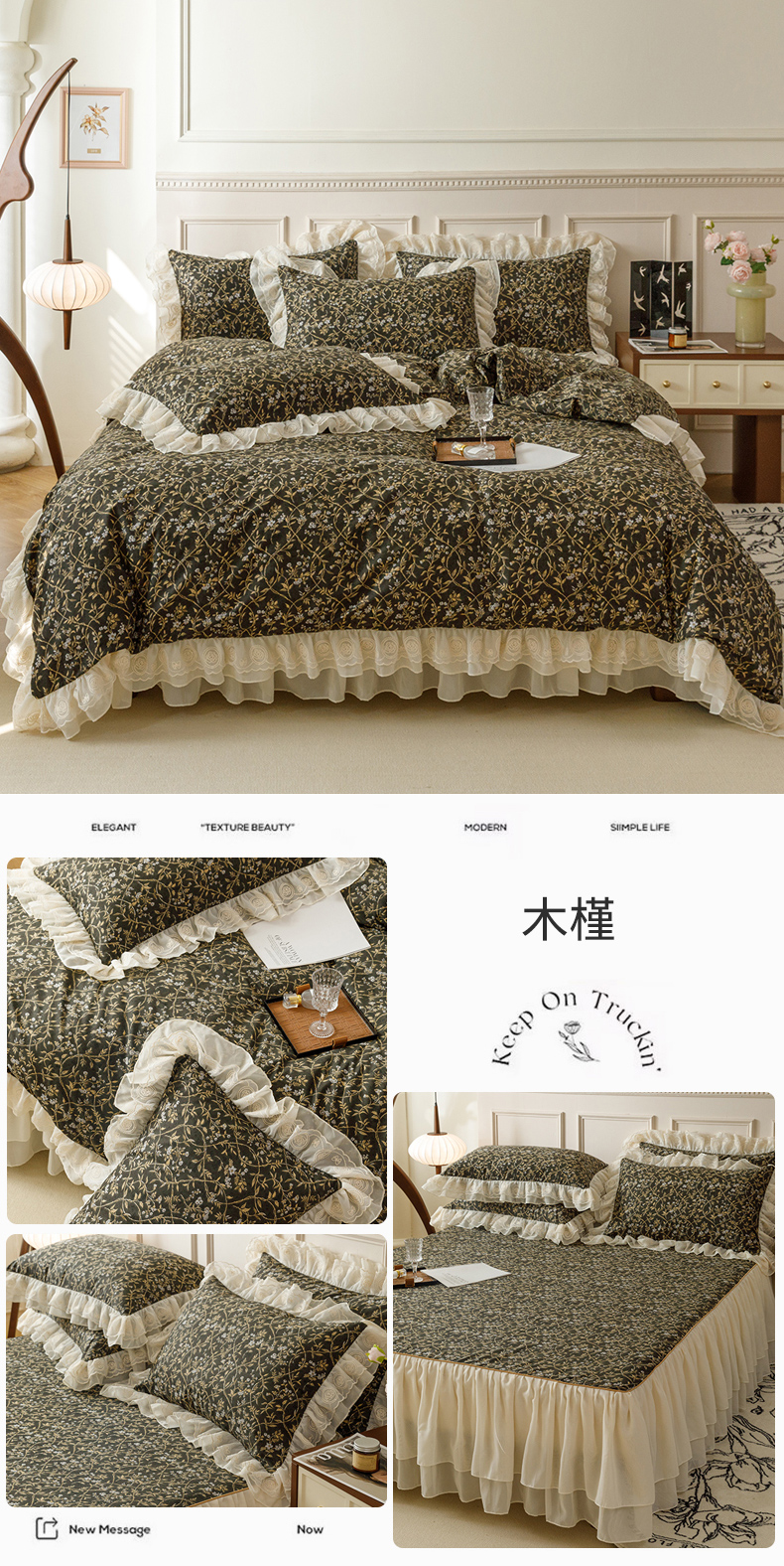 商品名称:(总)菊上家纺 2024新款40s全棉复古法式雪纺蕾丝花边印花床裙款四件套