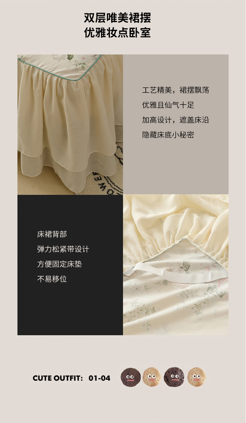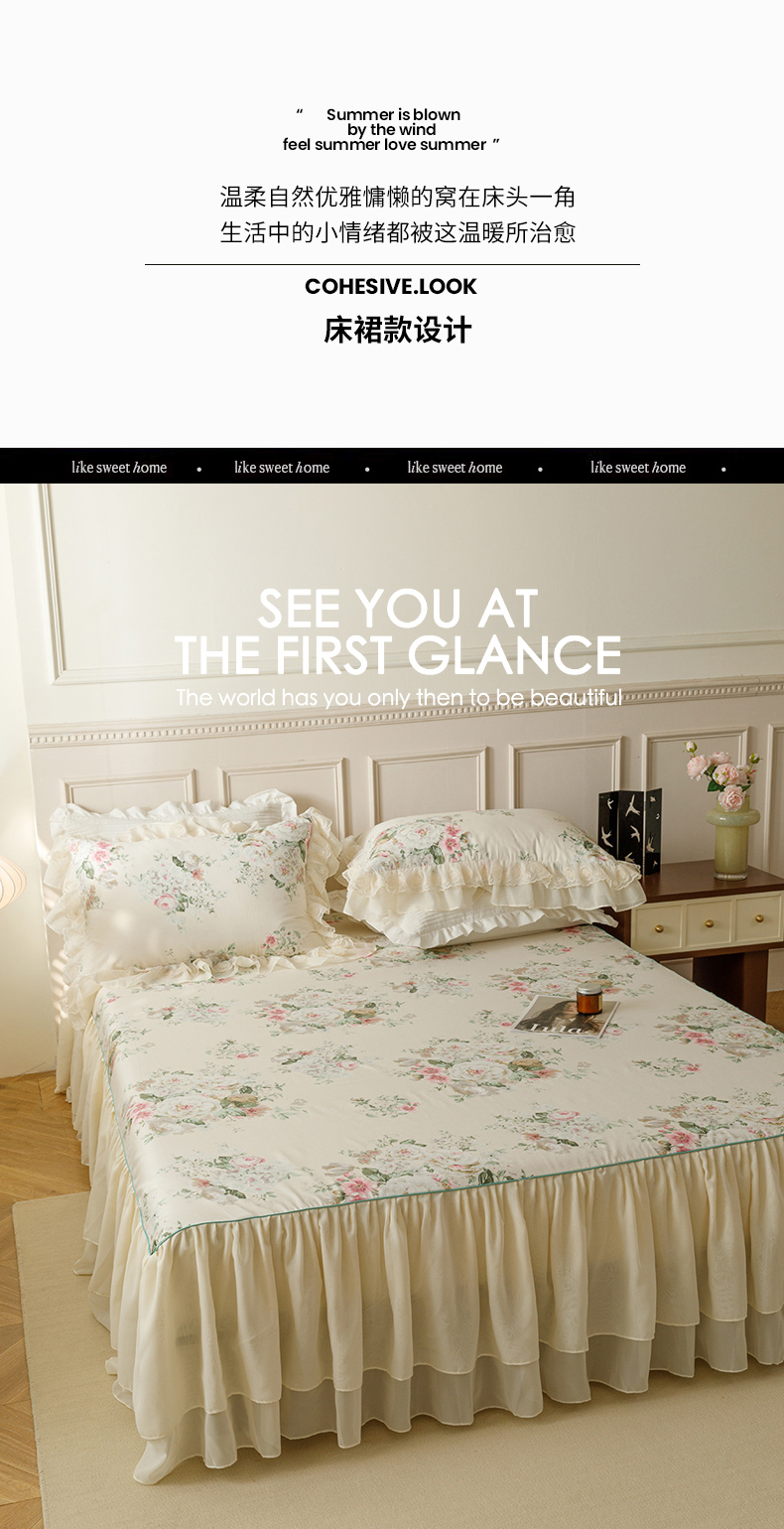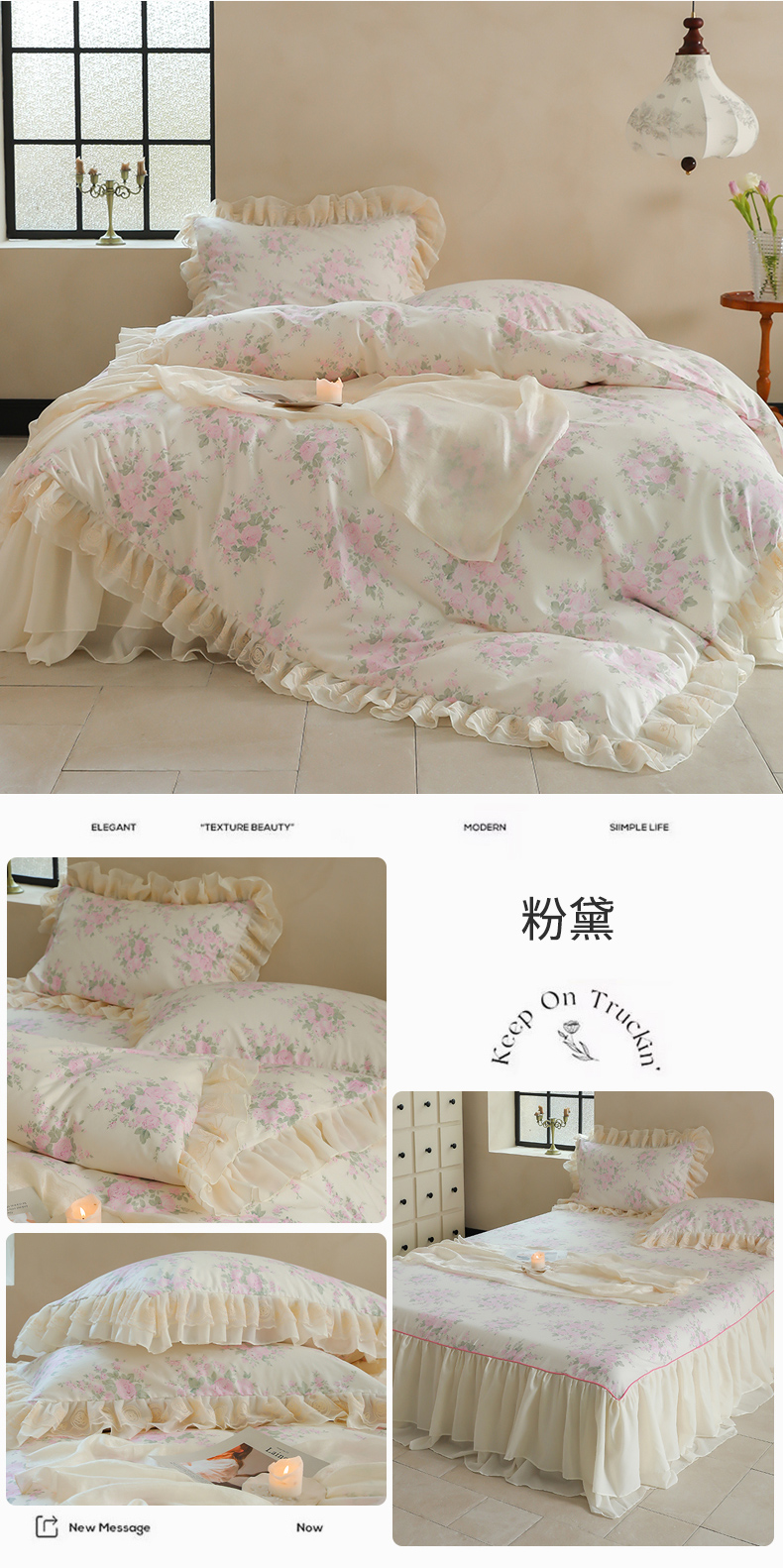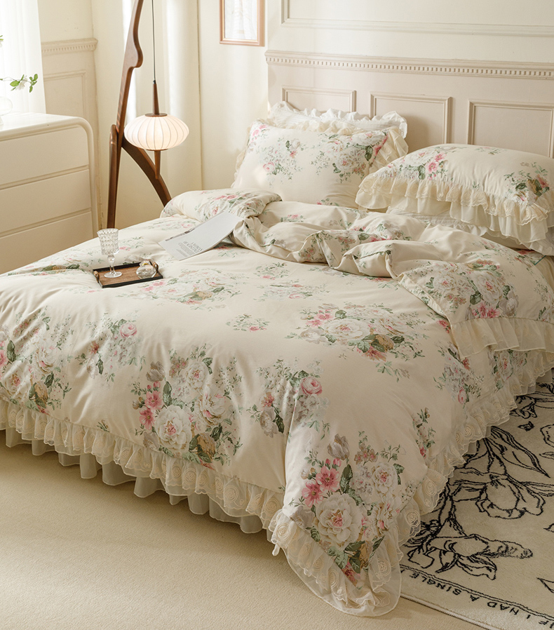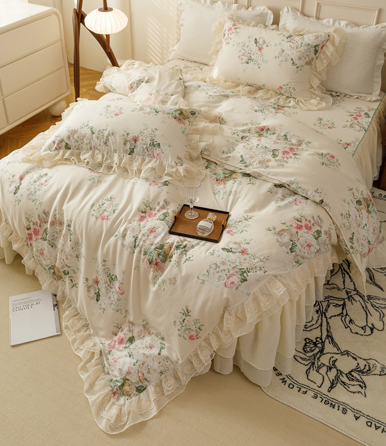 商品名称:(总)菊上家纺 2024新款40s全棉复古法式雪纺蕾丝花边印花床裙款四件套