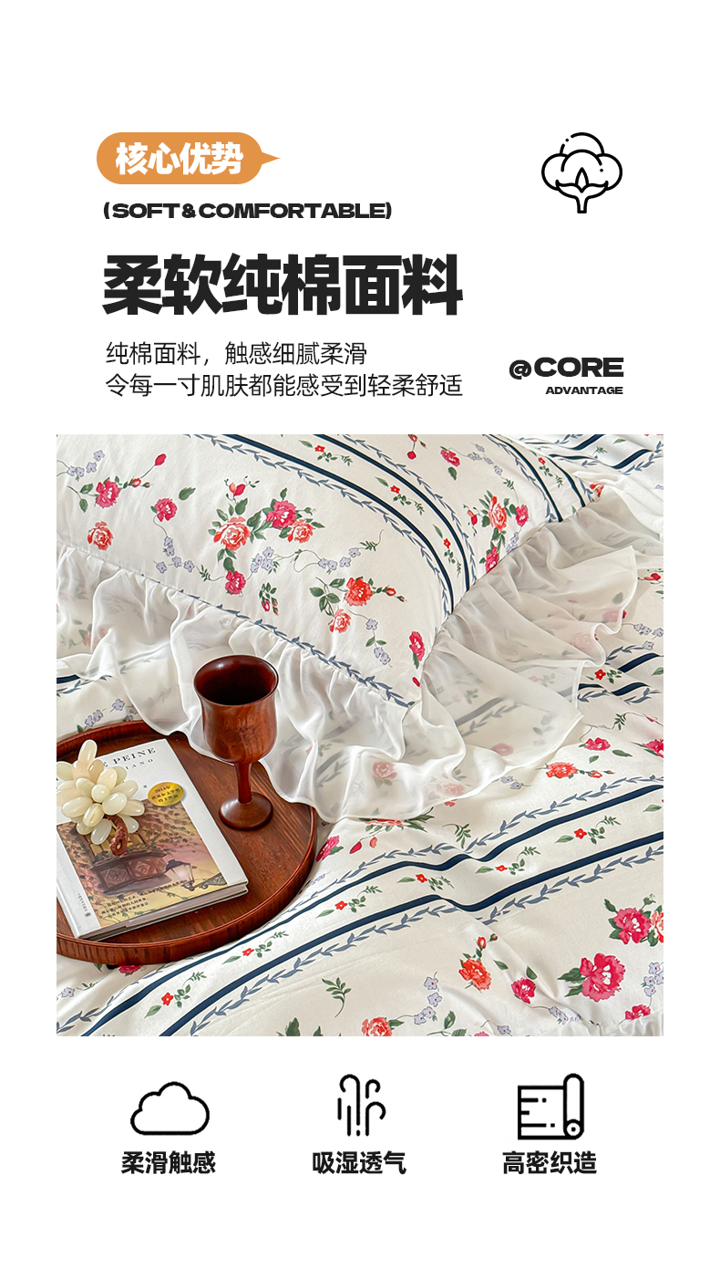 (总)窝米 2025新款数码印花100支长绒棉纯棉工艺花边款四件套-晚意,晚意