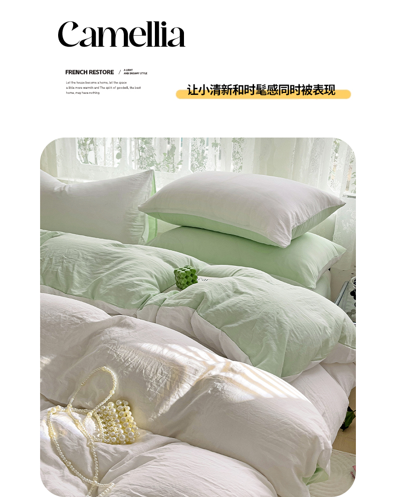 商品名称:韩巢家纺 2024新款ins风超柔褶皱亲肤水洗棉被套单件-纯色双拼系列(提供卖家秀) 水洗棉白绿
