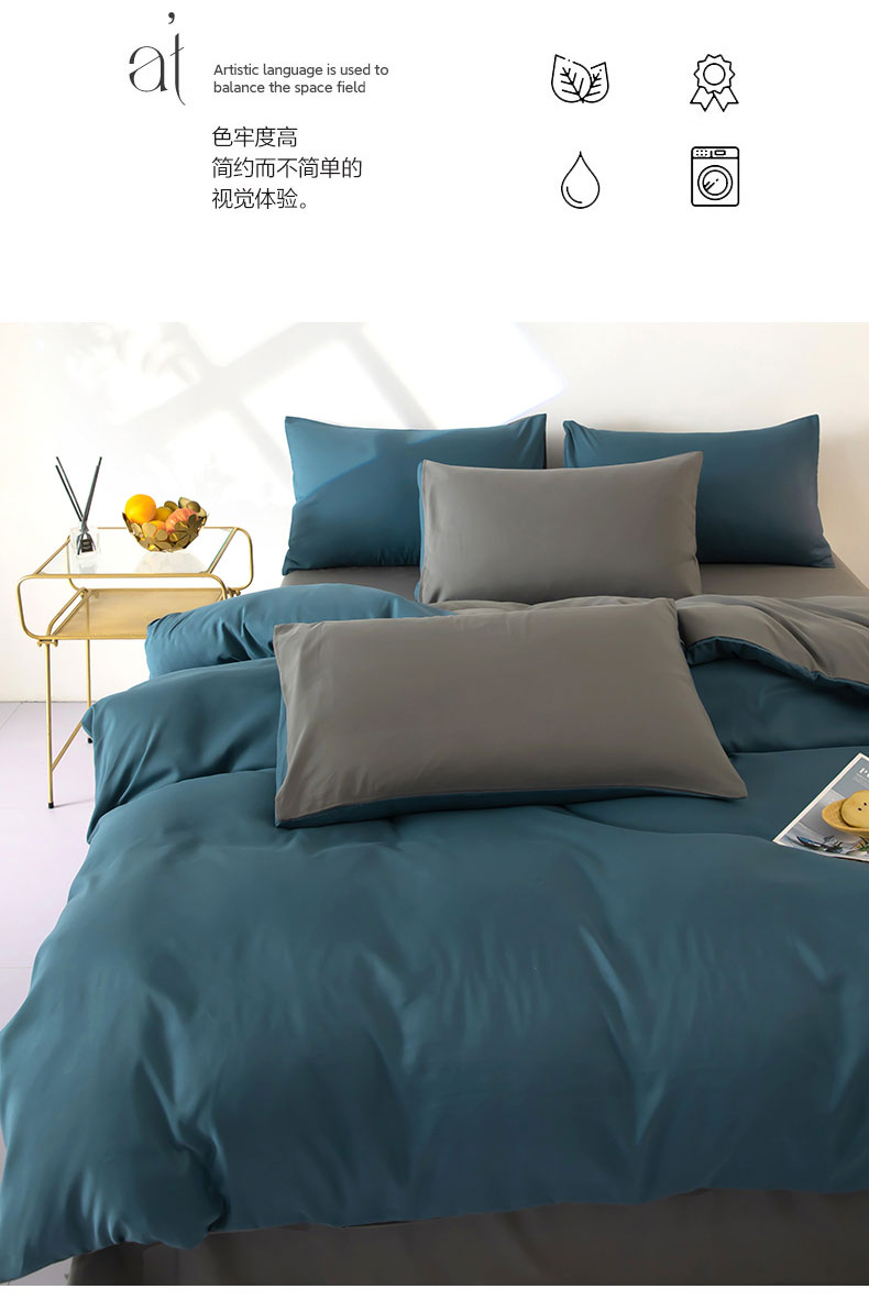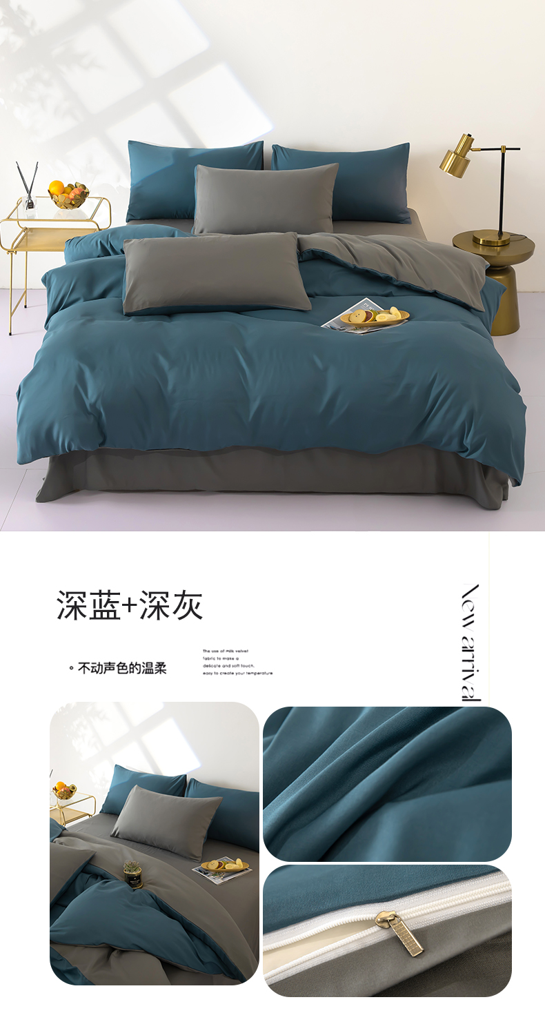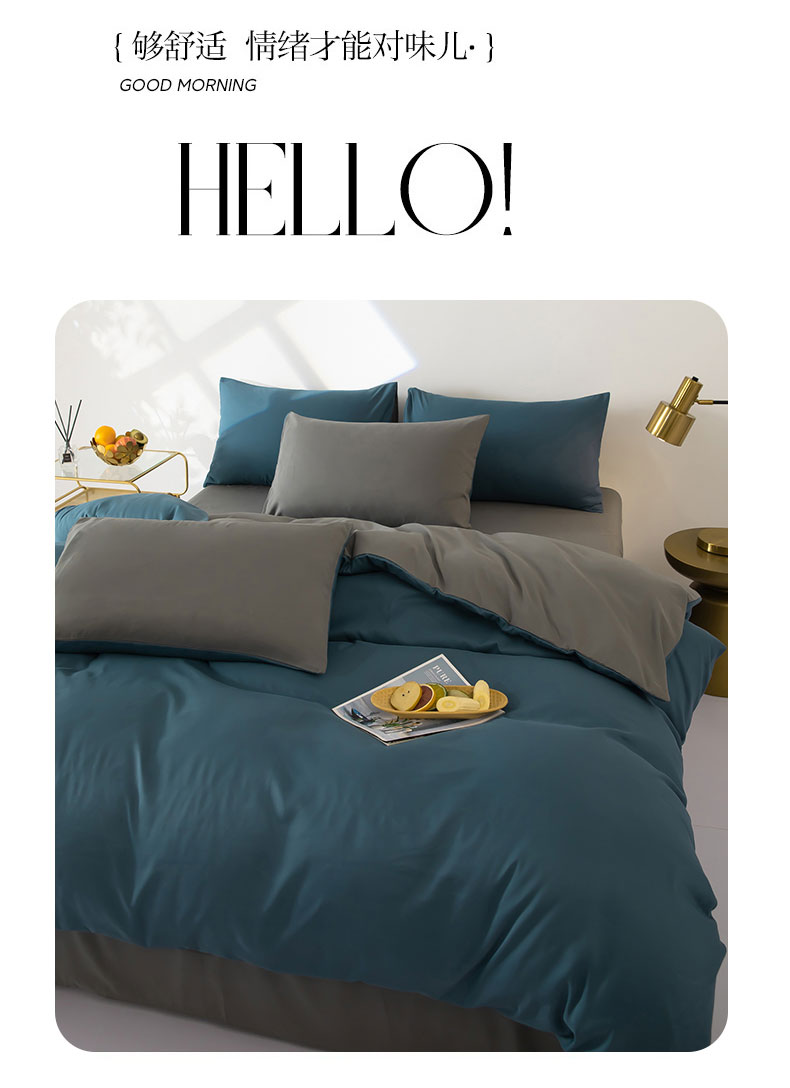 商品名称:梦莱家纺 2024新款亲肤磨毛纯色拼色轻奢系列四件套 深蓝+深灰