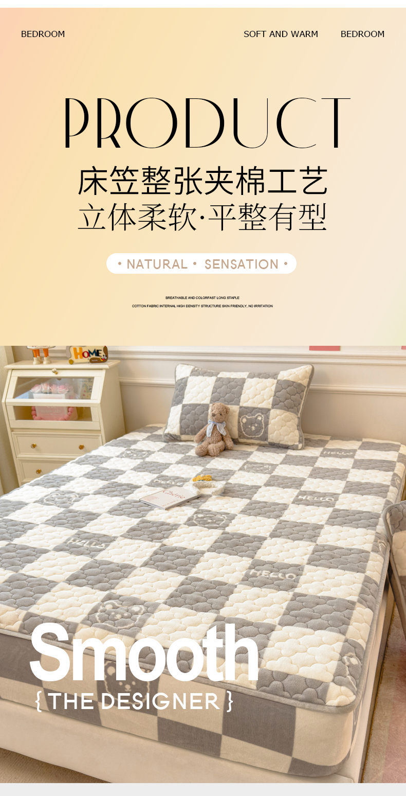 丝羽坊 2024新款A类加厚牛奶绒夹棉床笠 格子小熊