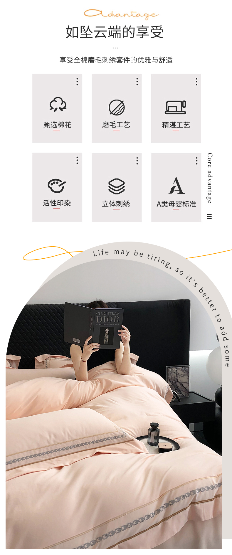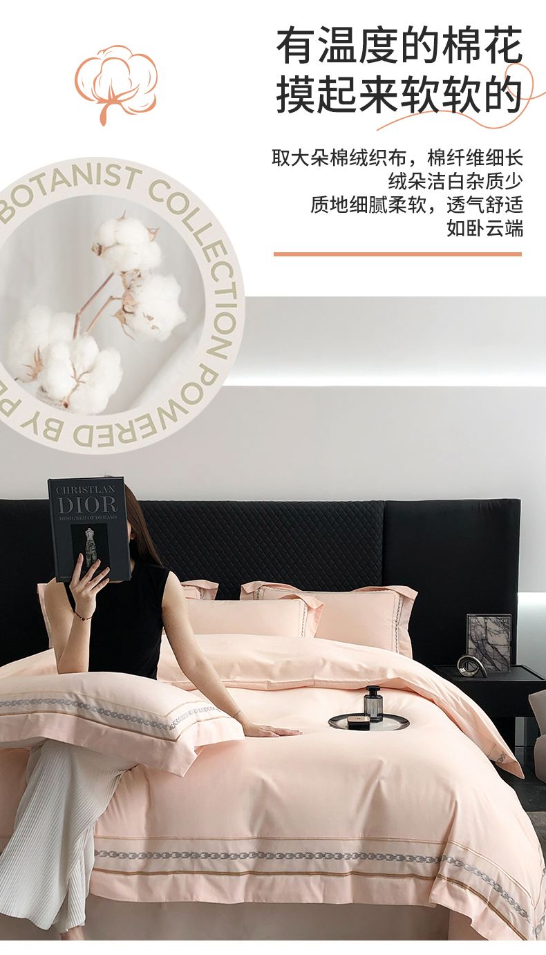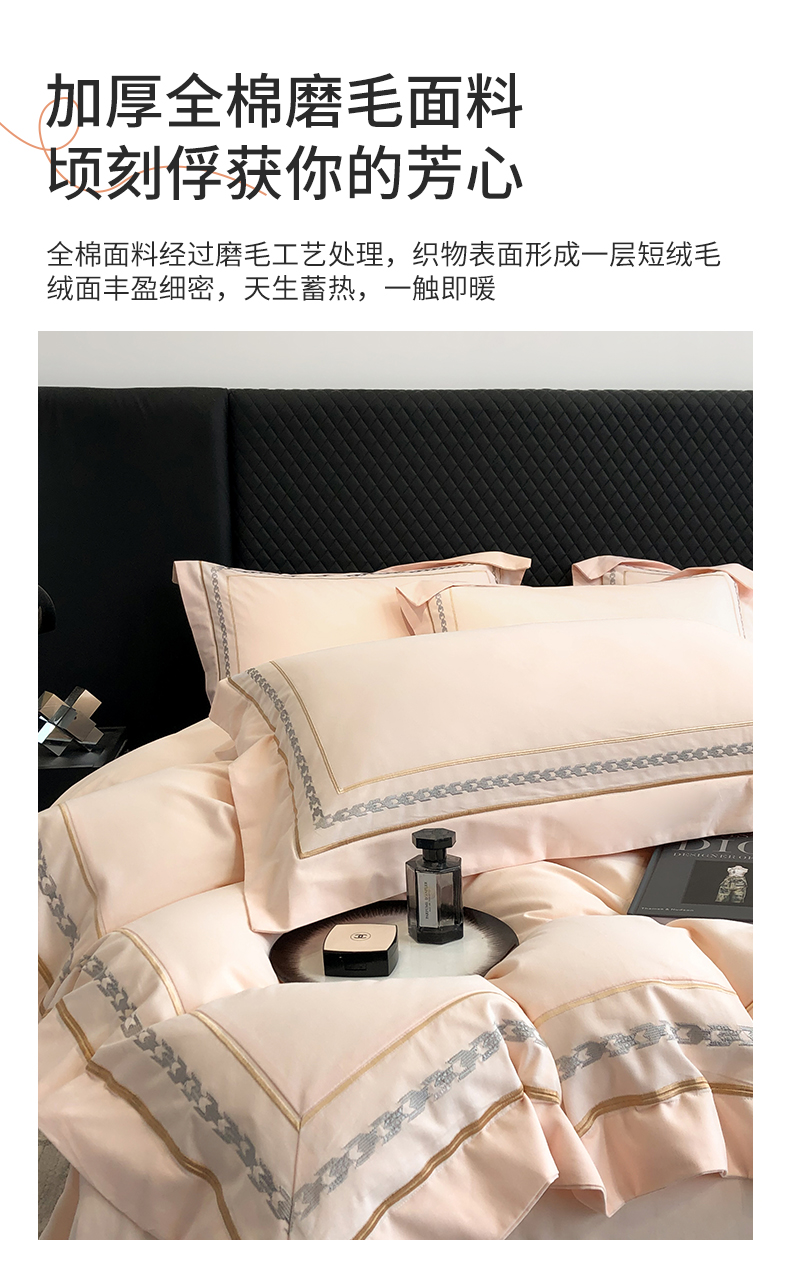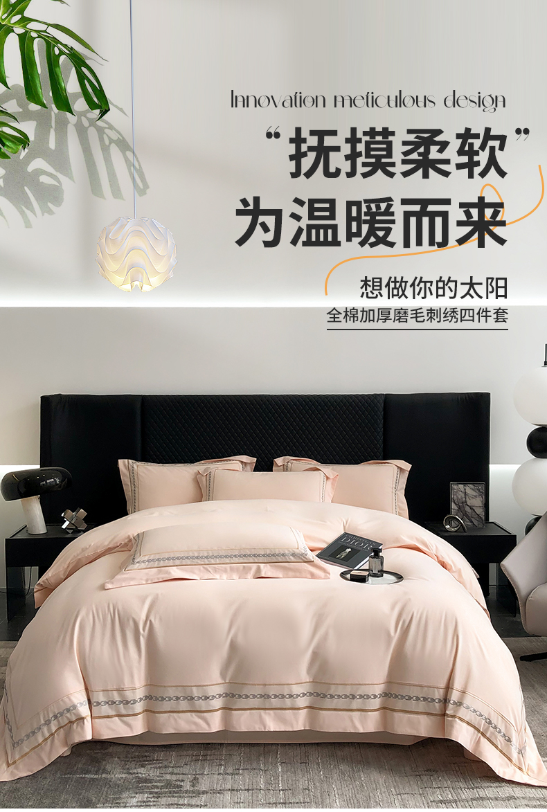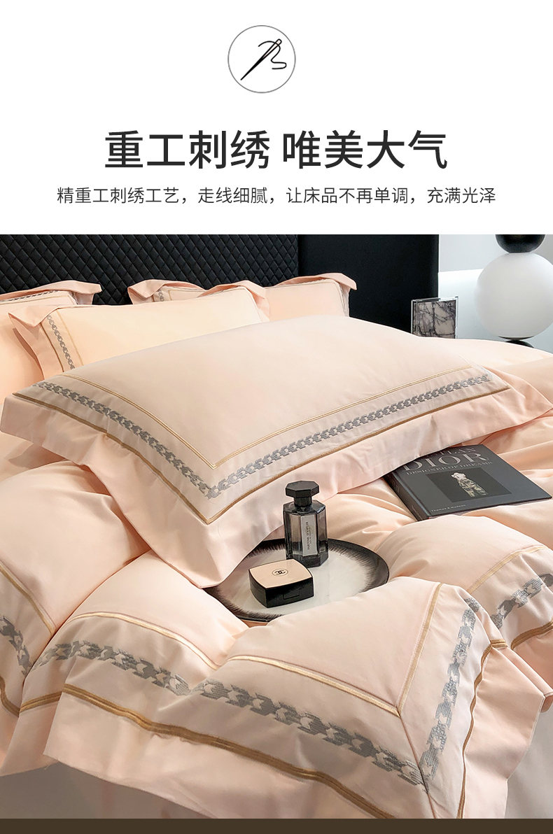 商品名称:家居1号家纺 2024新款加厚全棉磨毛宽边刺绣拼角四件套-维多利 维多利 奶桃色
