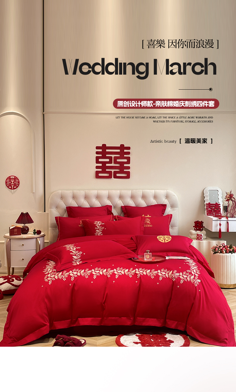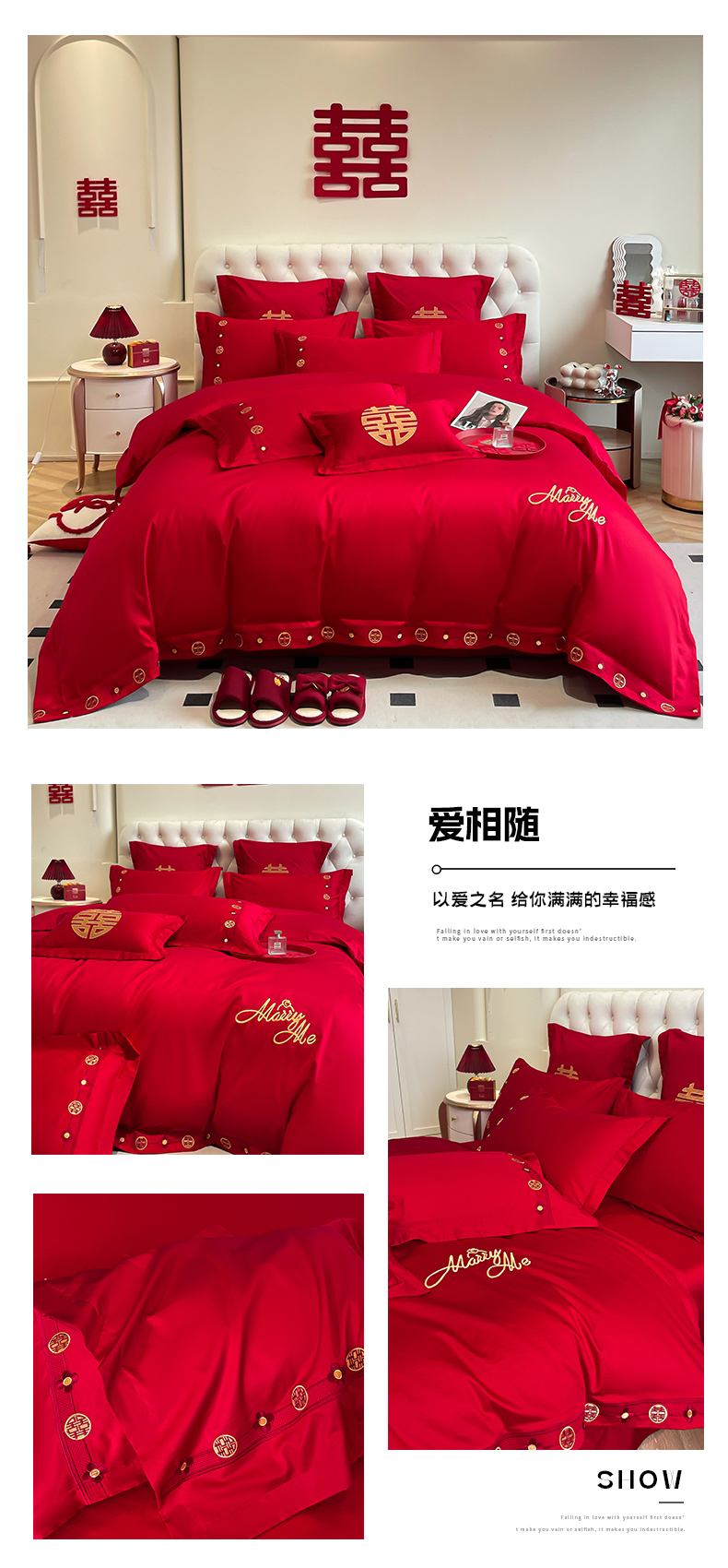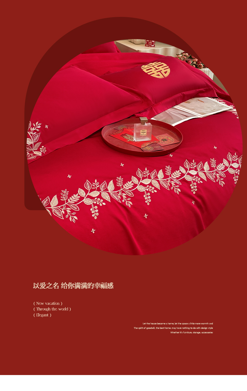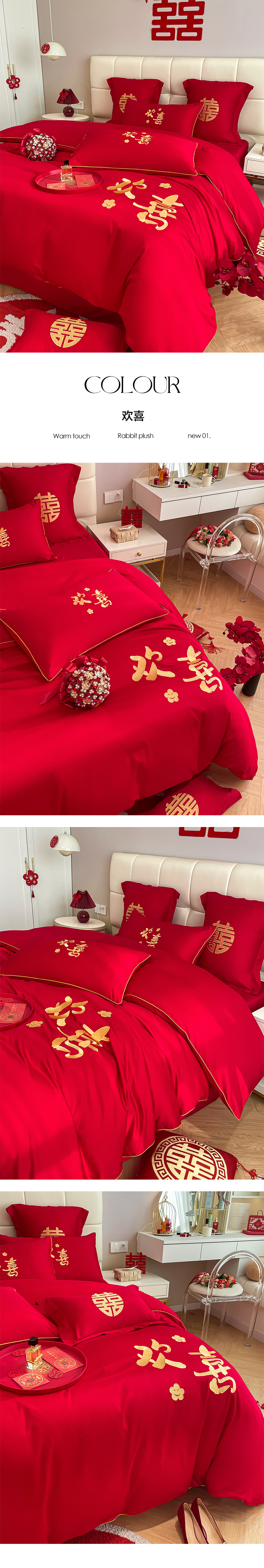 (总)欧乐蒂 2025新款婚庆款牛奶绒刺绣系列四件套-爱相随,爱相随-喜红,爱相随-金