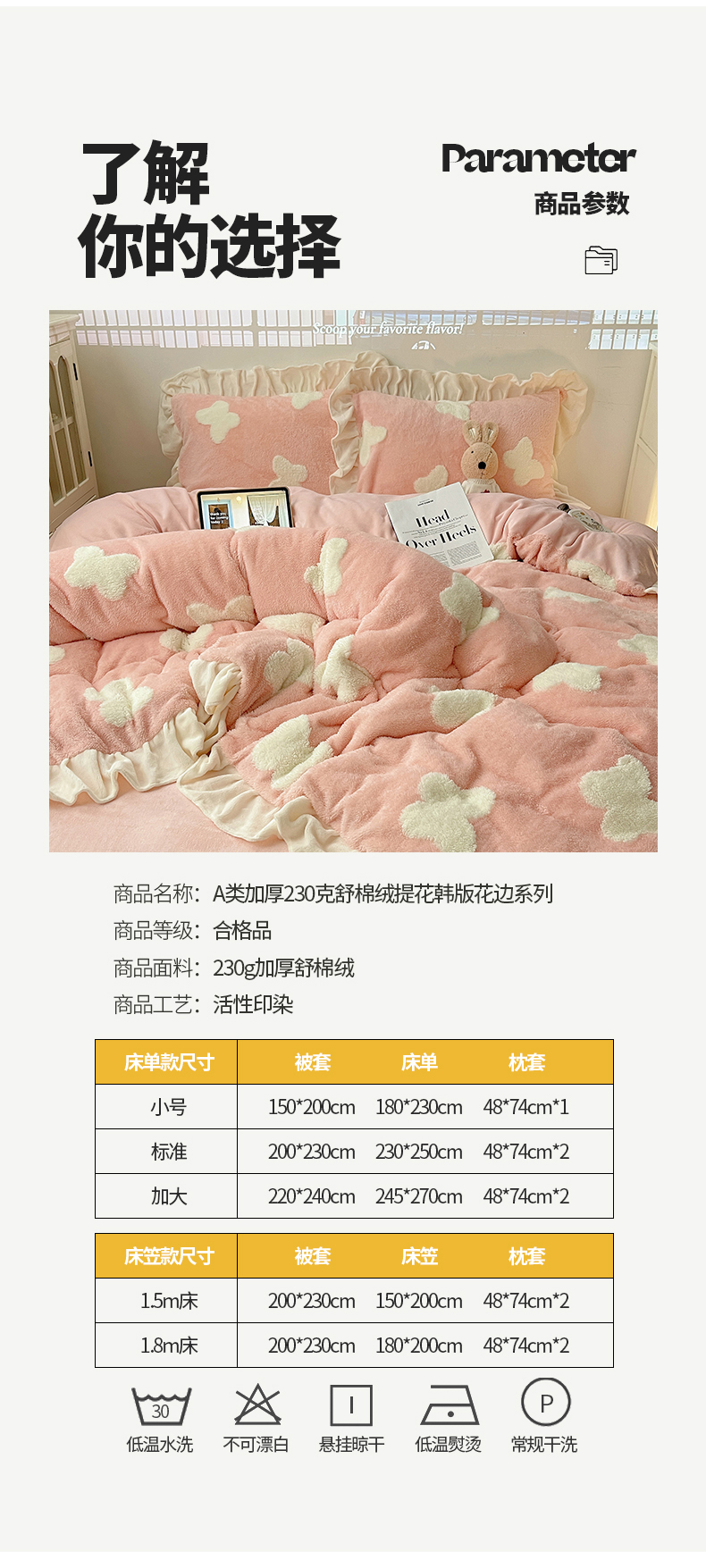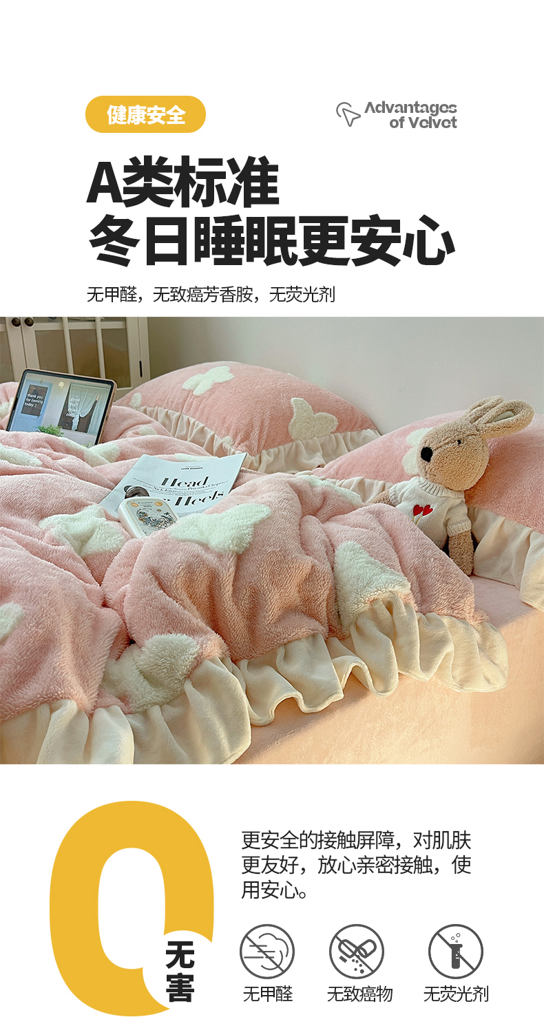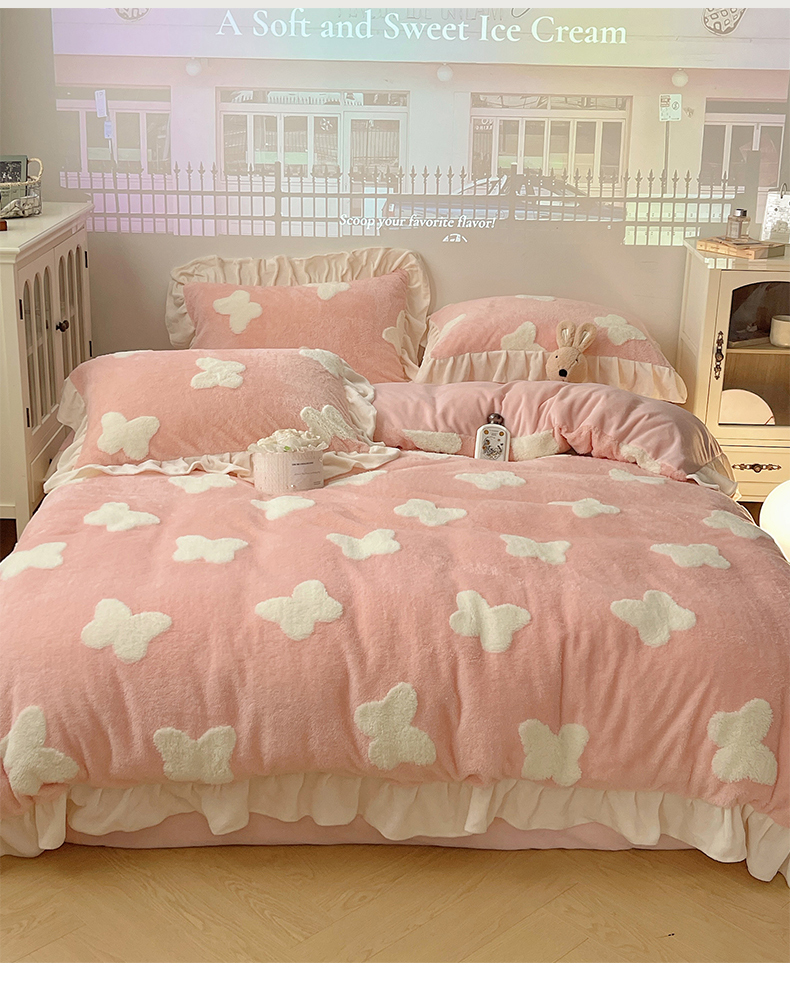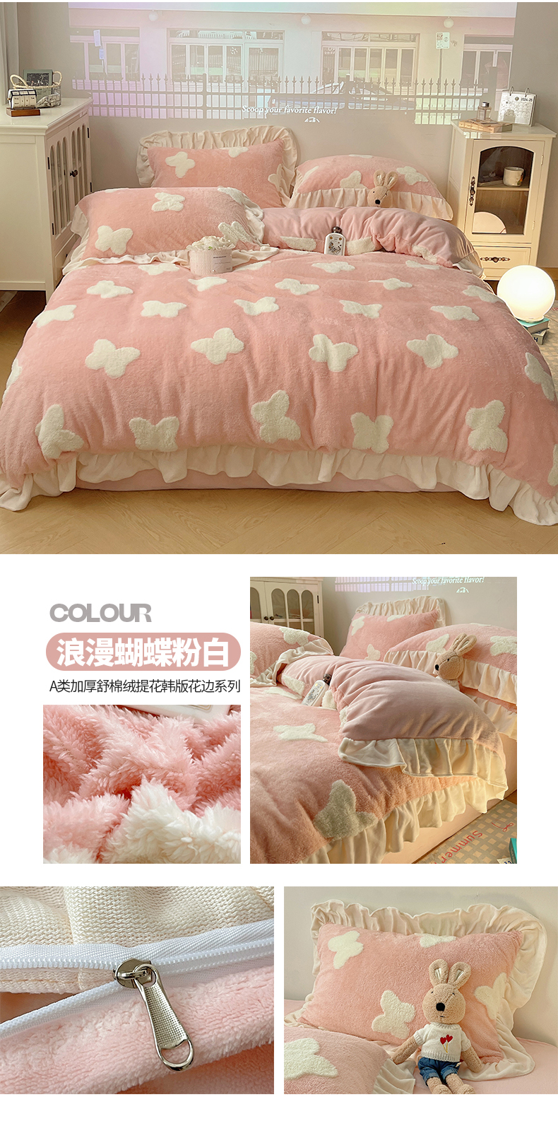当前位置: 91家纺网 > 商品网购 > 床品套件 > 四件套 > 牛奶绒四件套 > 桃子家居 2024新款A类加厚230克色纱提花蝴蝶少女花花韩版花边舒棉绒牛奶绒系列四件套 舒棉绒花边-浪漫蝴蝶粉白