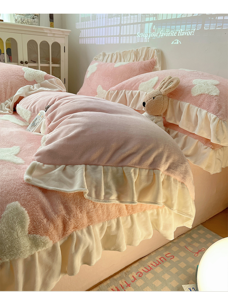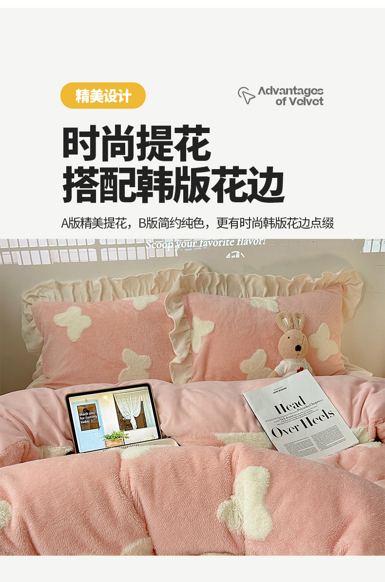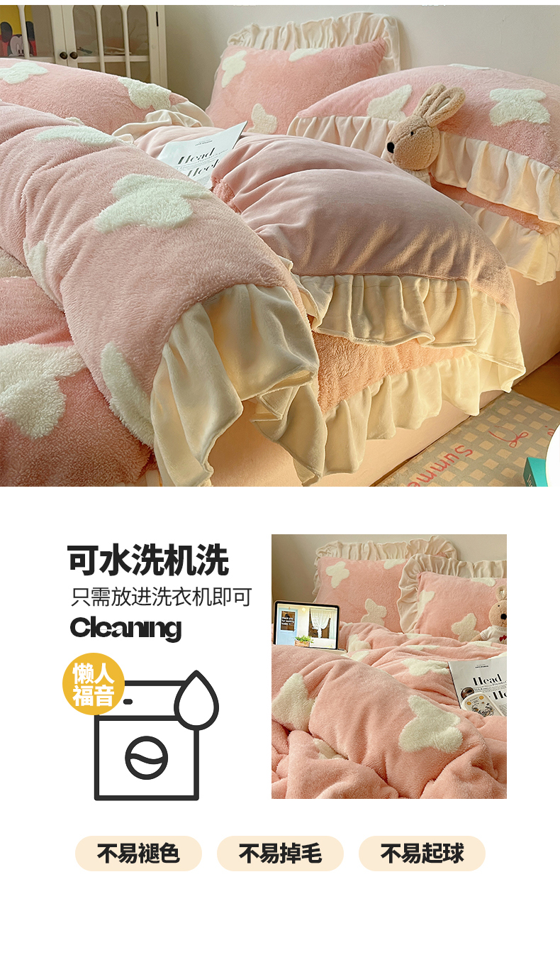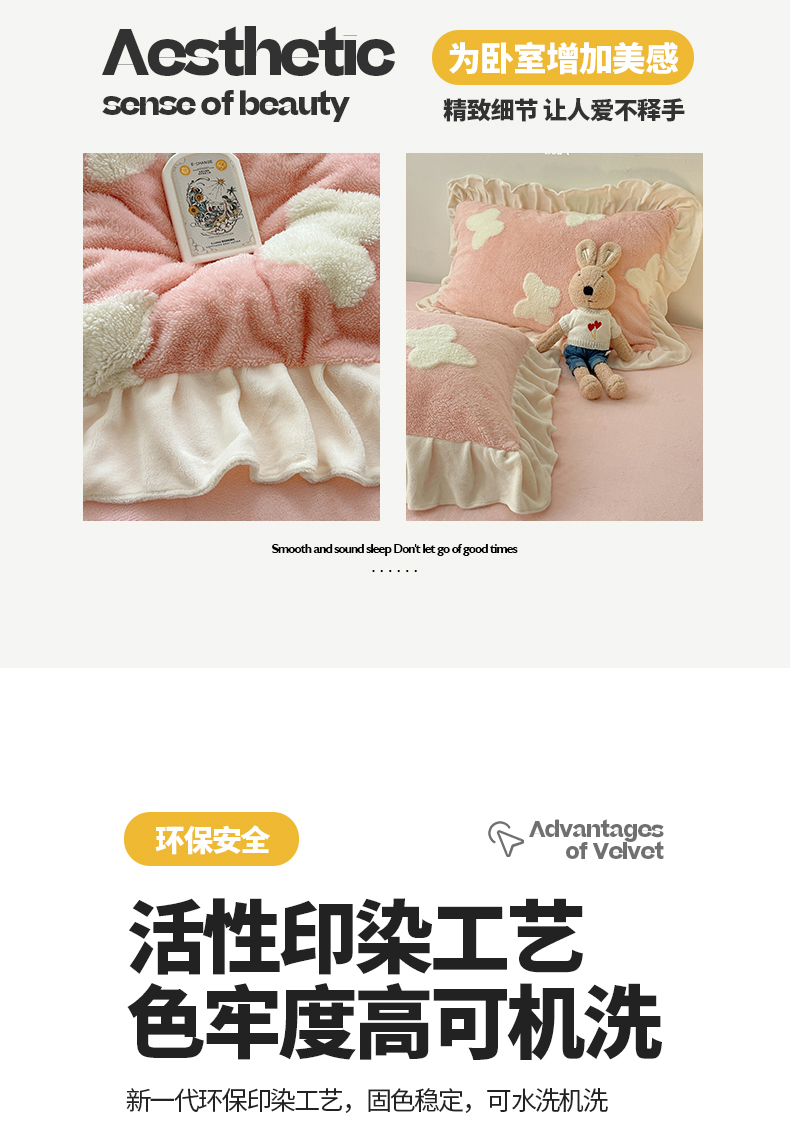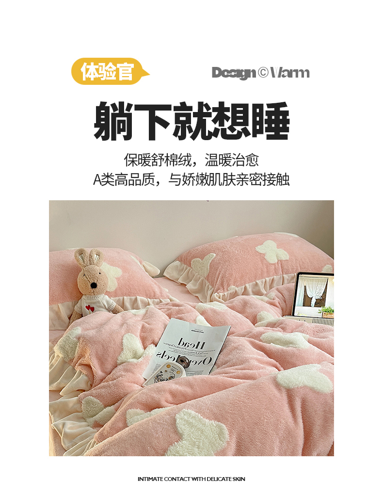 当前位置: 91家纺网 > 商品网购 > 床品套件 > 四件套 > 牛奶绒四件套 > 桃子家居 2024新款A类加厚230克色纱提花蝴蝶少女花花韩版花边舒棉绒牛奶绒系列四件套 舒棉绒花边-浪漫蝴蝶粉白