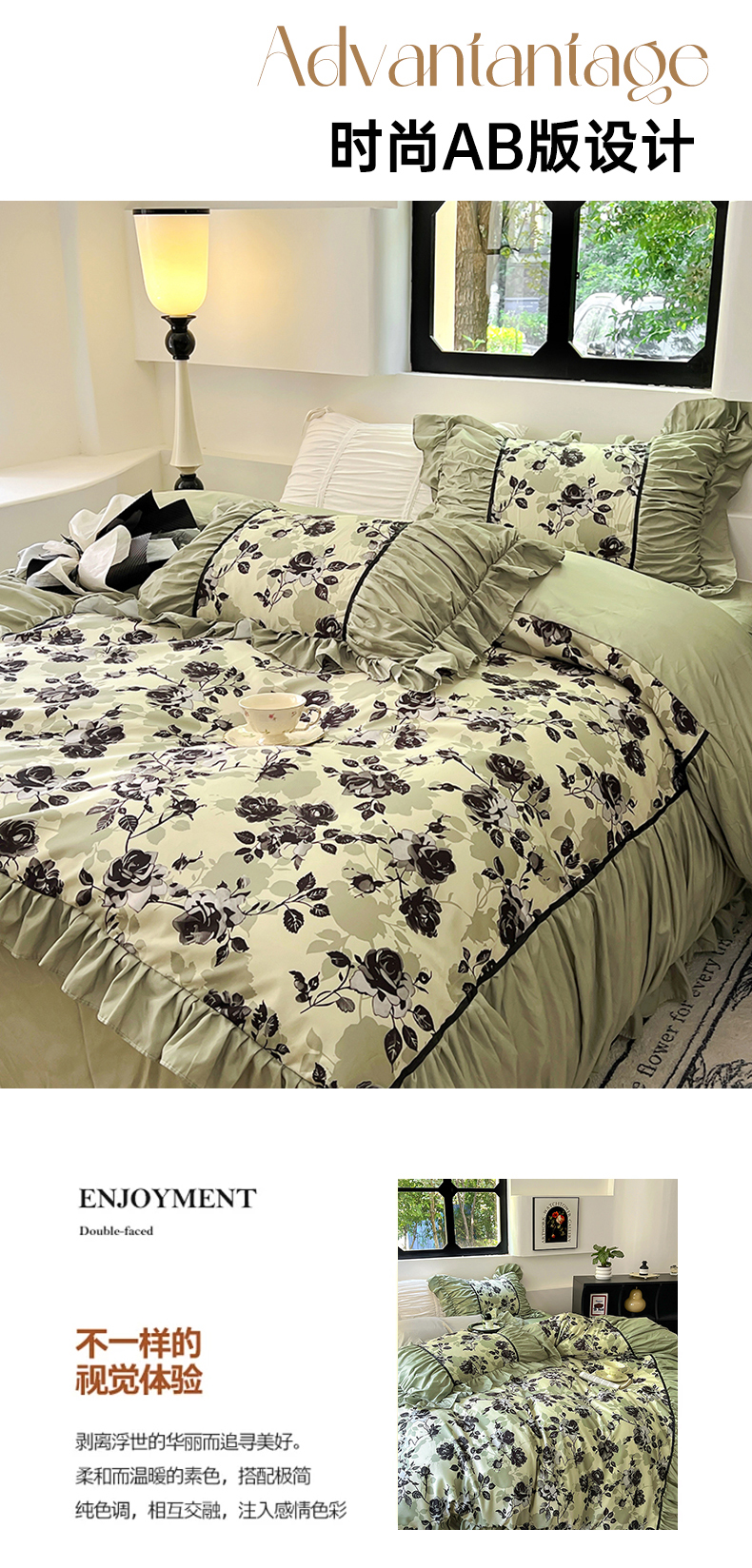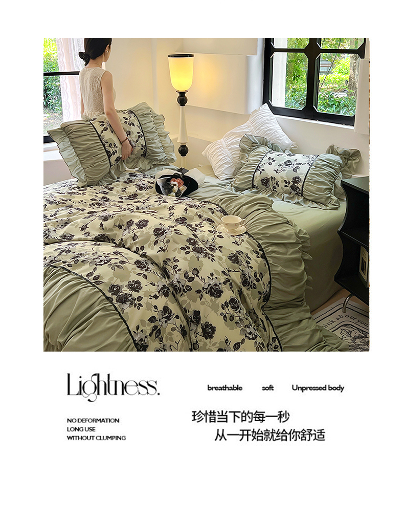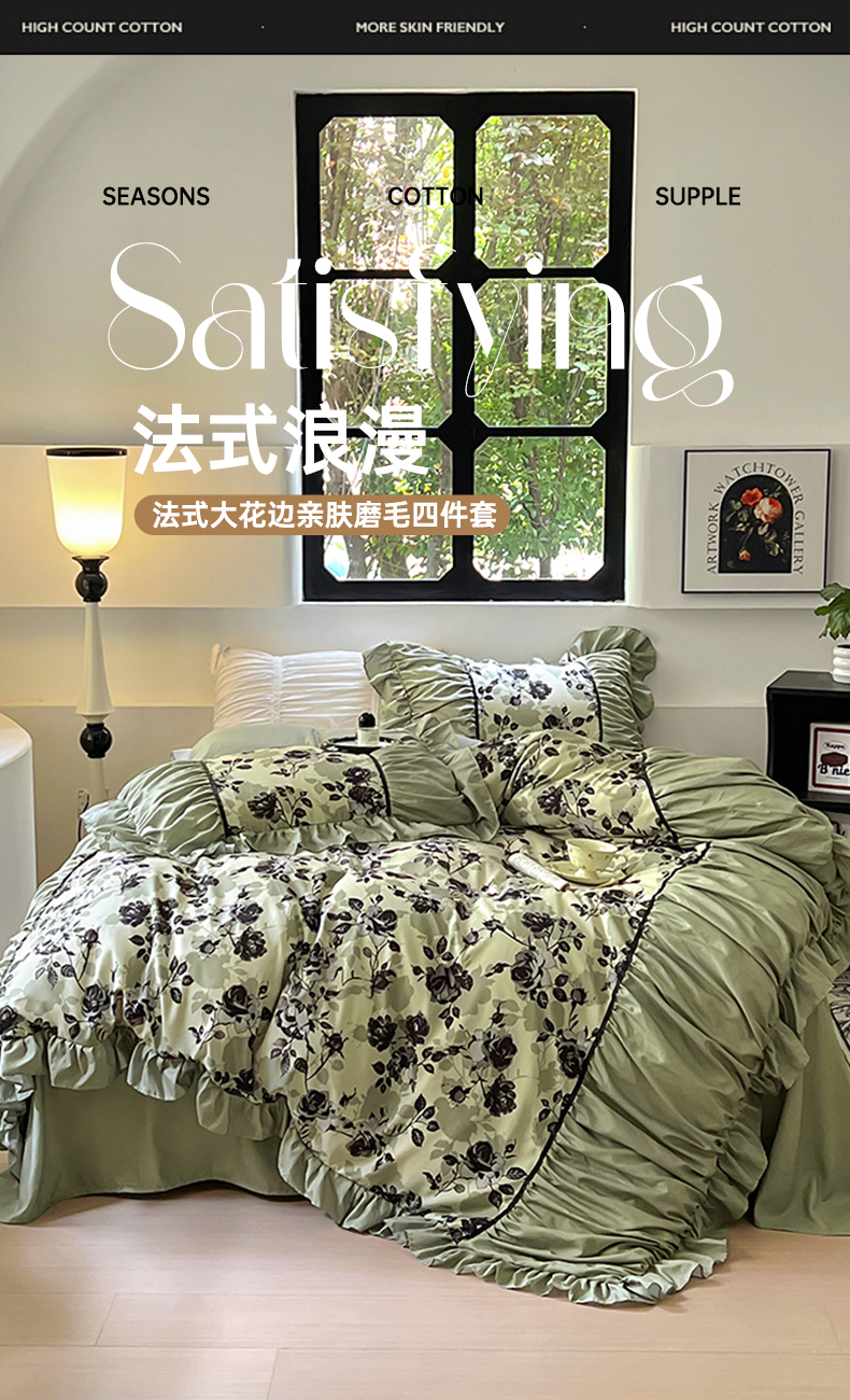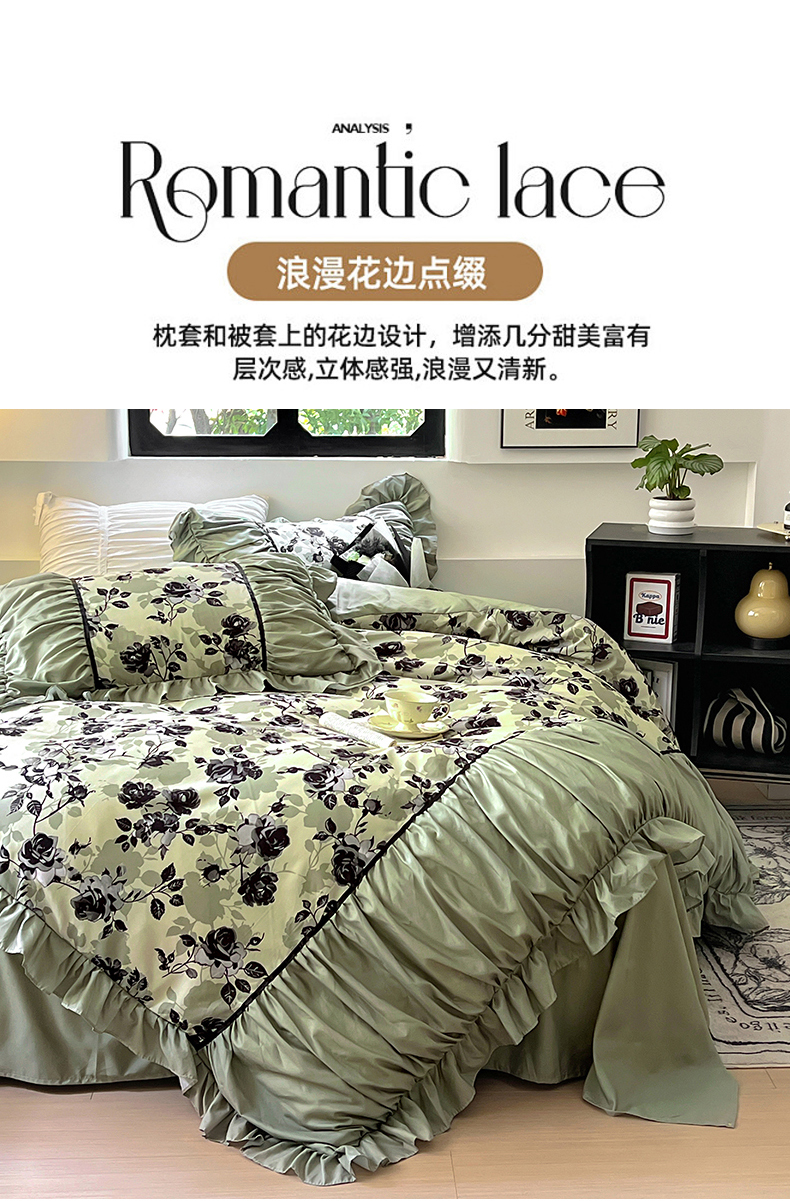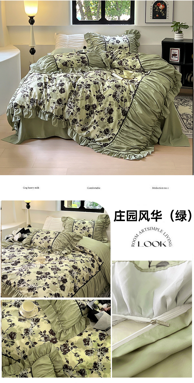商品名称:春光里 2024新款法式大花边亲肤磨毛四件套 庄园风华(绿)