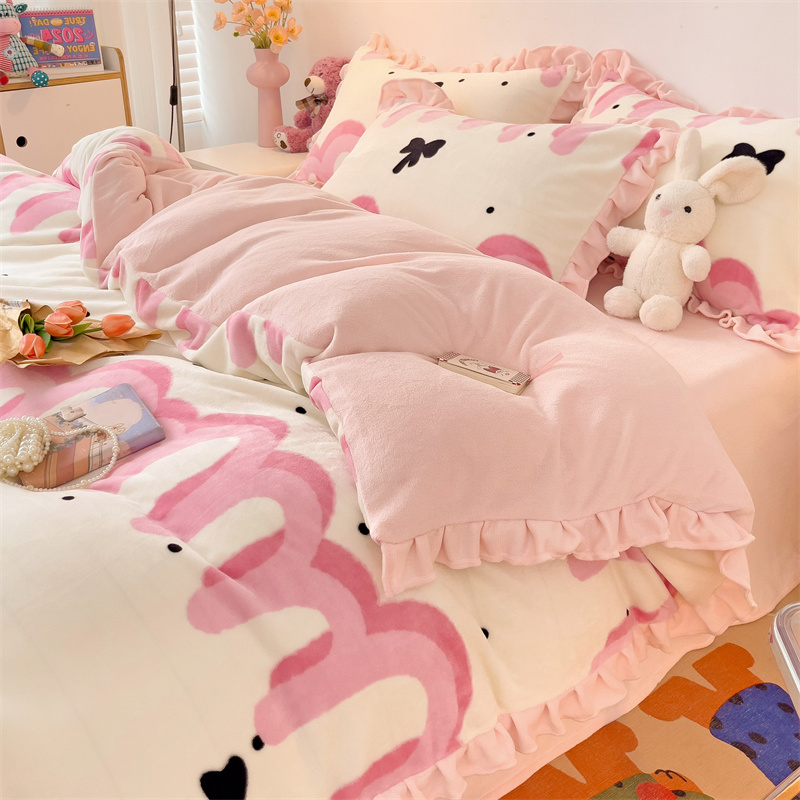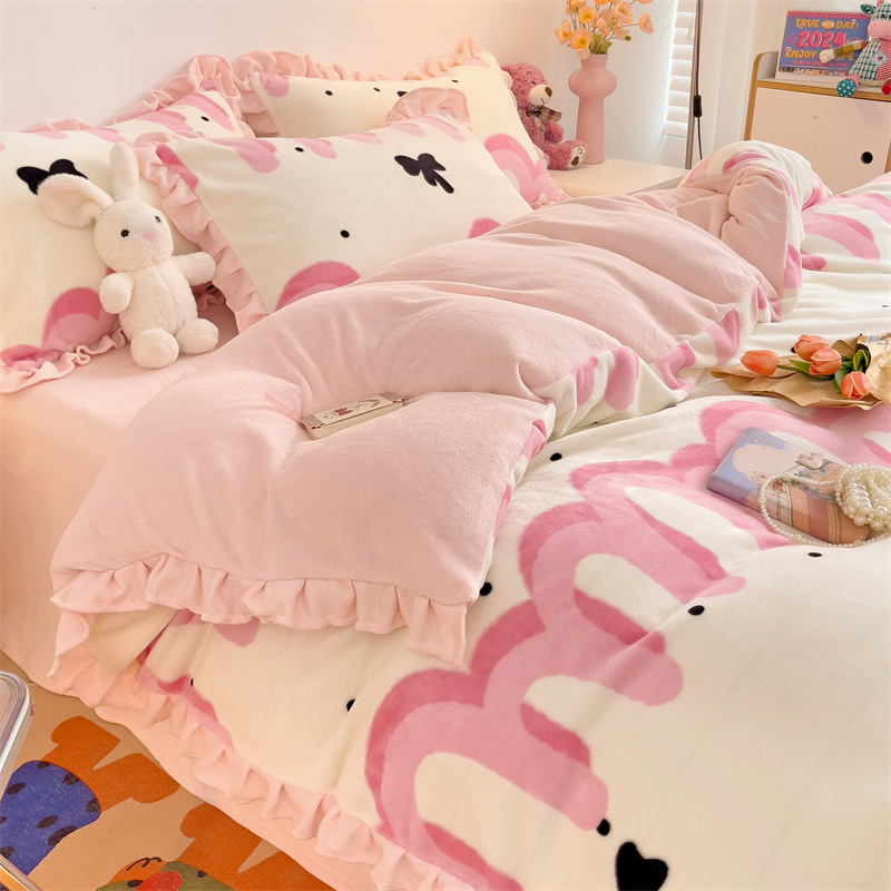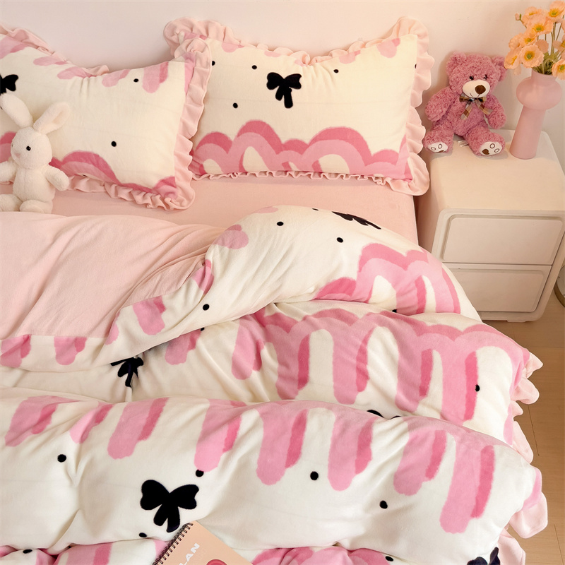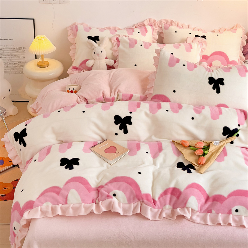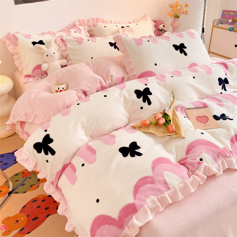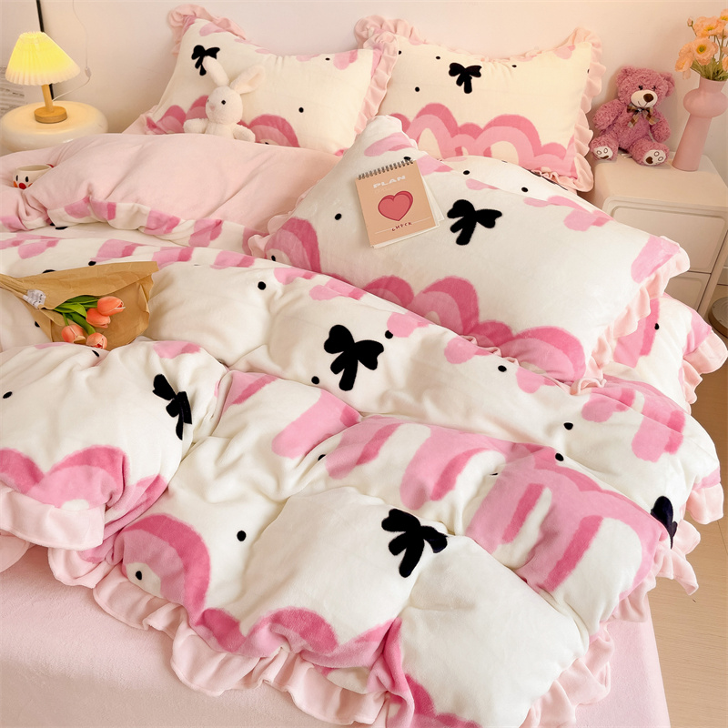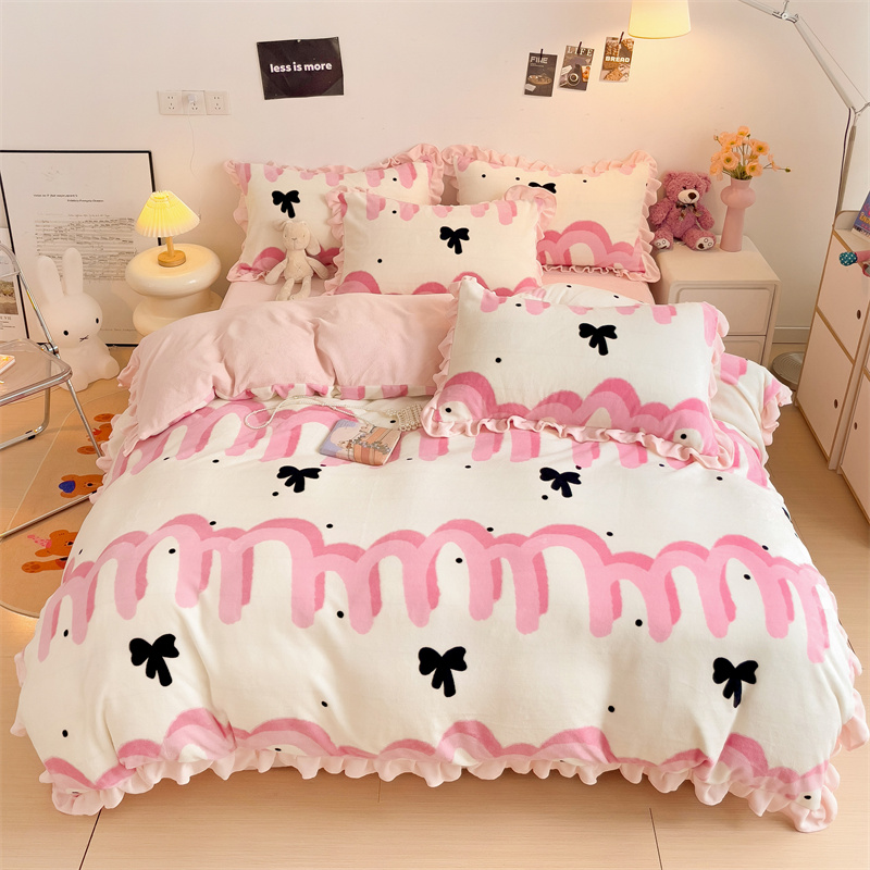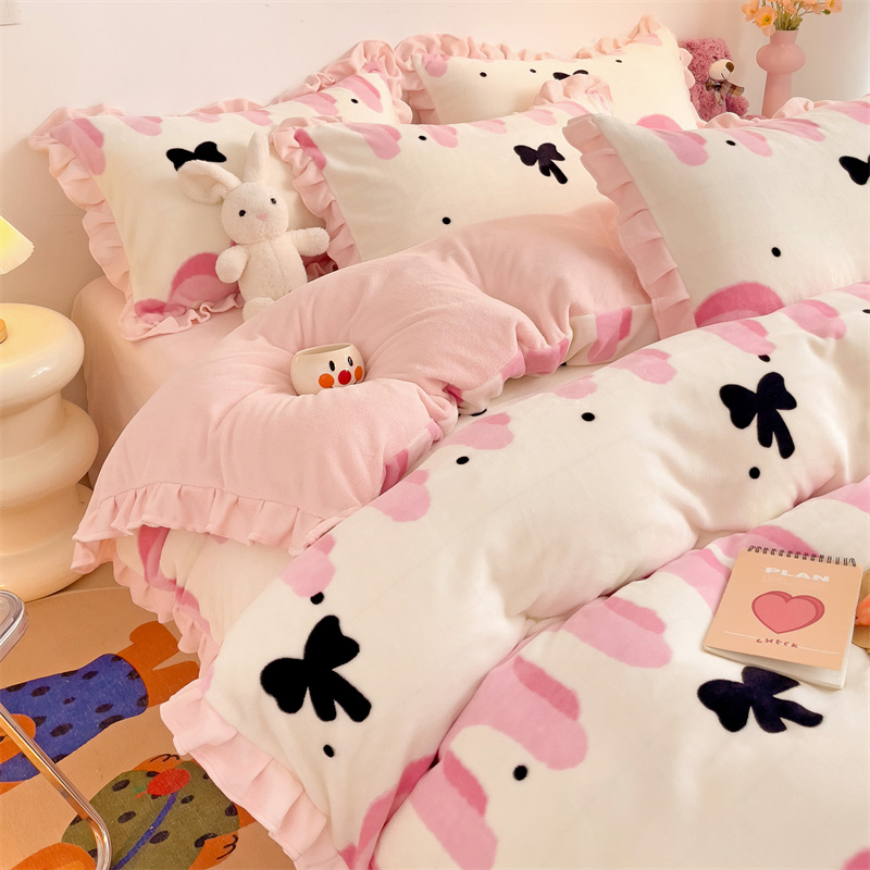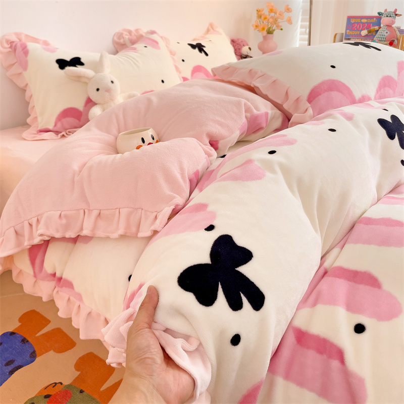 麦朵 2024高克重牛奶绒花边款四件套雪花绒金貂绒套件宝宝绒雕花绒被套 领结粉