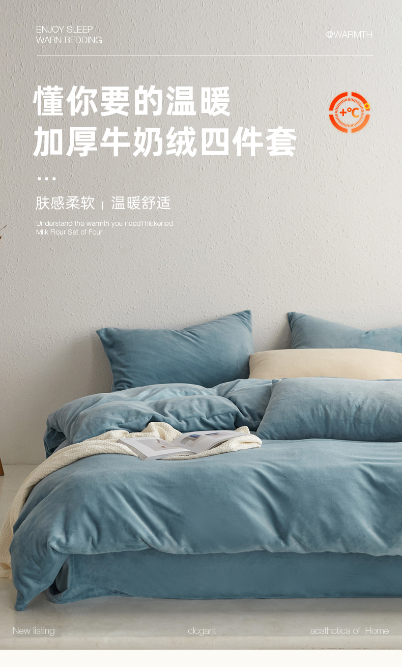 商品名称:千朵森 2024新款高克重纯色牛奶绒四件套 微蓝