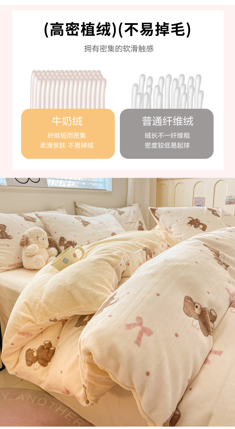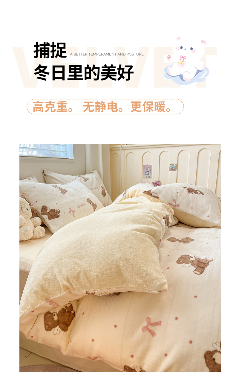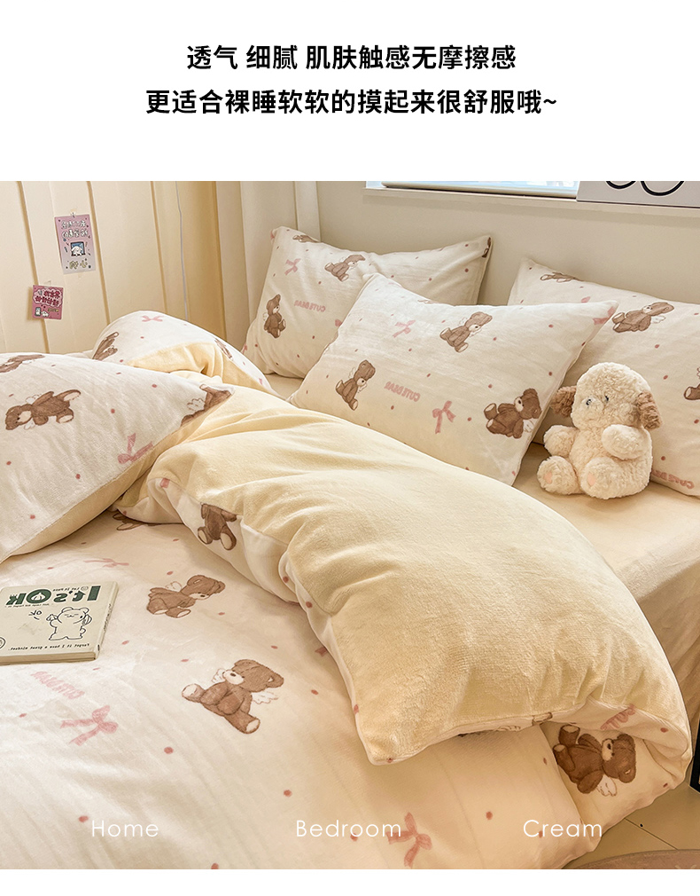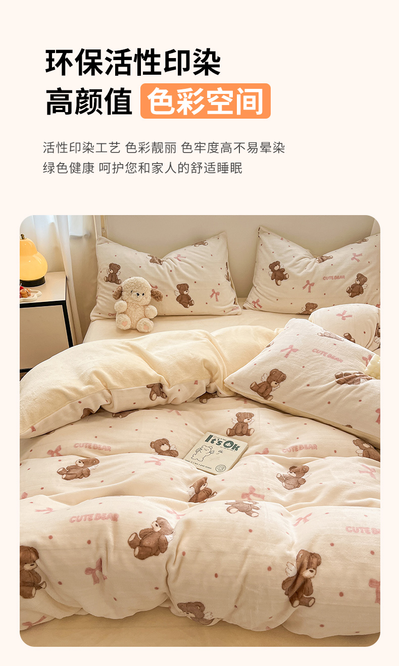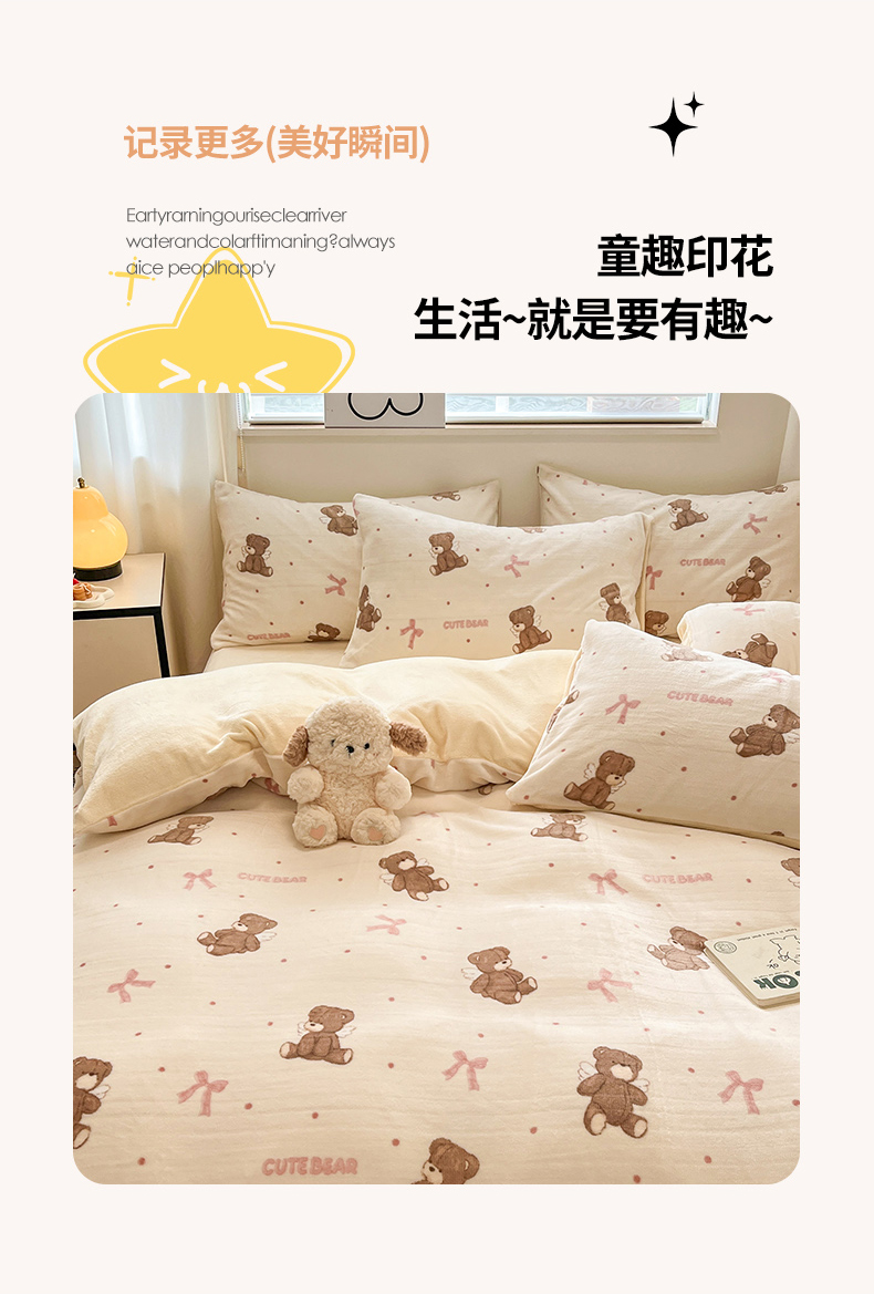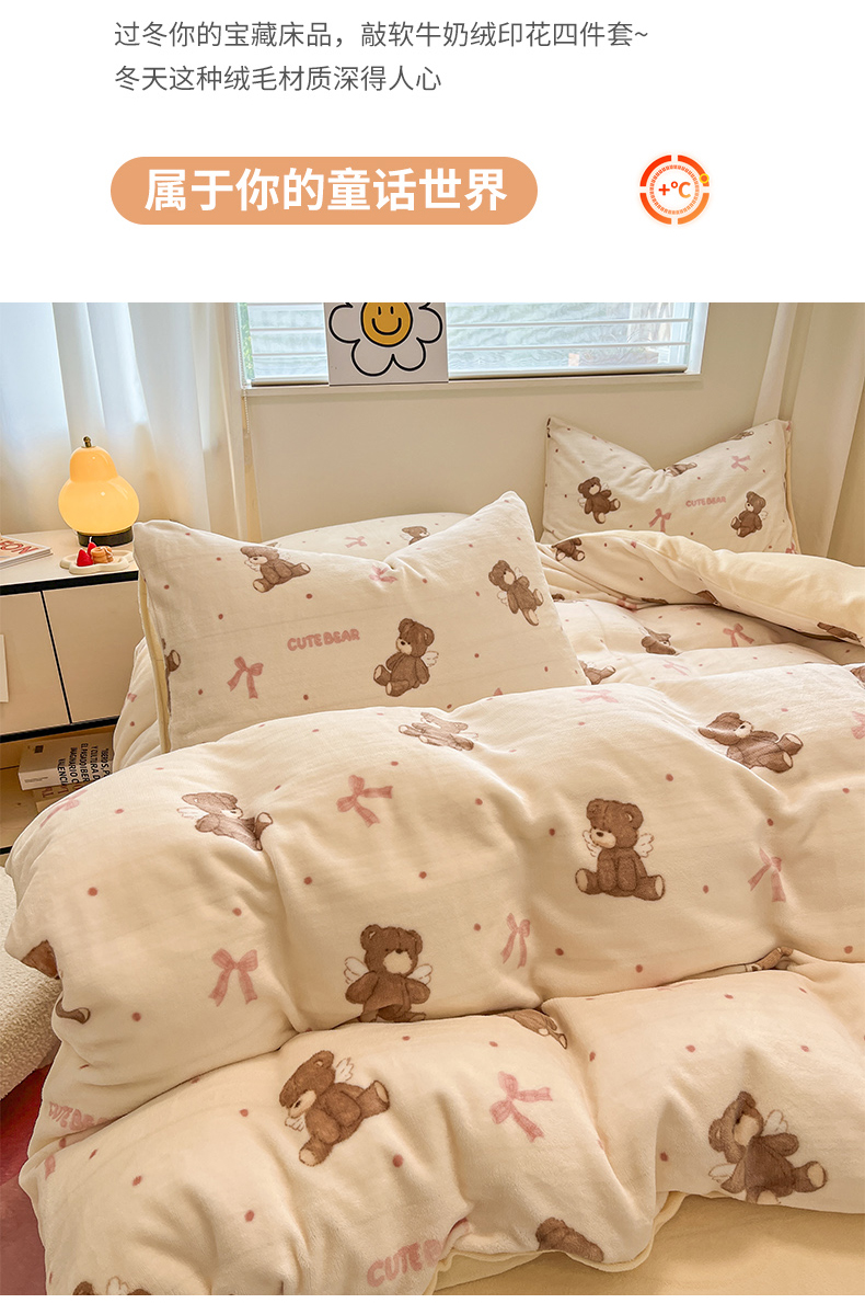 商品名称:捌月 2024新款童话镇系列高克重印花牛奶绒四件套卡通小清新加厚保暖绒套件 小熊可可