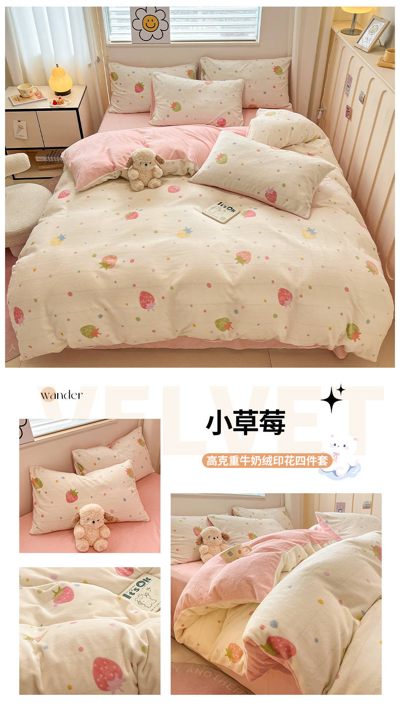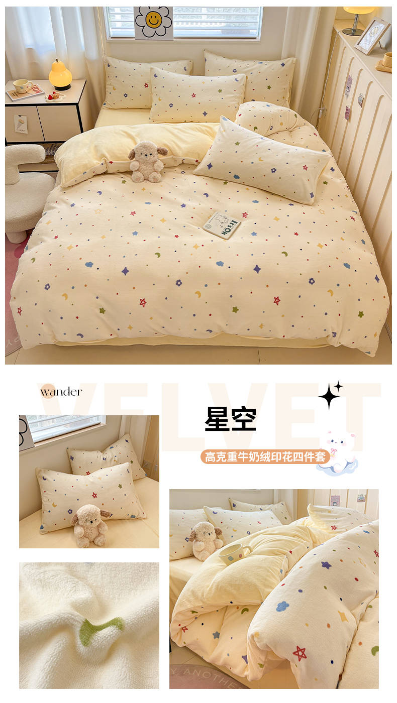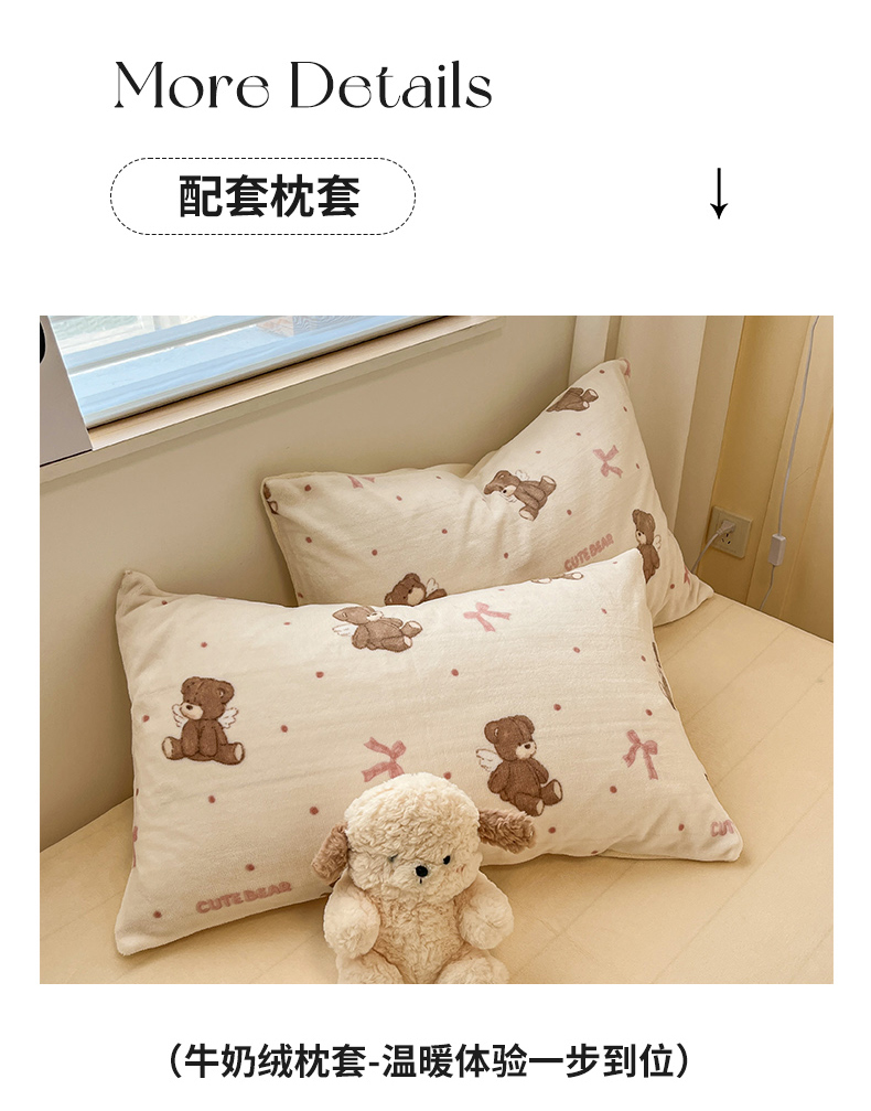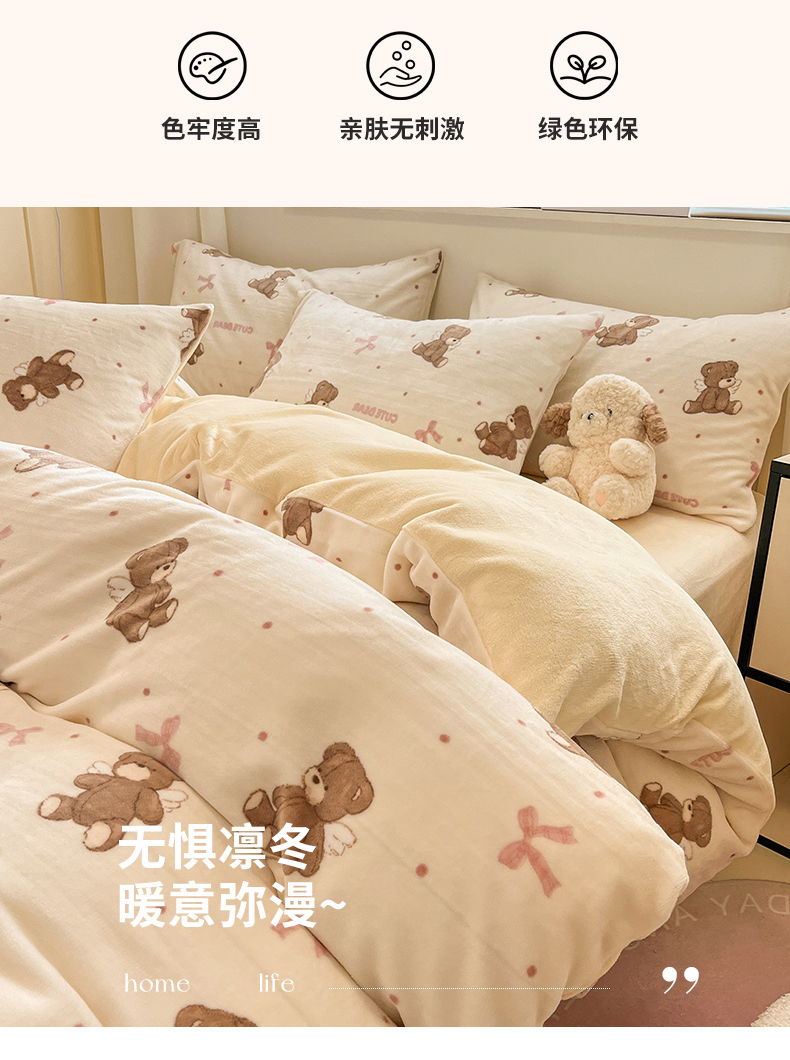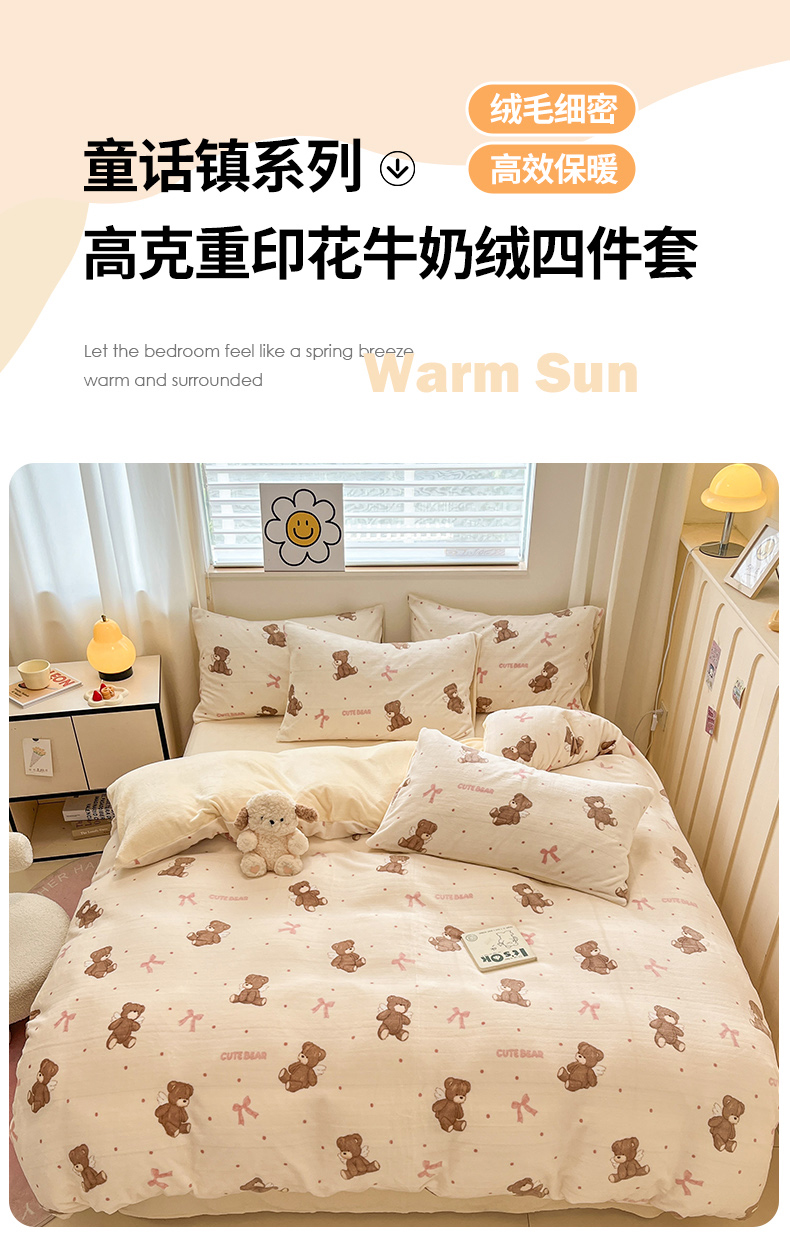 商品名称:捌月 2024新款童话镇系列高克重印花牛奶绒四件套卡通小清新加厚保暖绒套件 小熊可可