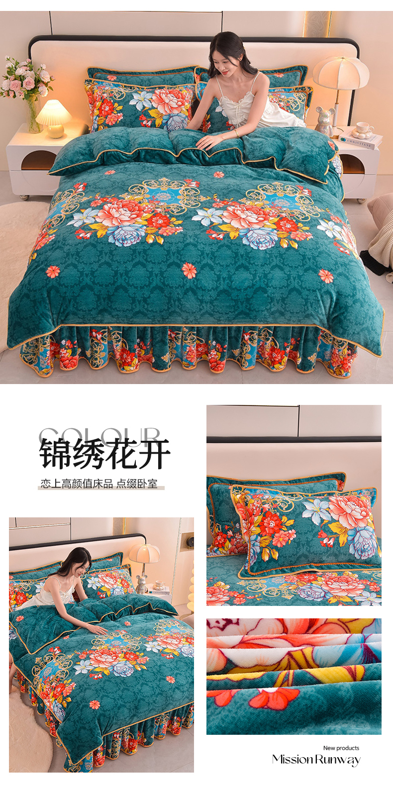 富之航 2024新款8-9斤高克重印花牛奶绒四件套保暖绒套件直播爆款锦绣花开
