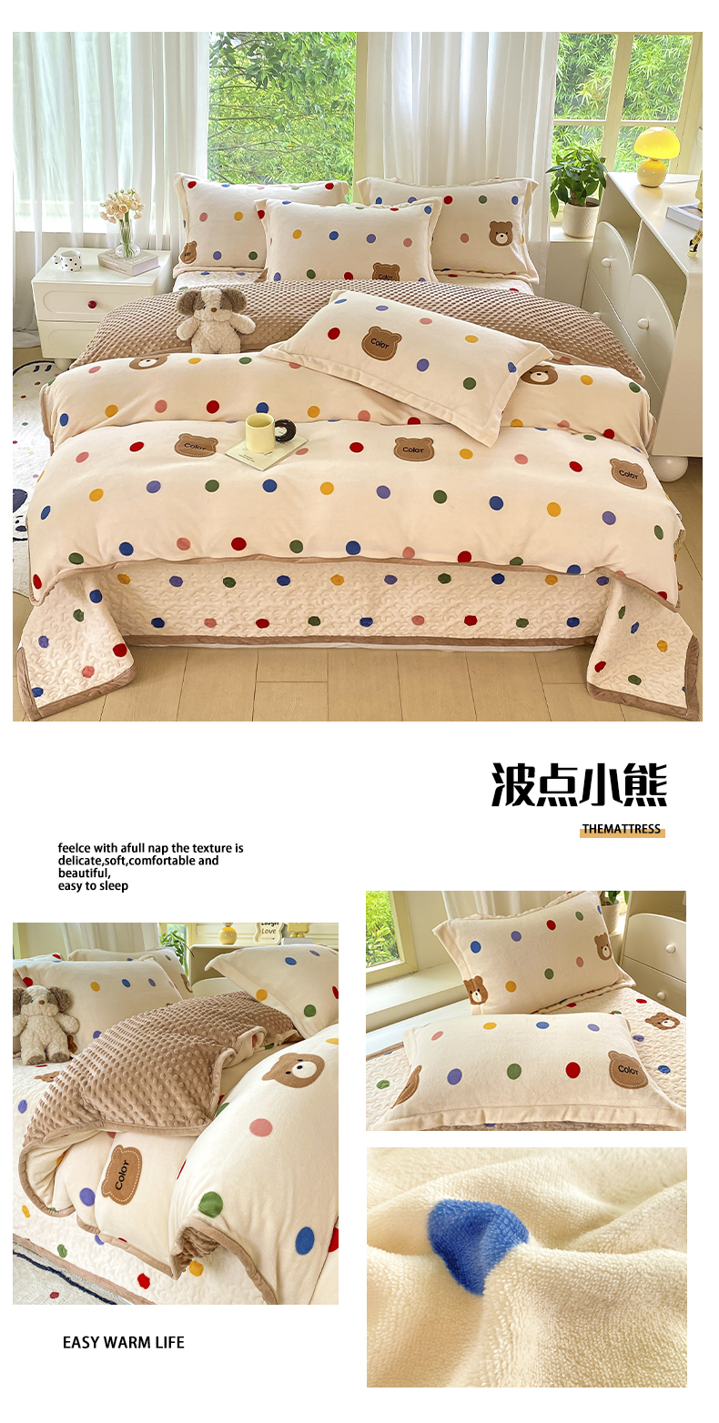 当前位置: 91家纺网 > 商品网购 > 床品套件 > 四件套 > 牛奶绒四件套 > 赫梵茜 2024新款高克重安抚豆豆被套牛奶绒夹棉床盖四件套 波点小熊
