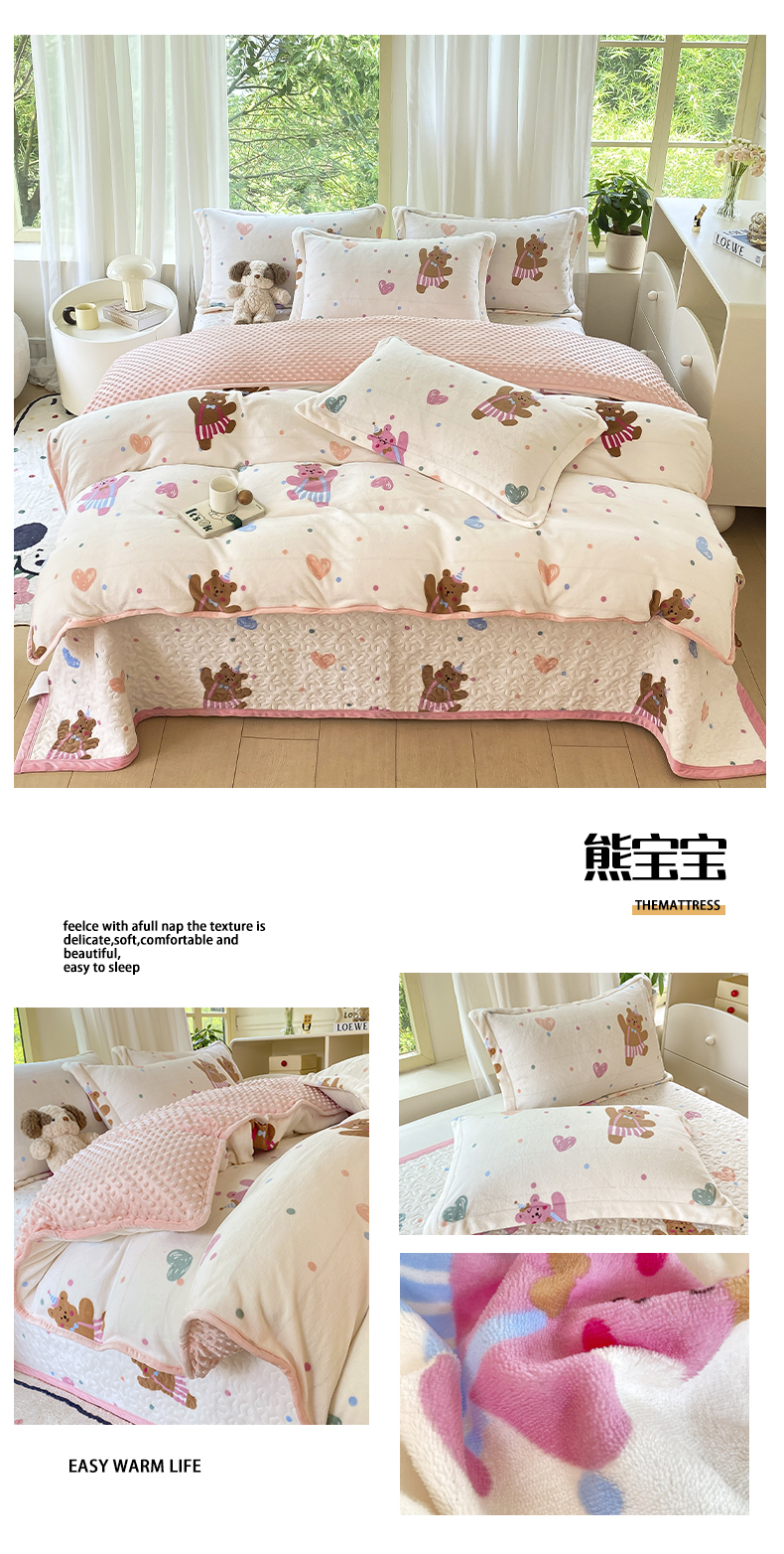 当前位置: 91家纺网 > 商品网购 > 床品套件 > 四件套 > 牛奶绒四件套 > 赫梵茜 2024新款高克重安抚豆豆被套牛奶绒夹棉床盖四件套 熊宝宝