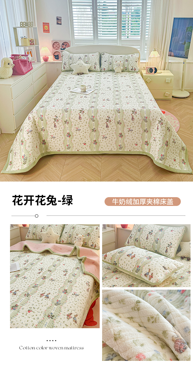 商品名称:梵朴 2024新款牛奶绒直角包边床盖 花开花兔-绿