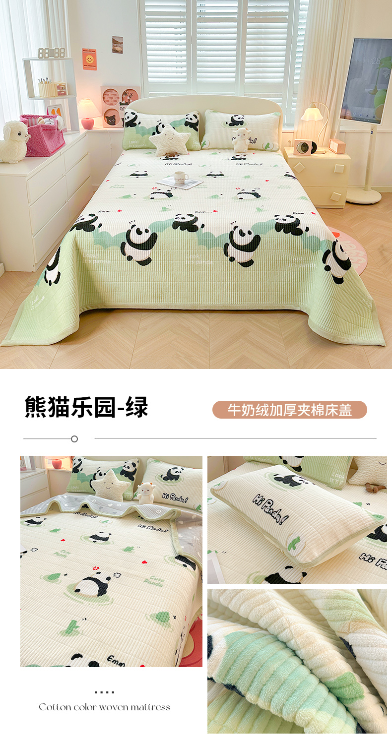 商品名称:梵朴 2024新款牛奶绒直角包边床盖 熊猫乐园-绿
