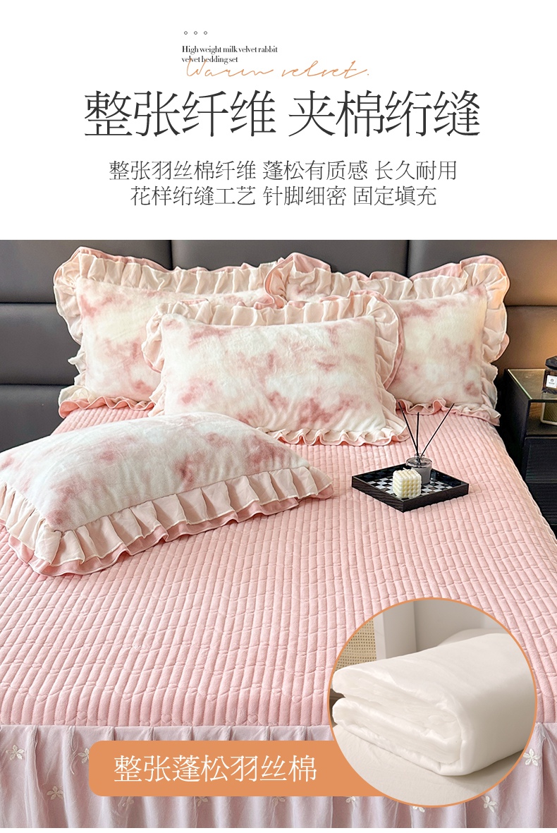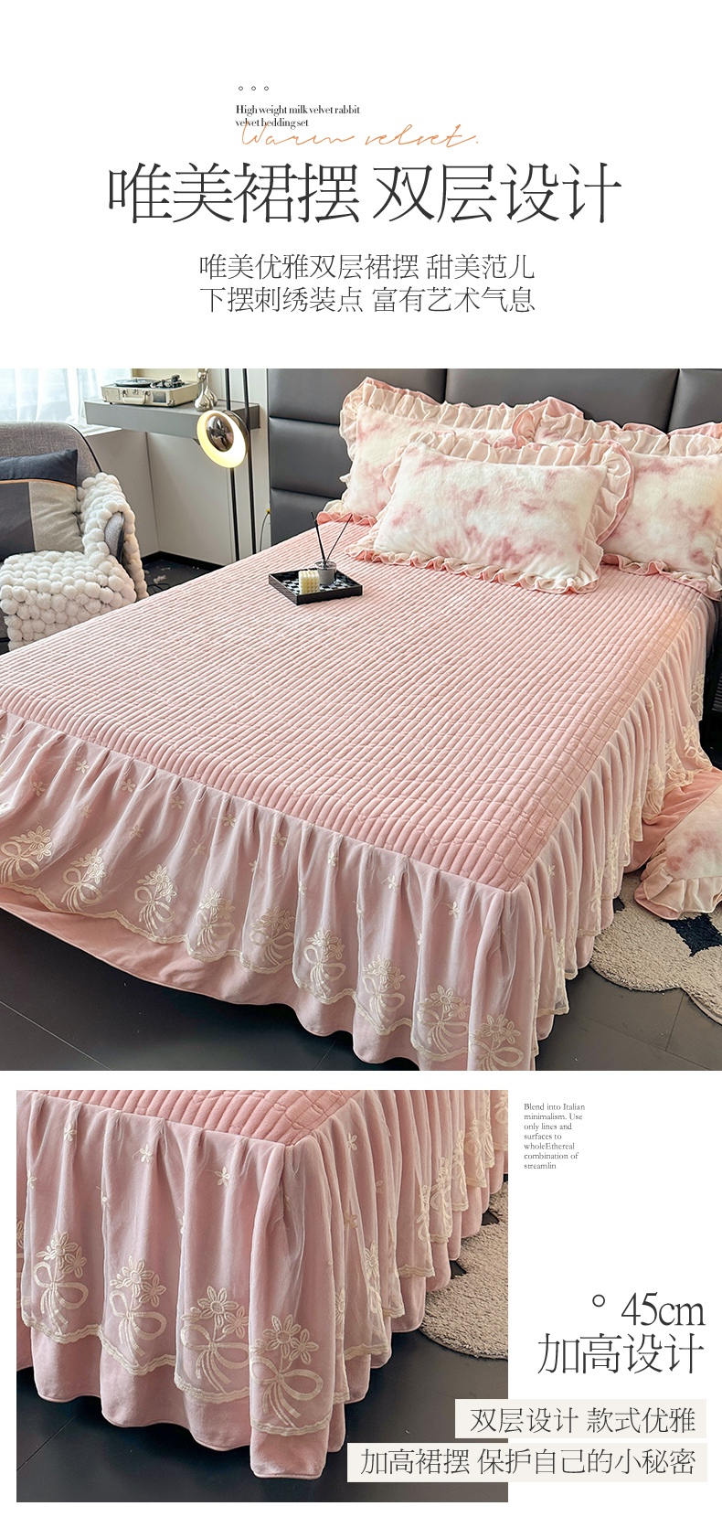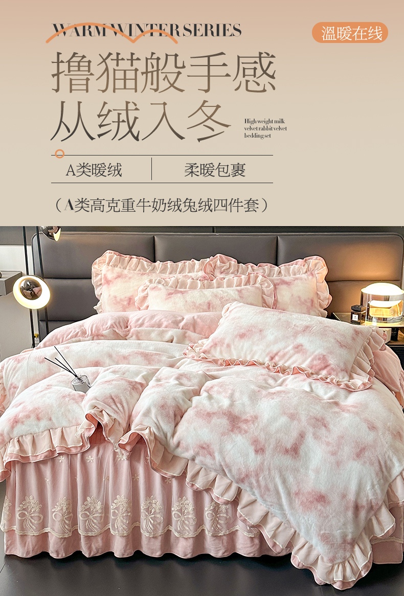 宜凡家纺 2024新款高克重牛奶绒兔绒床裙四件套 云雾深深 粉
