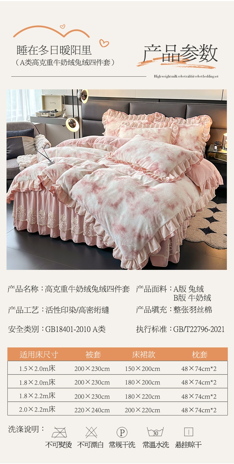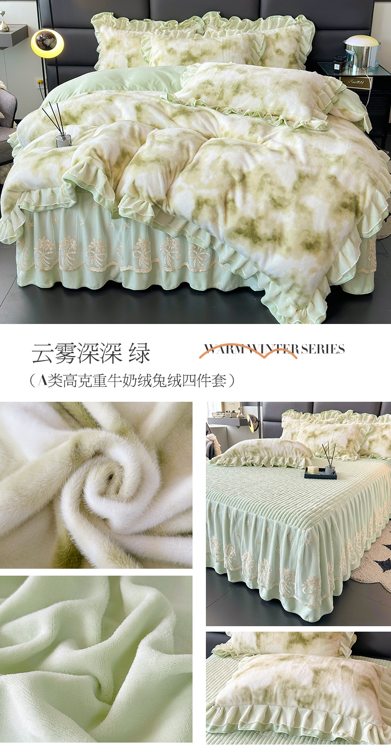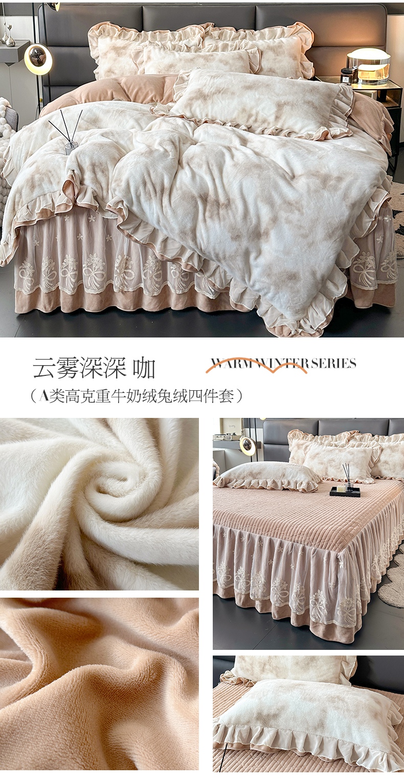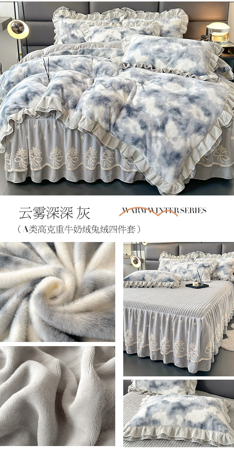 商品名称:宜凡家纺 2024新款高克重牛奶绒兔绒床裙四件套 云雾深深 粉