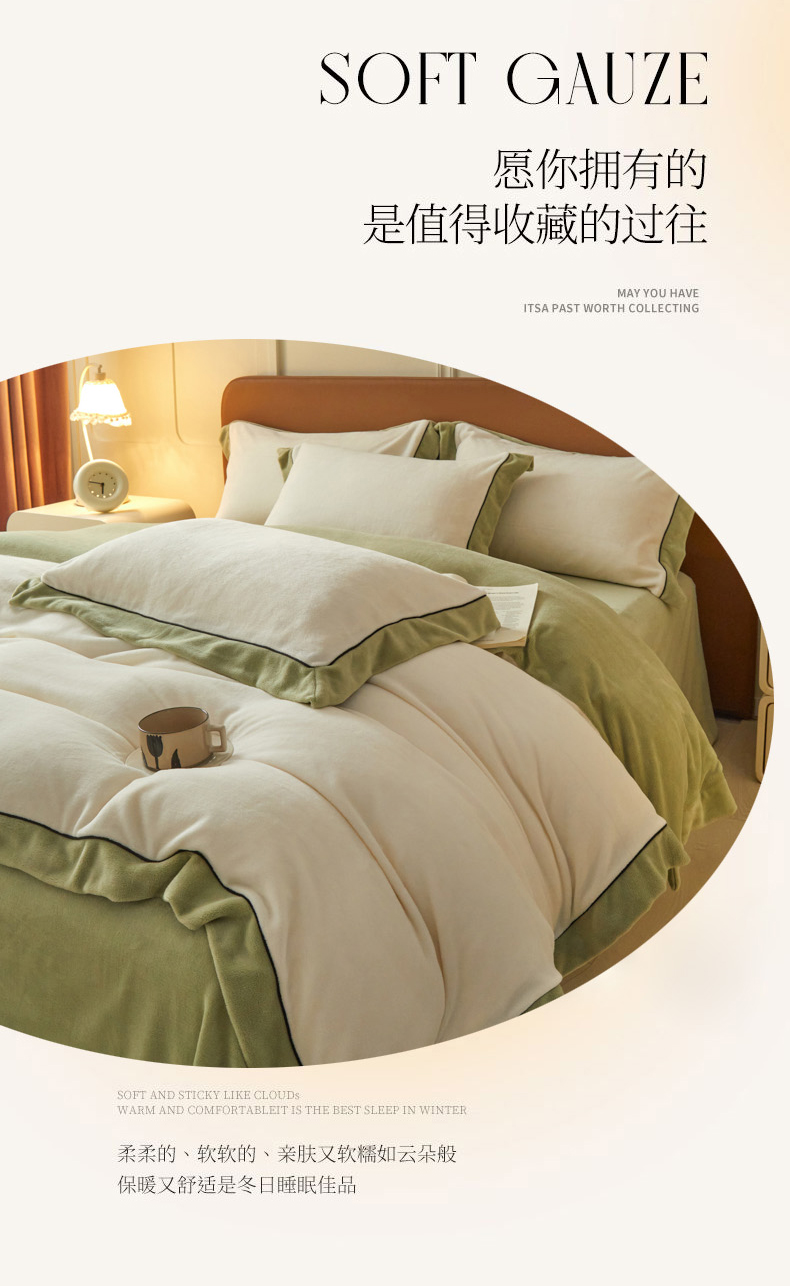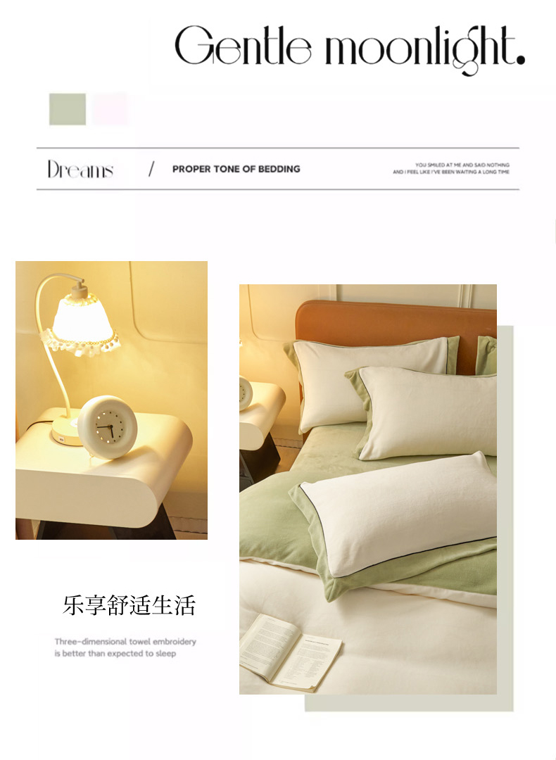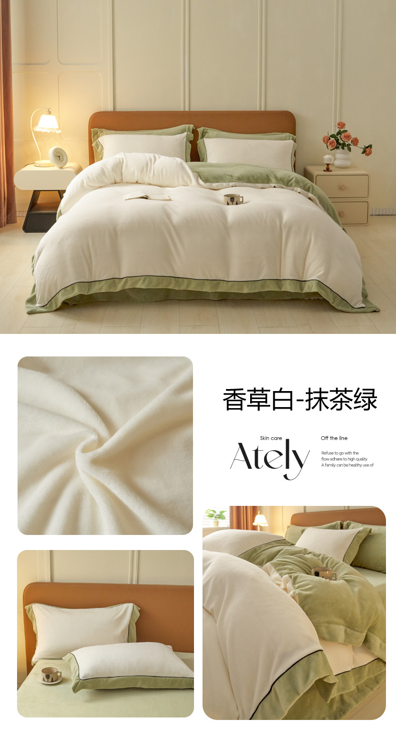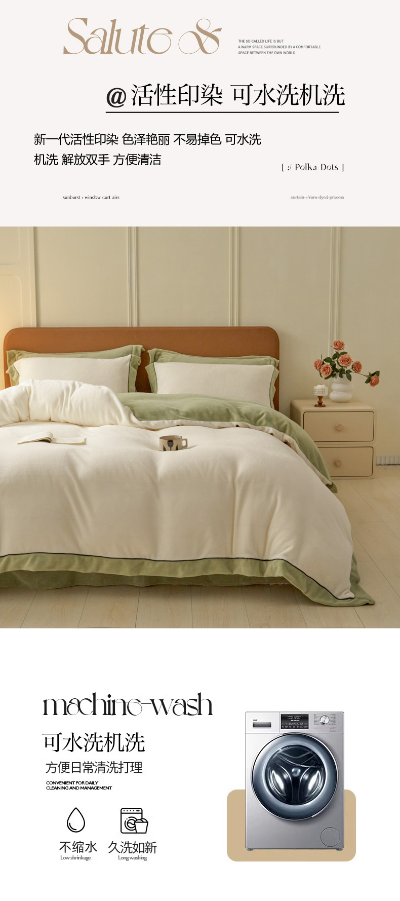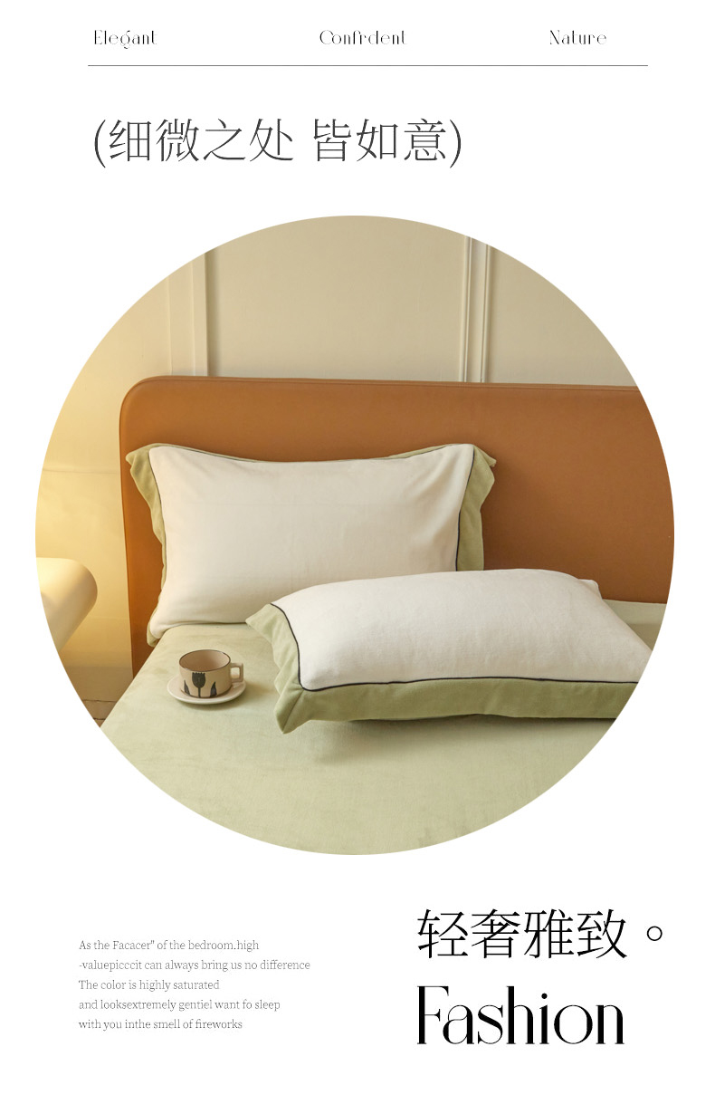 当前位置: 91家纺网 > 商品网购 > 床品套件 > 四件套 > 牛奶绒四件套 > 万盛家纺 2025新款牛奶绒拼色宽边四件套 香草白-抹茶绿