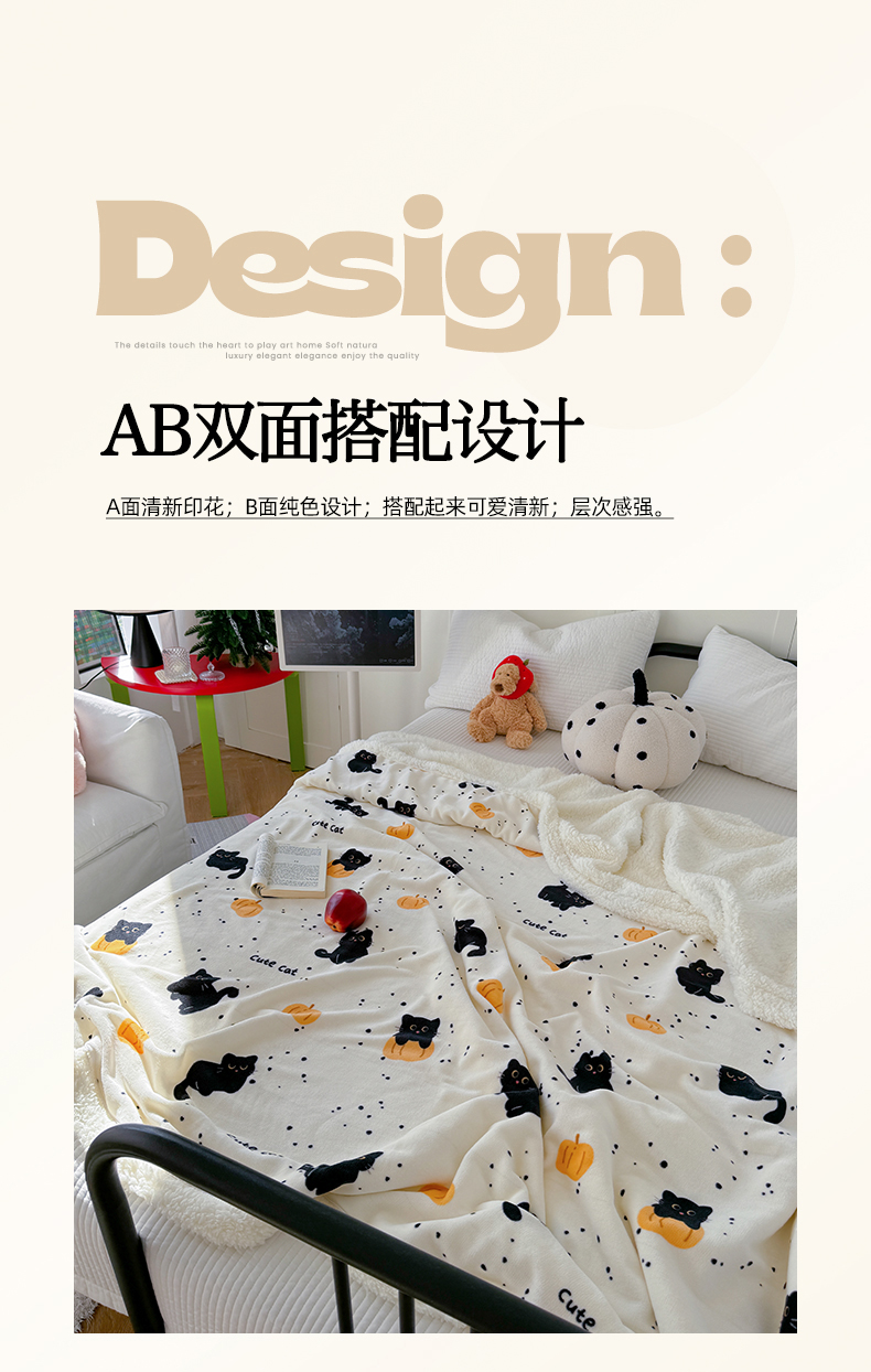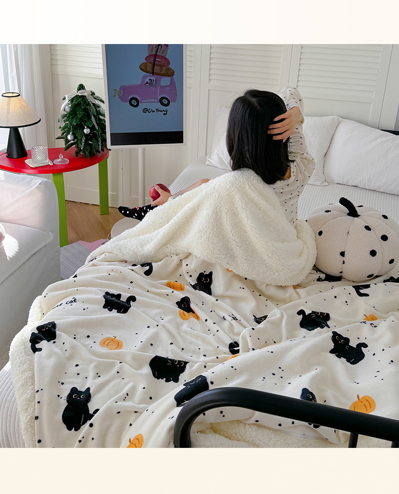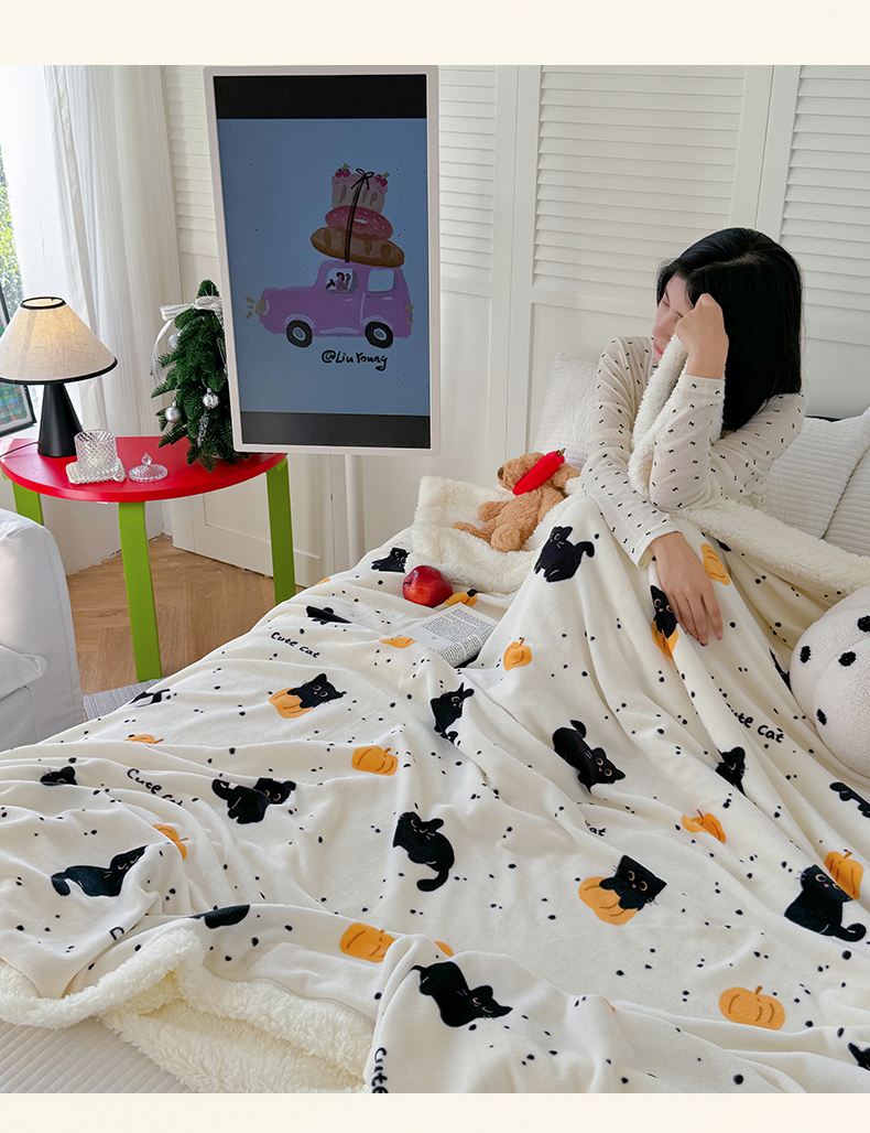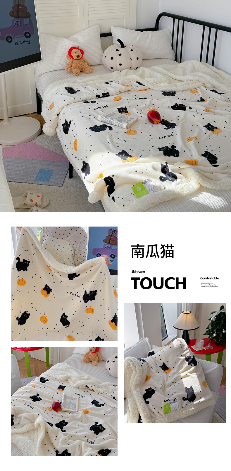 吉象家纺 2024新款高克重牛奶绒羊羔绒印花毛毯 南瓜猫