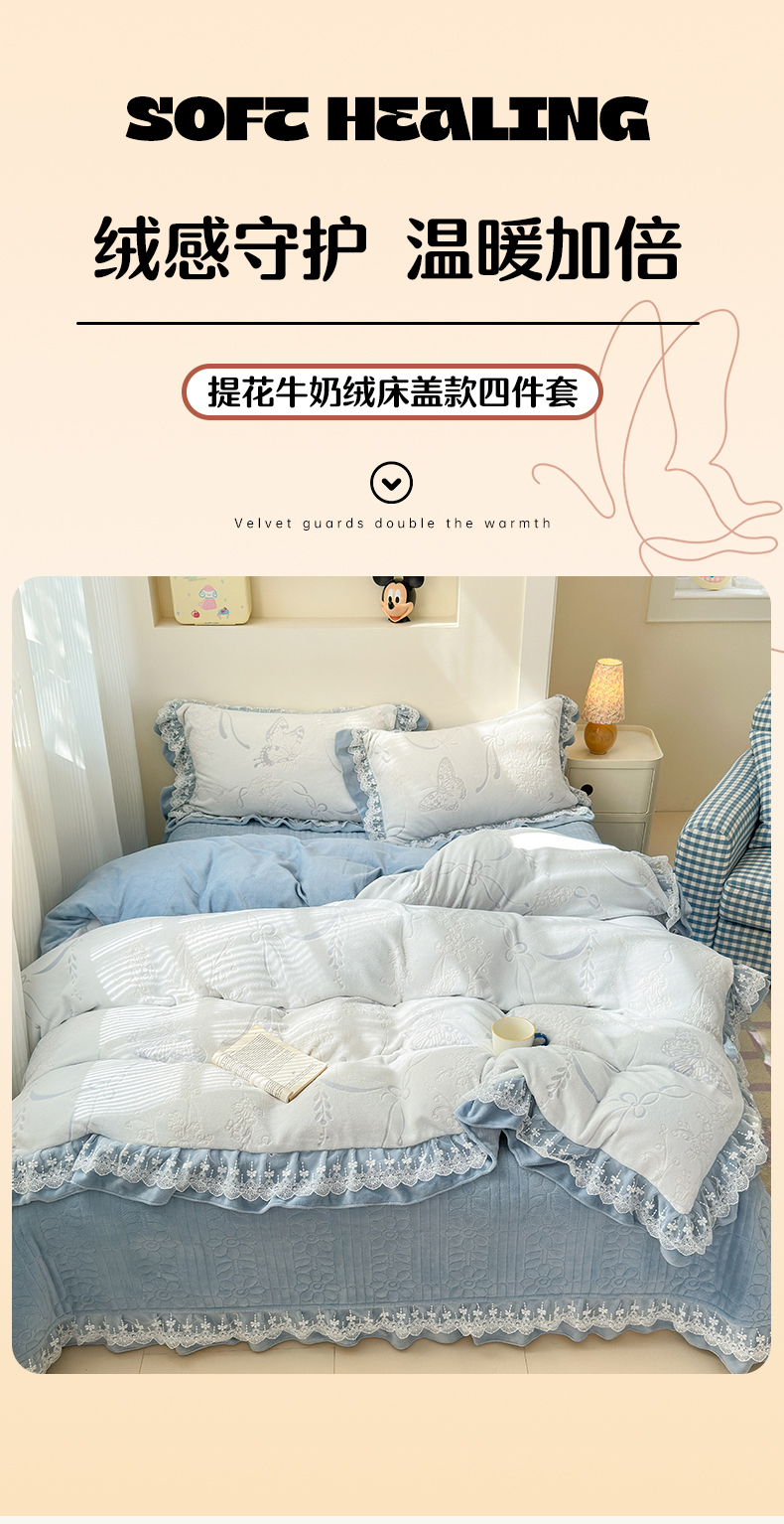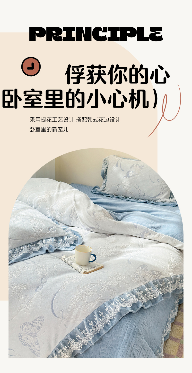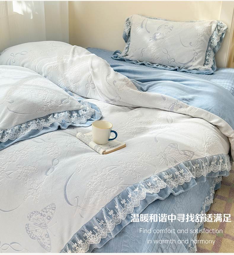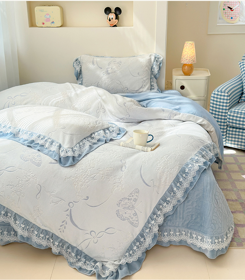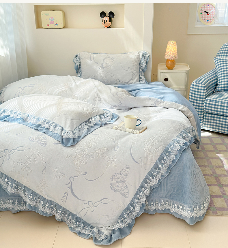淑女公社家纺 2024秋冬新款提花牛奶绒床盖款四件套 蝴蝶 蓝色