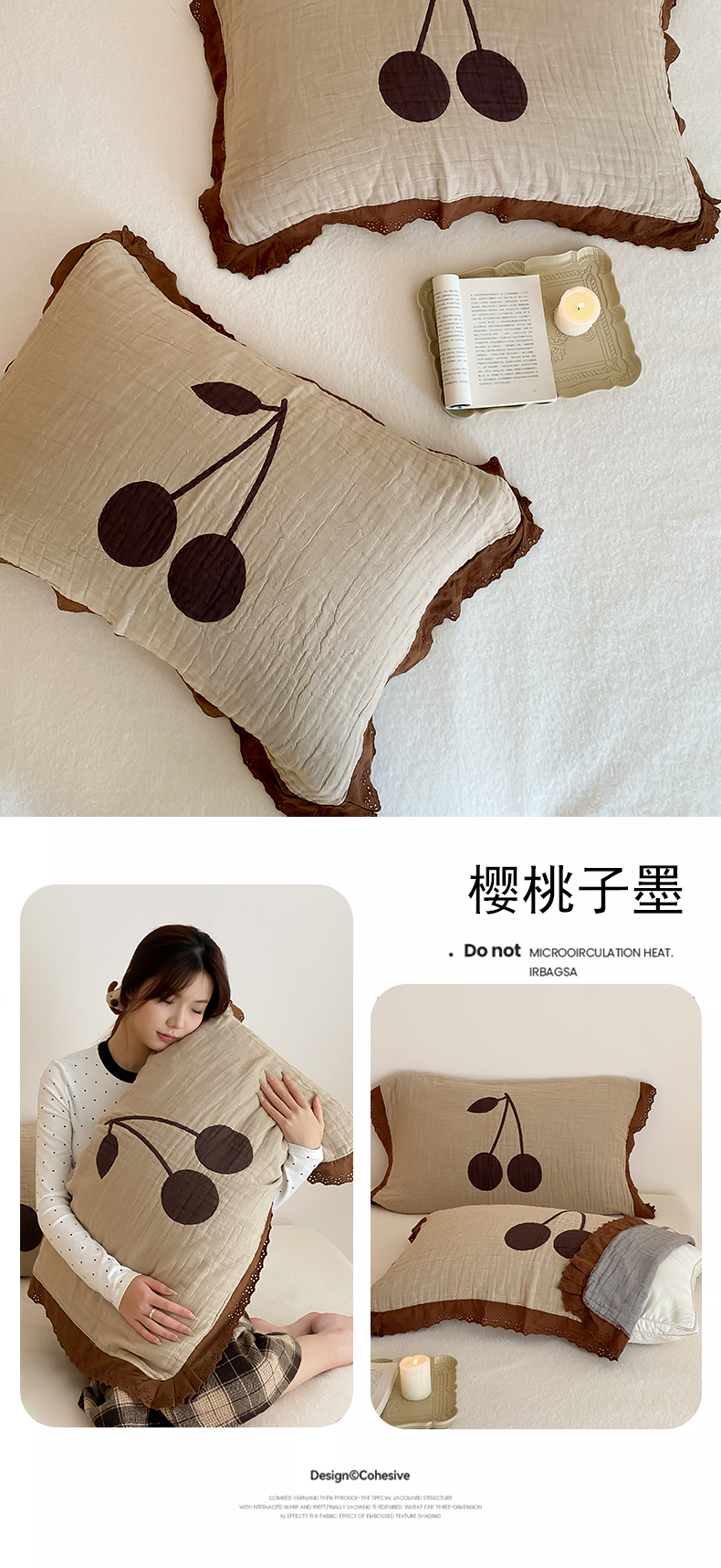 • 91家纺网 家纺一手货源 找家纺 麻依 2024新款纯棉花边款四层纱布枕巾一对装55*80cm 樱桃子墨