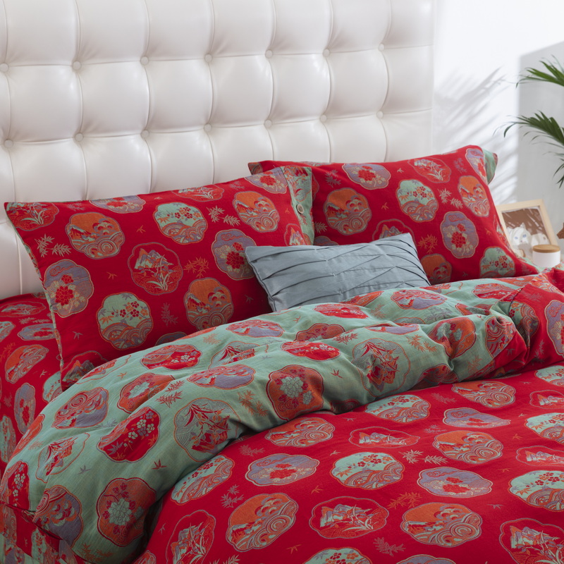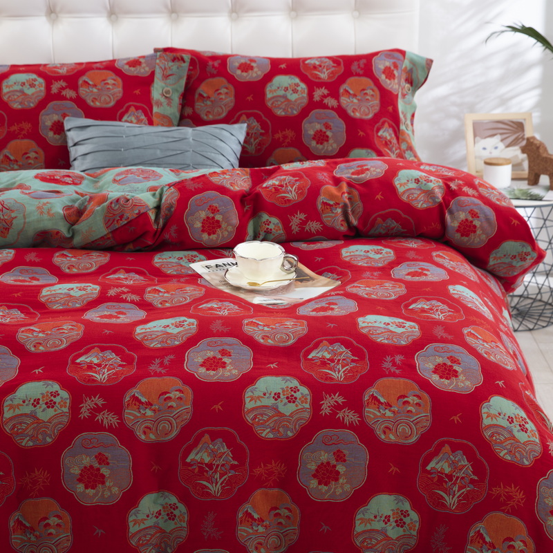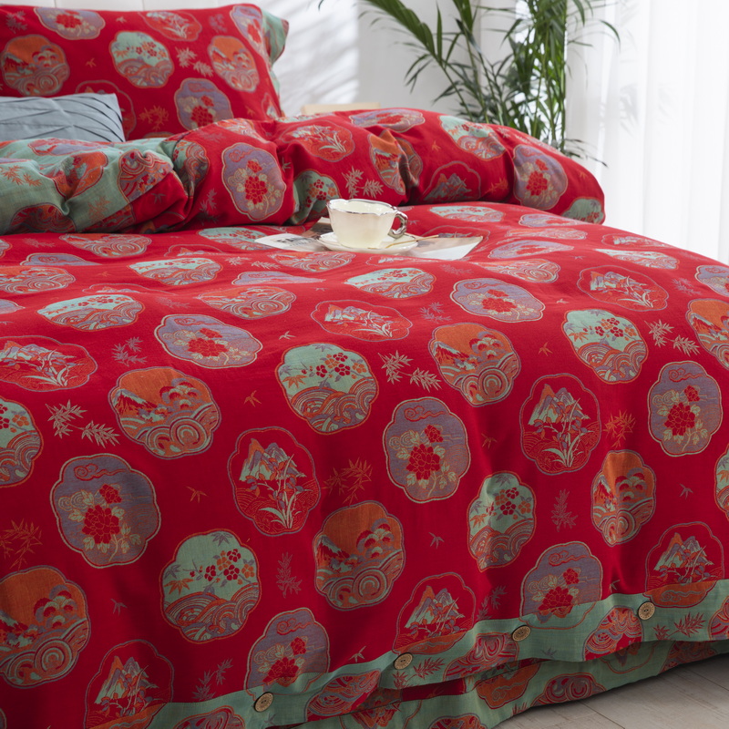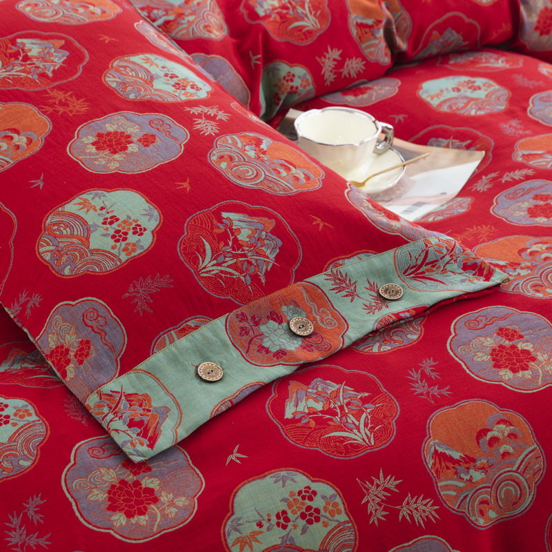 鲁爱 2025新款全棉色织双层纱纽扣款四件套 镜花水月-红