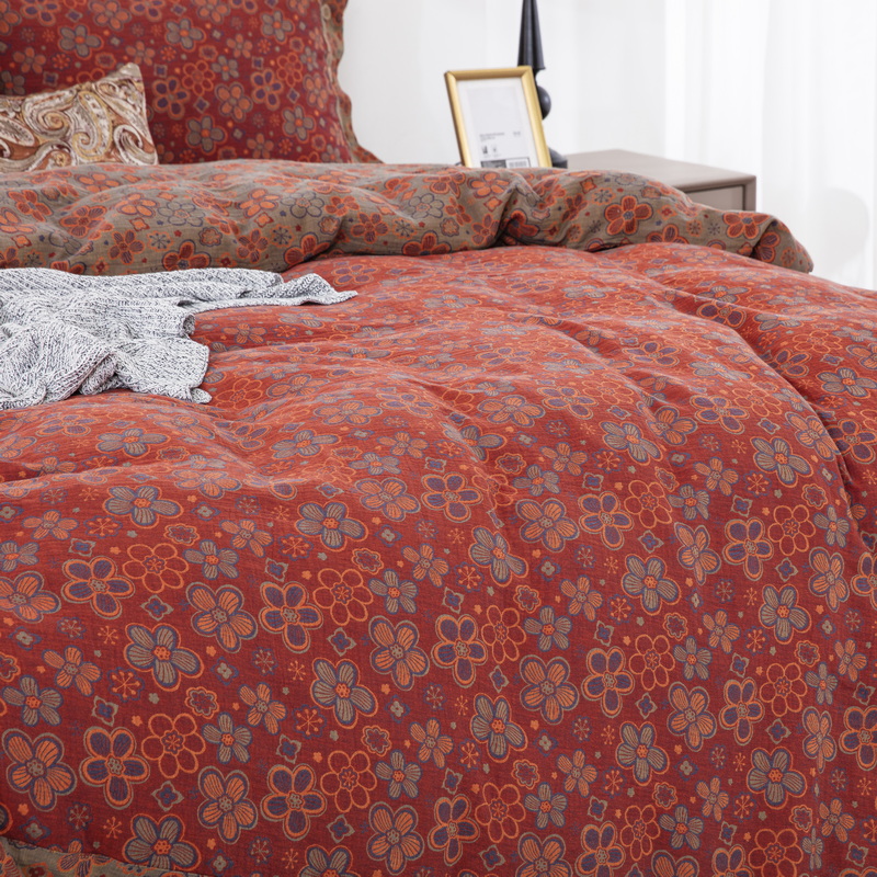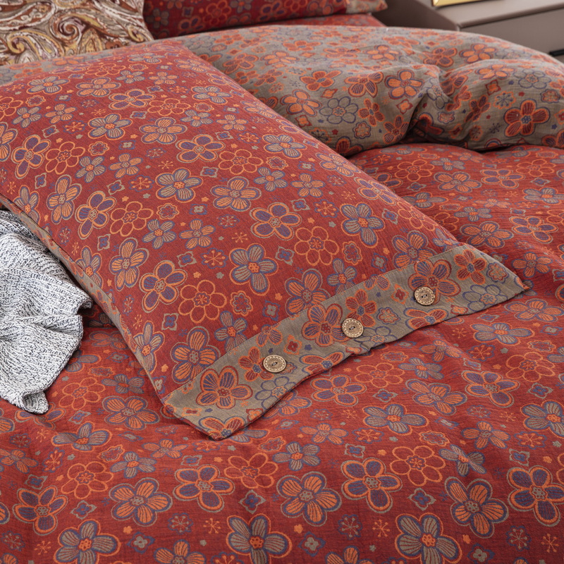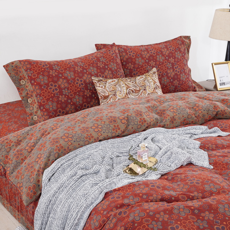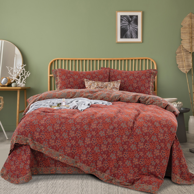 鲁爱 2025新款全棉色织双层纱纽扣款四件套 泽丽-酒红