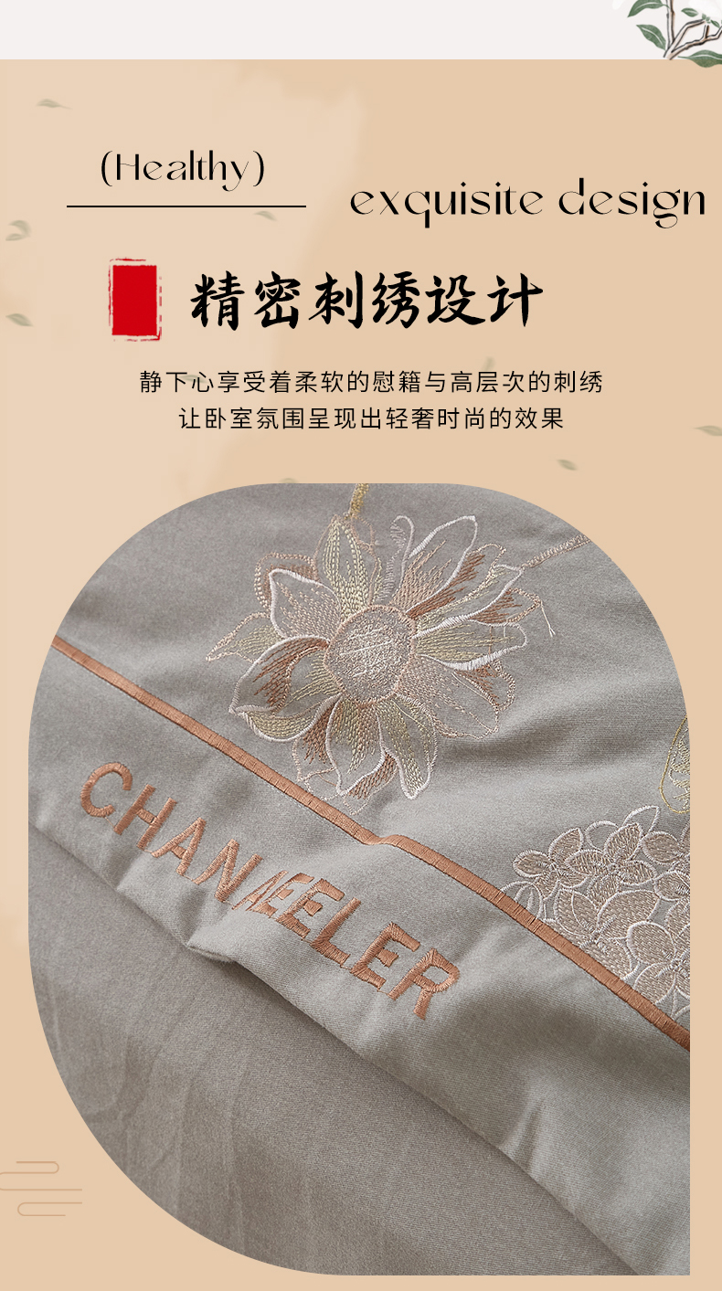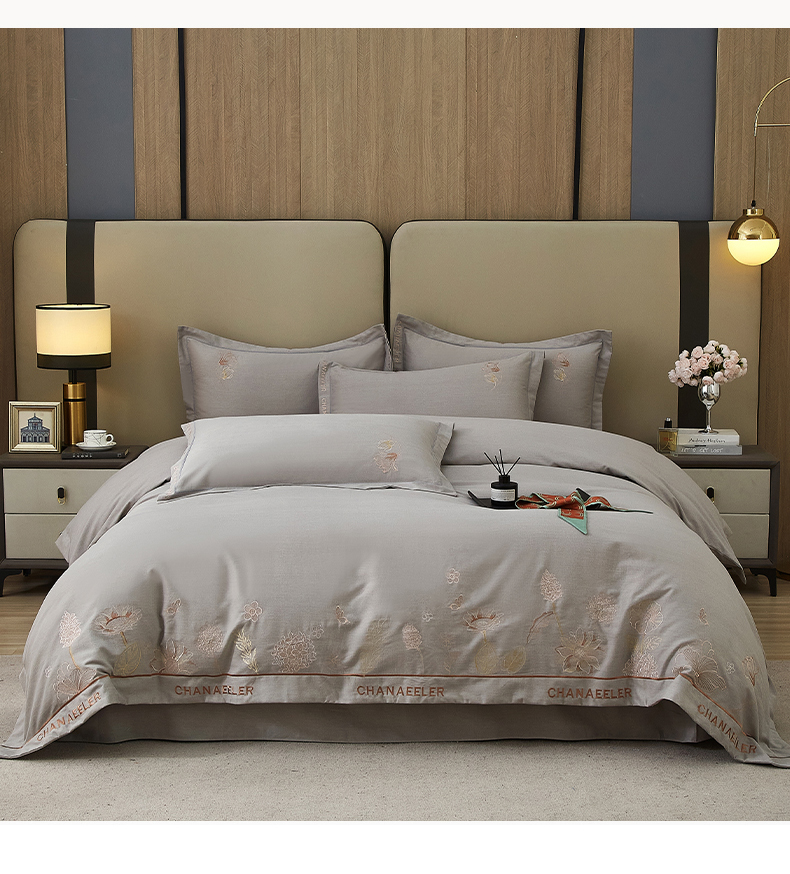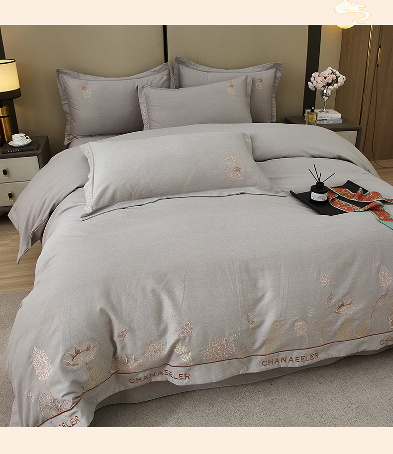 商品名称:金纱玉纺家纺 2024新款纯色加厚绣花工艺四件套 南法凤情-灰