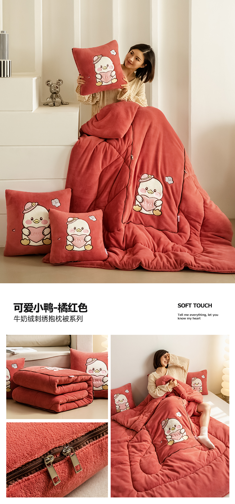 (总)雷人家纺 2024新款A类加厚加重贴布绣牛奶绒抱枕被,可爱小鸭海蓝色,可爱小鸭橘红色,可爱小鸭浅棕黄,可爱小鸭深褐色,可爱小鸭桃粉色,柿柿如意果绿色,柿柿如意灰粉色,柿柿如意香槟色,柿柿如意星光灰