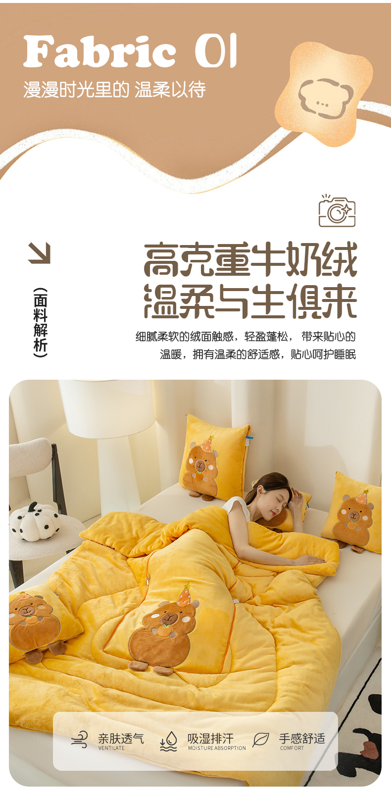 (总)雷娜家居 2025款加厚牛奶绒Happy Toast贴布绣抱枕被,藏青,橙橘,豆绿,海蓝,湖绿,暖玉色,深灰,温柔紫