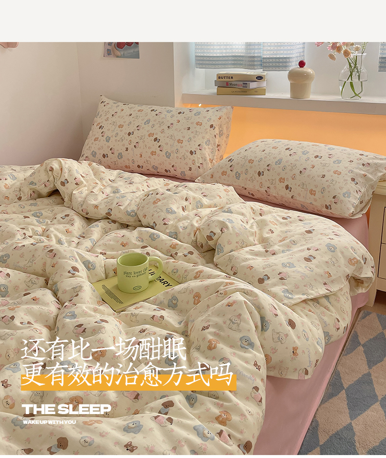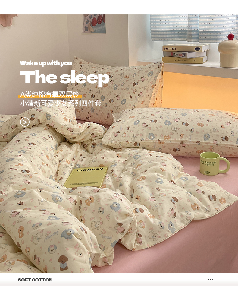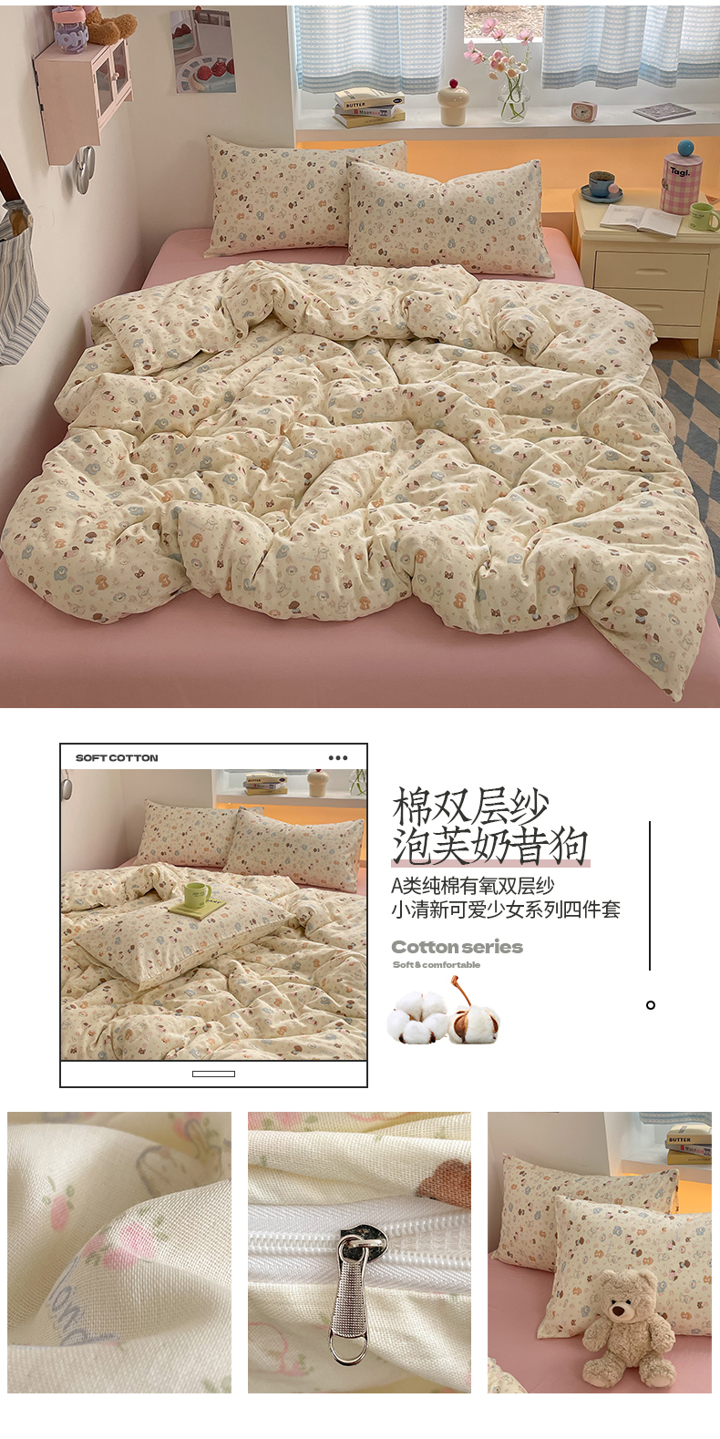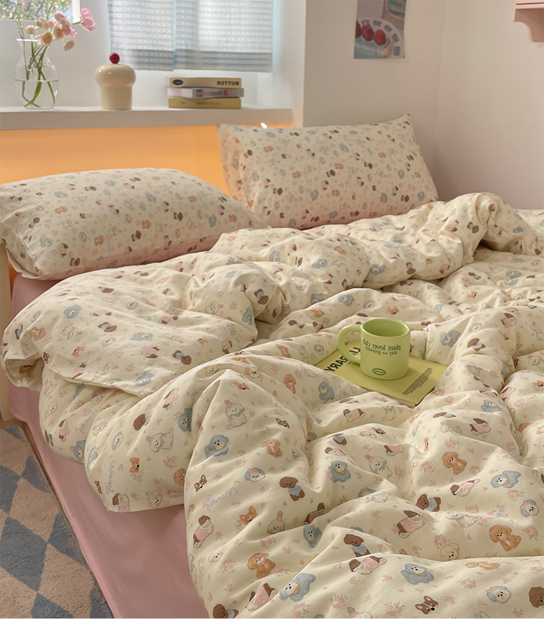 当前位置: 91家纺网 > 商品网购 > 床品套件 > 四件套 > 全棉普通四件套 > 桃子家居2025新款A类纯棉有氧双层纱小清新可爱少女系列四件套 棉双层纱-泡芙奶昔狗