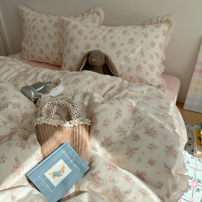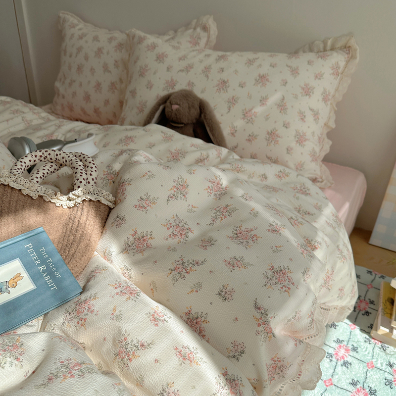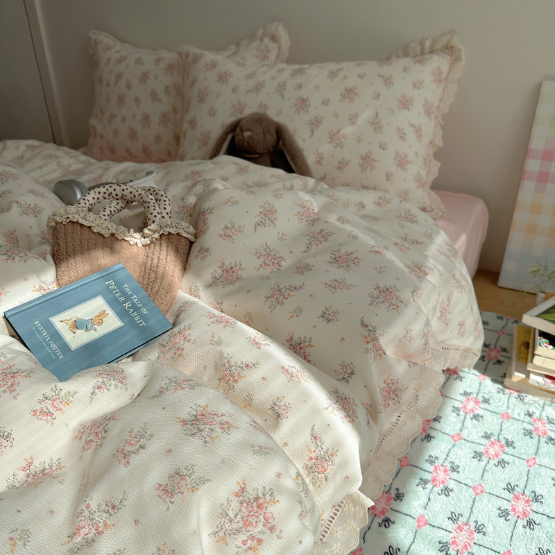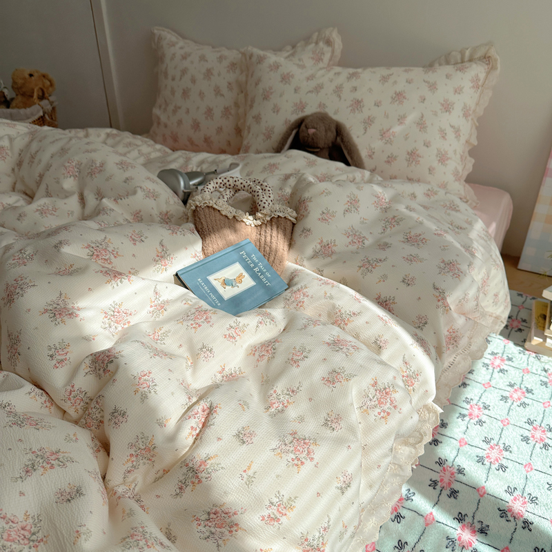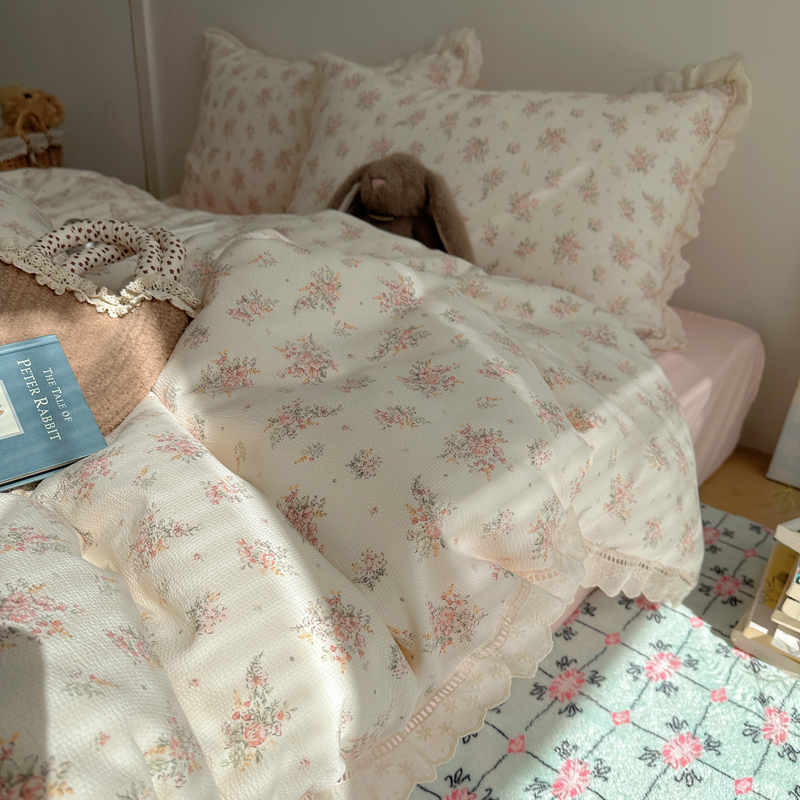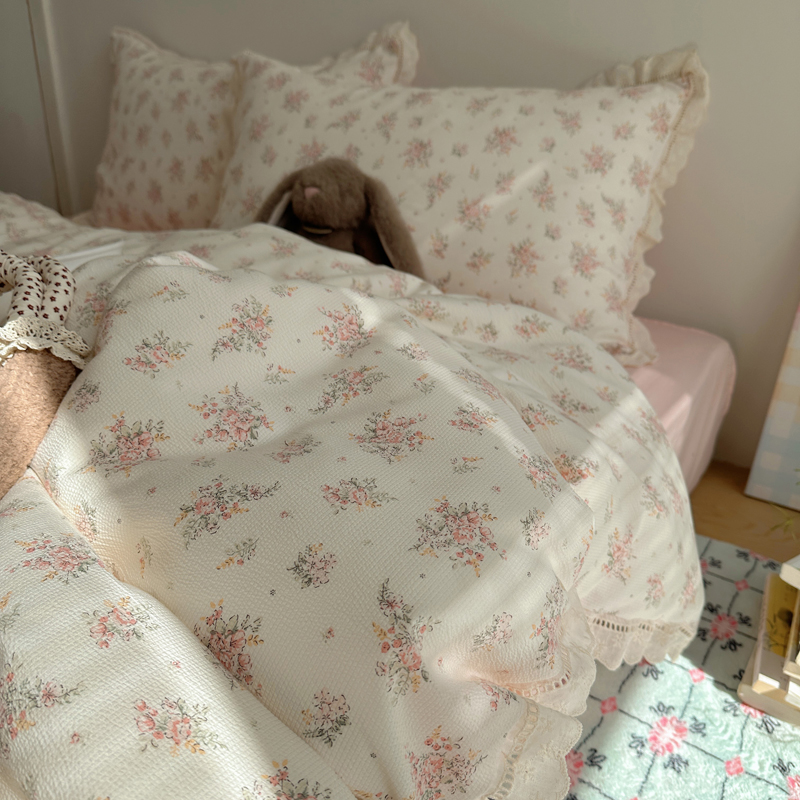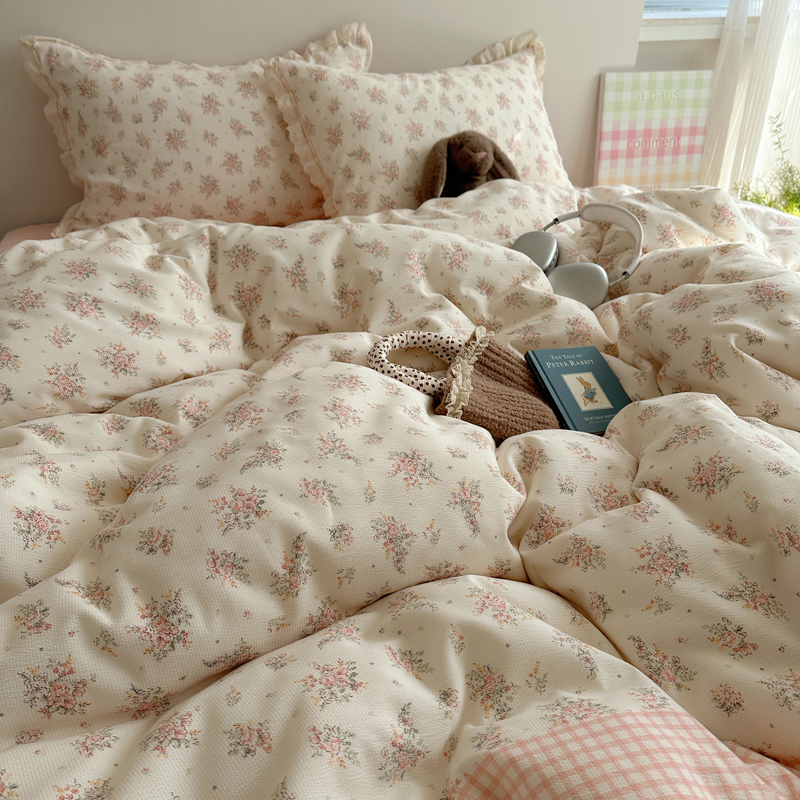 商品名称:2025新款春日碎花云朵泡泡纱花边套件 粉格花花