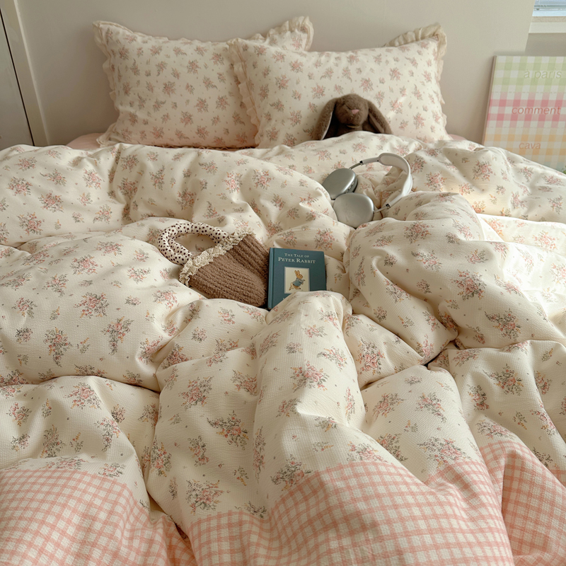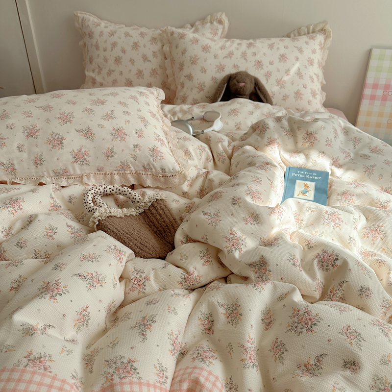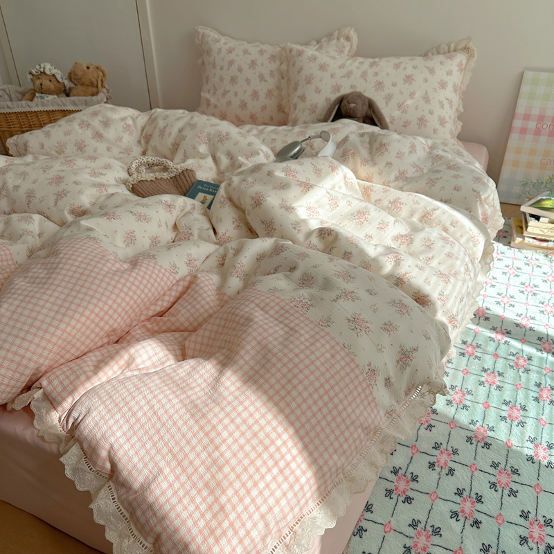 2025新款春日碎花云朵泡泡纱花边套件 粉格花花