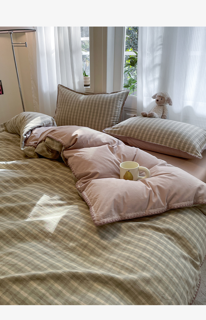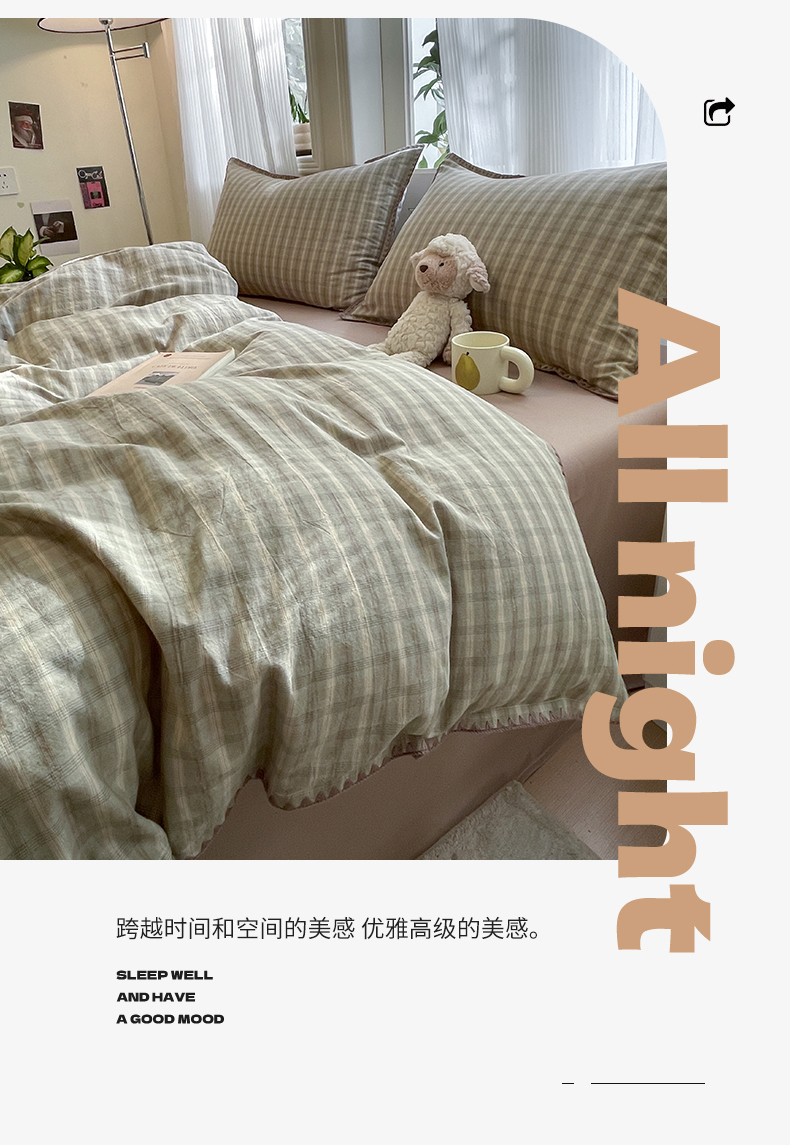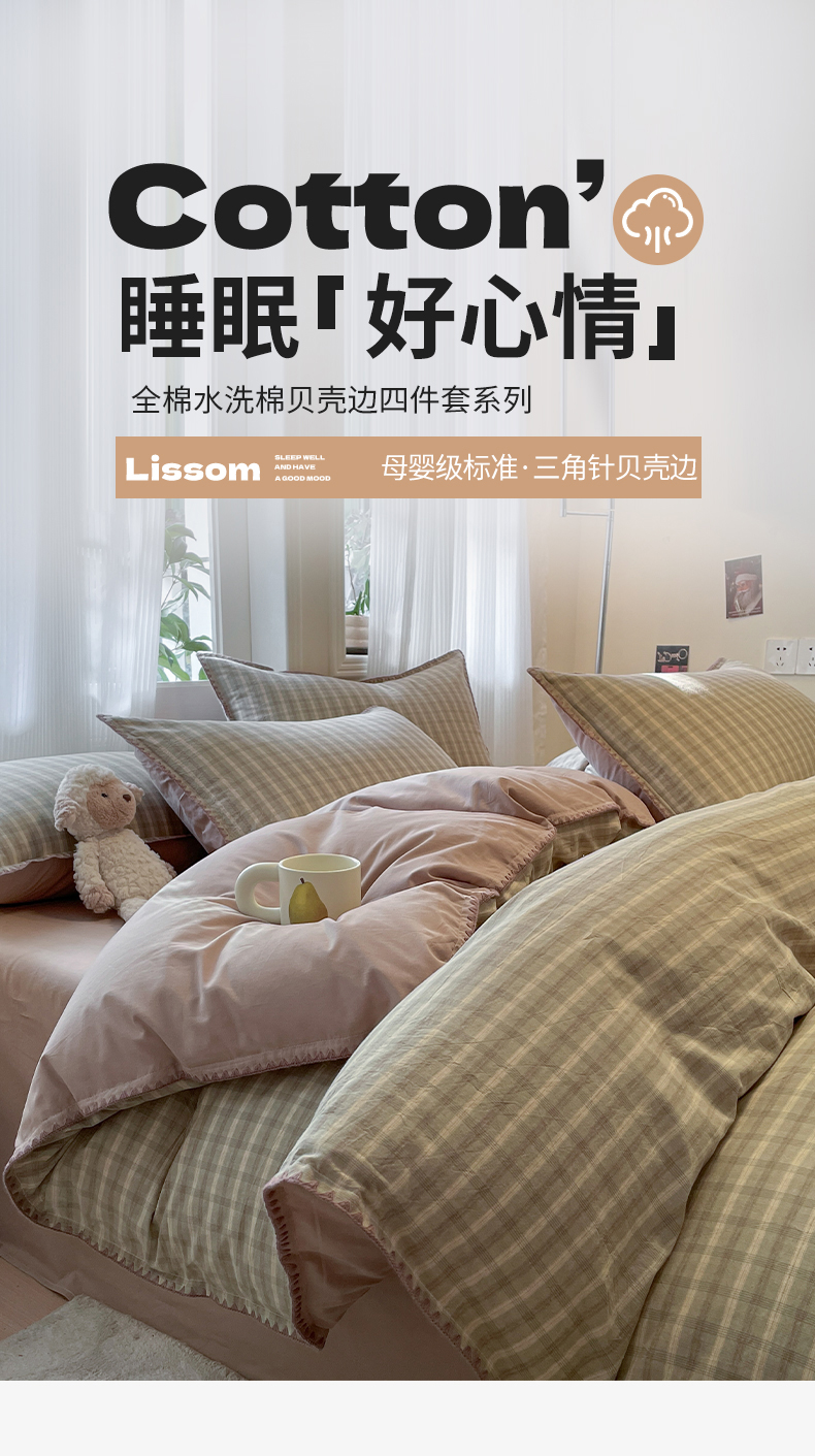 蓝邻家纺 2025年新款全棉水洗棉贝壳边四件套系列 日落绿