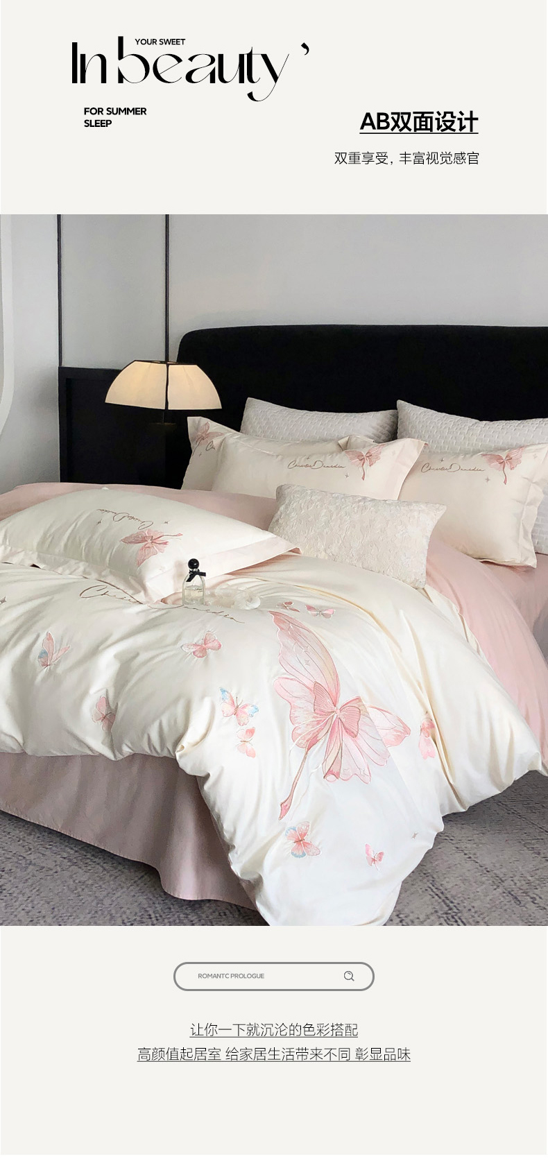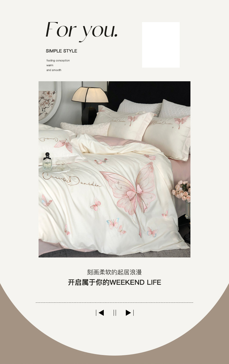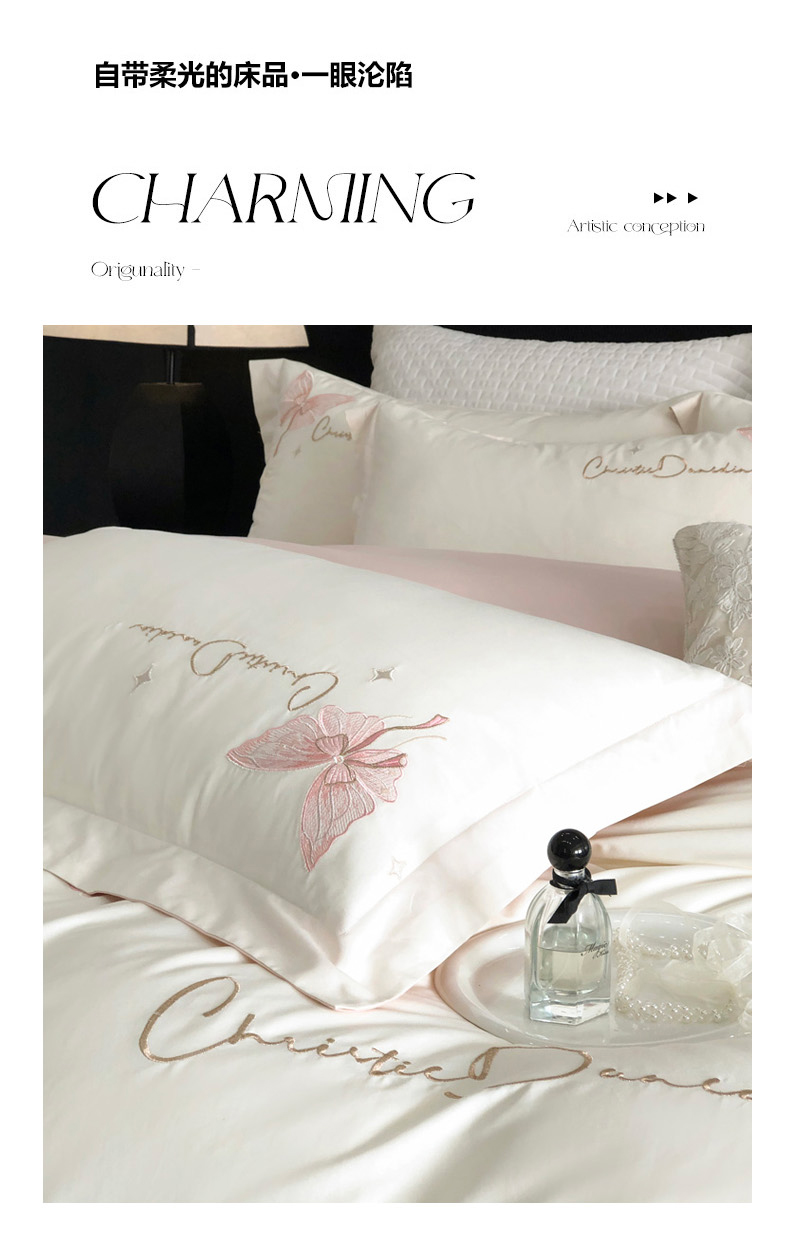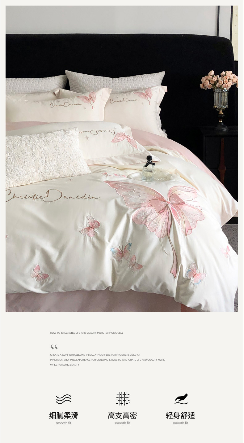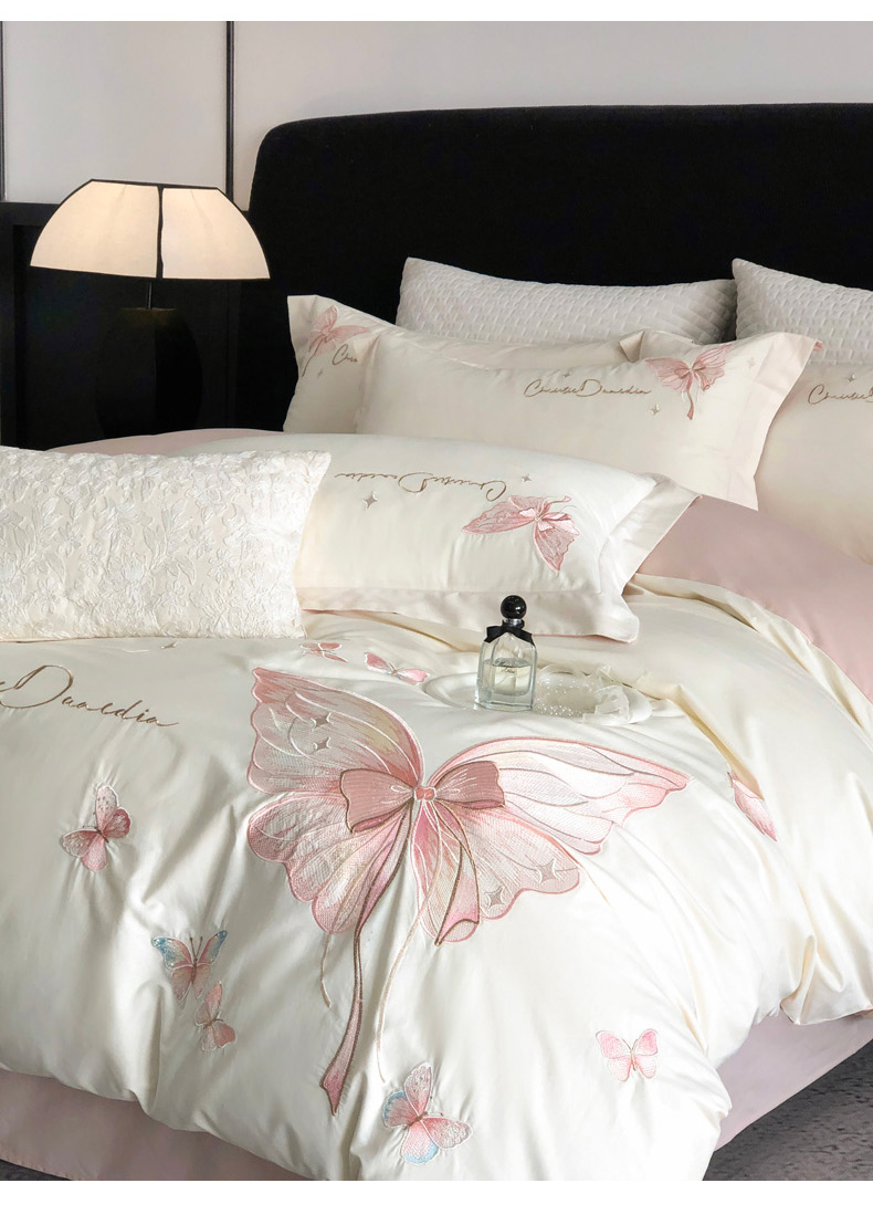 商品名称:万盛家纺2025新款全棉时尚刺绣花四件套--蝴蝶系列 茶白-莺粉