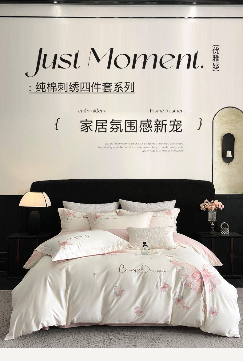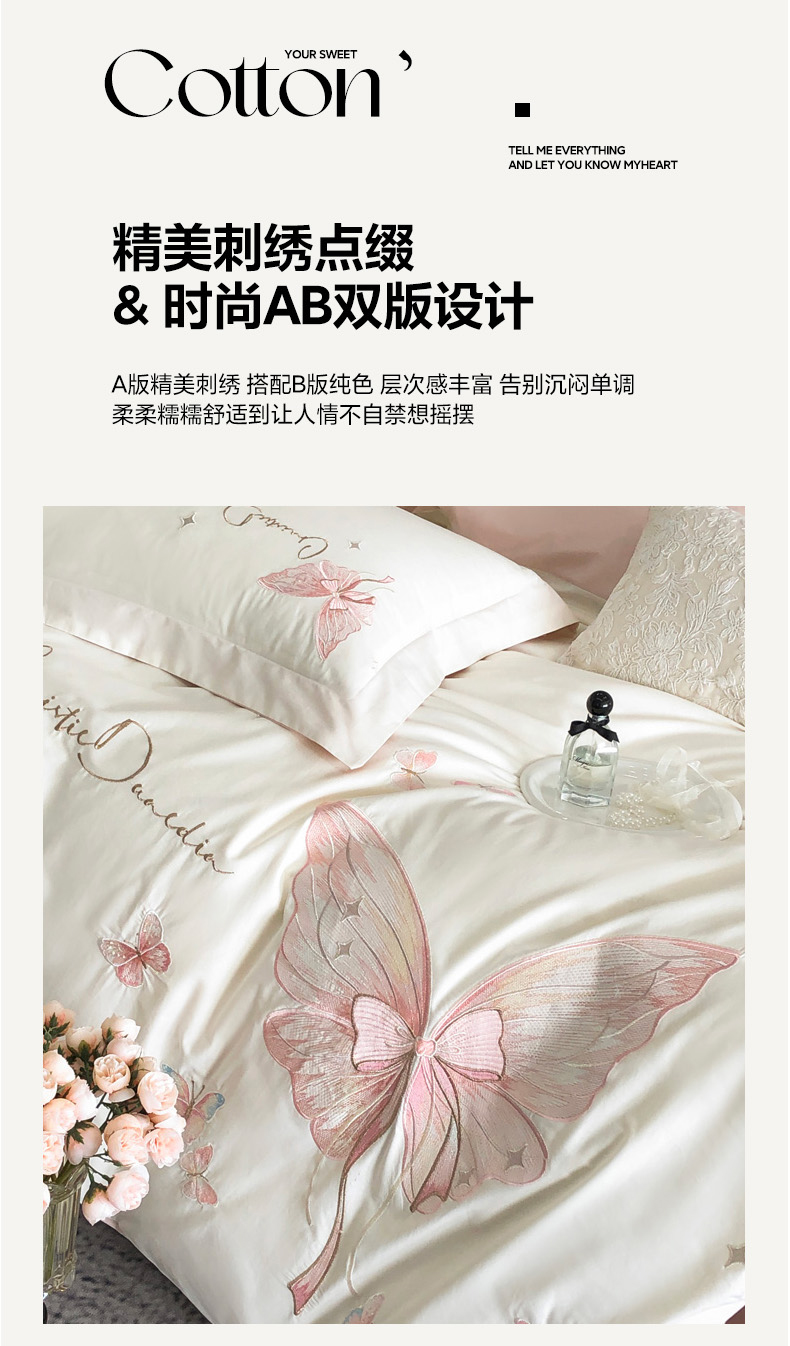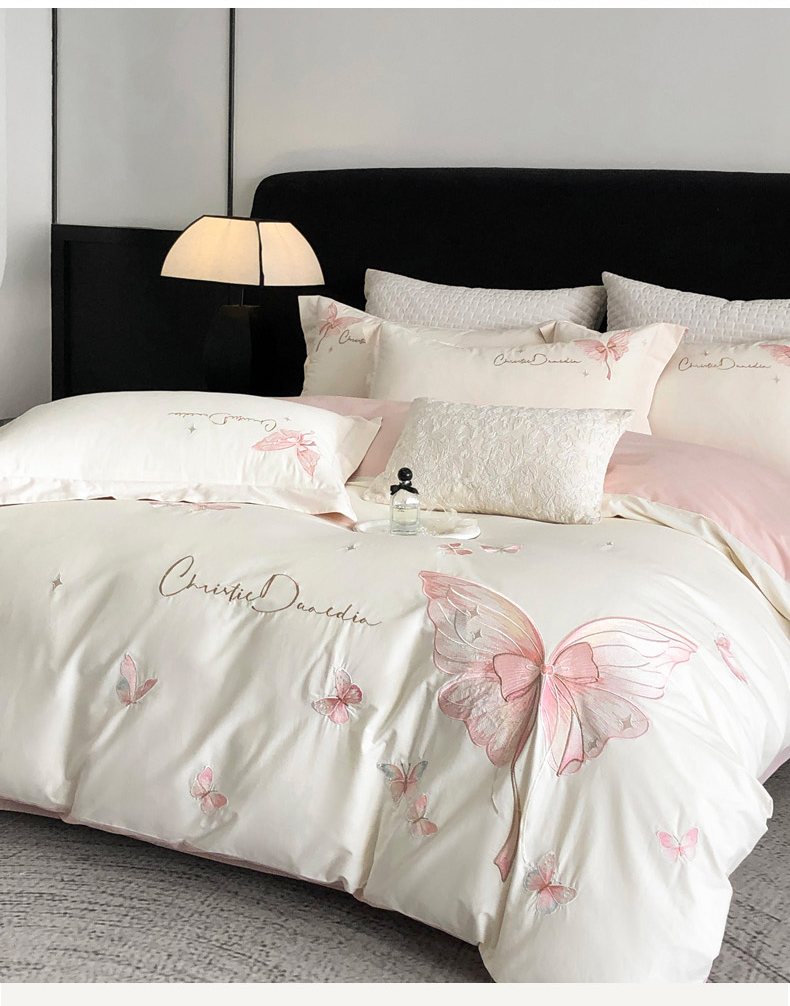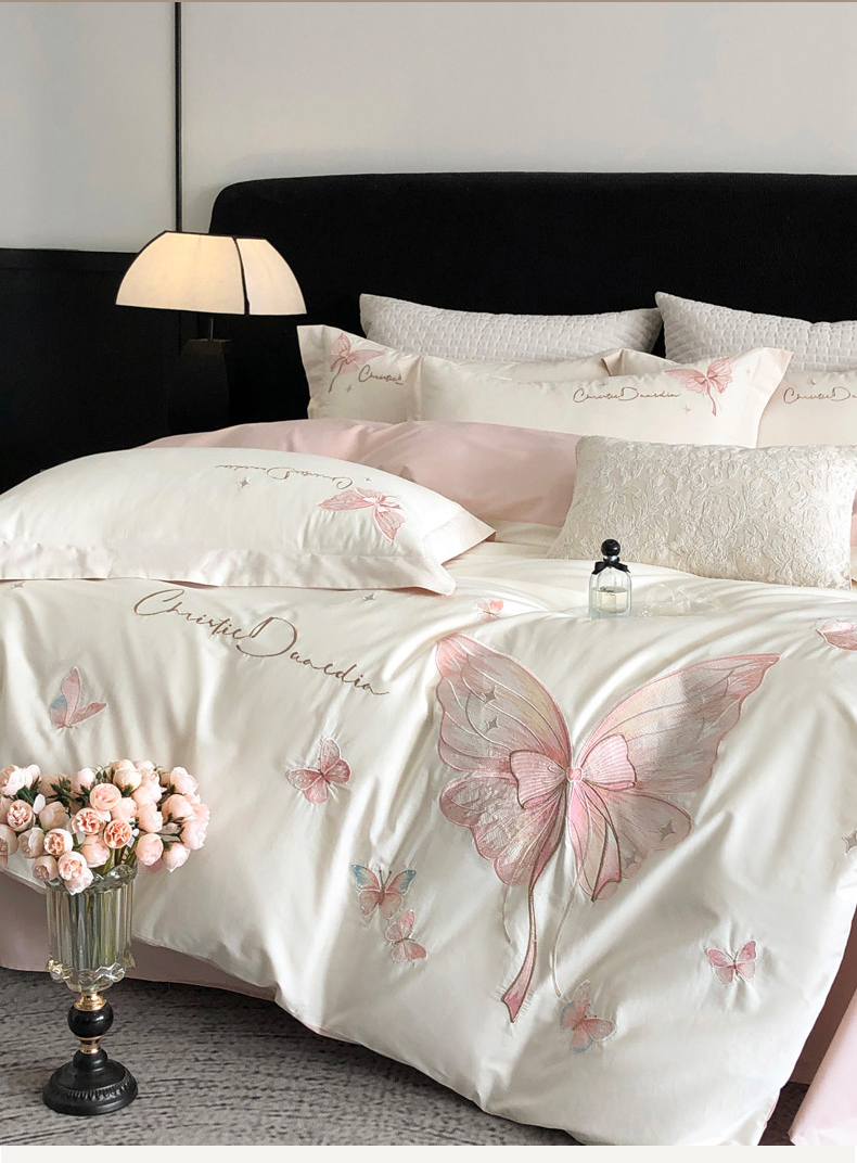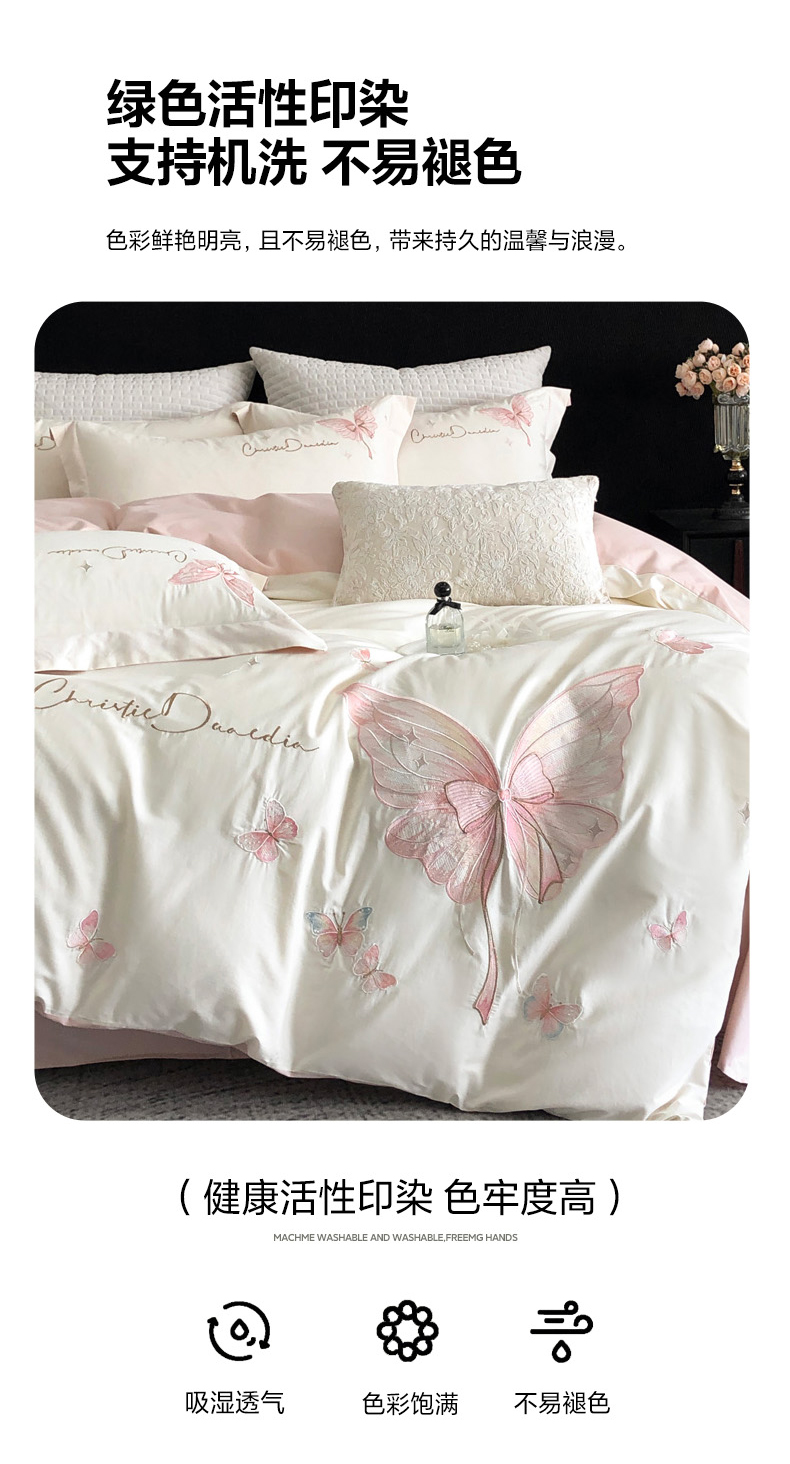 (总)万盛家纺2025年全棉刺绣四件套,茶白-蝴蝶粉,湖绿,花青兰,玫瑰粉