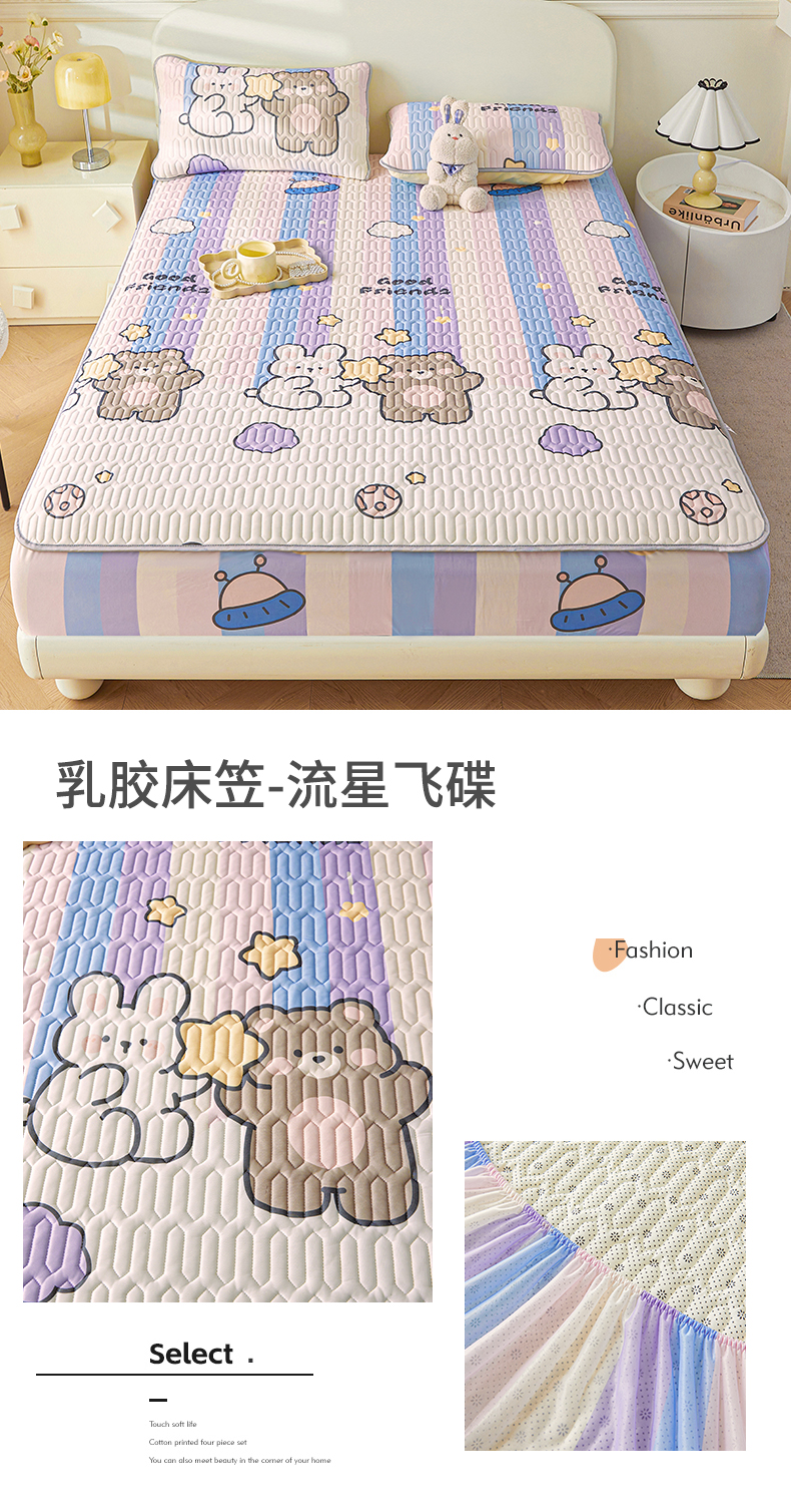 商品名称:雯豆2025夏季新品0.4乳胶凉席床笠款三件套凉感丝印花纯色床罩 乳胶床笠-流星飞碟
