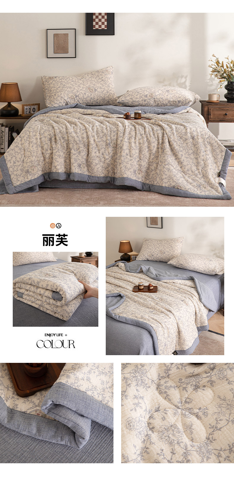 (总)吾诺家居 2026新款全棉色织提花三层纱夏被夏凉被空调被-华美,波点-灰,芳菲-咖,花影-绿,简森-灰,恋恋花开,萌宝,梦幻花园-粉,梦幻花园-灰,太阳花,藤叶-咖,香水繁花-绿
