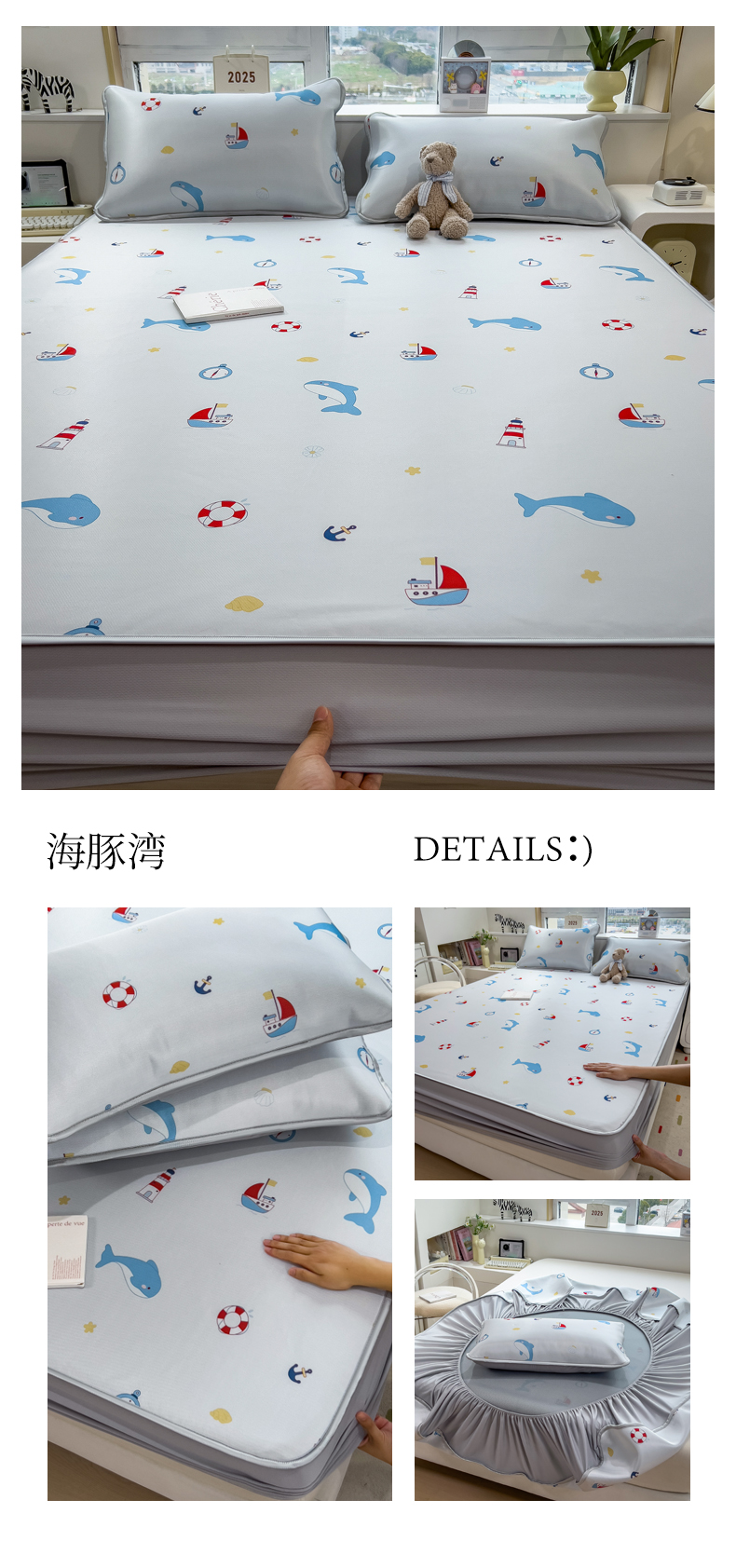 商品名称:丝羽坊 2025新款小版印花冰丝凉席冰丝席碳光冰丝凉席-床笠款 海豚湾