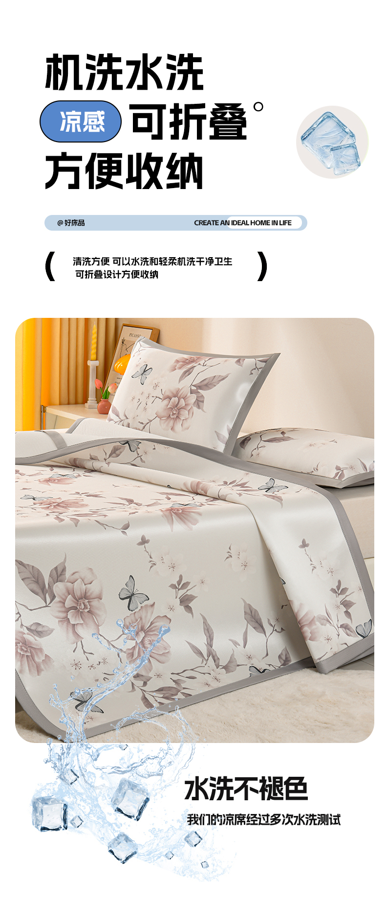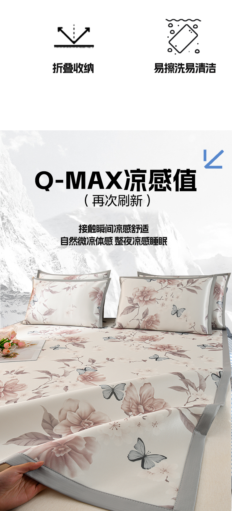 商品名称:简一 2025新款A类碳光印花数码冰丝凉席系列-床笠款 蝴蝶花谷