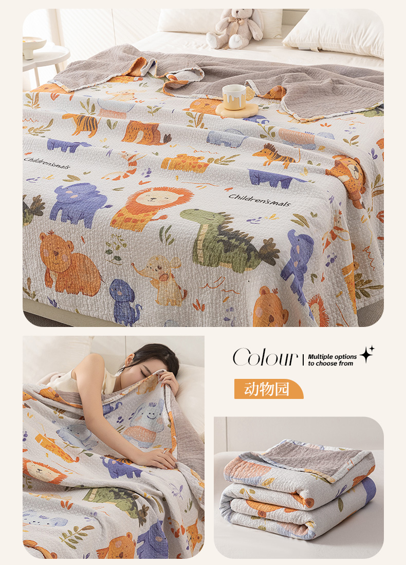 商品名称:乐家毛巾被(工厂自产自销) 2025春夏新款三层全棉纯棉印花毛巾被 动物园