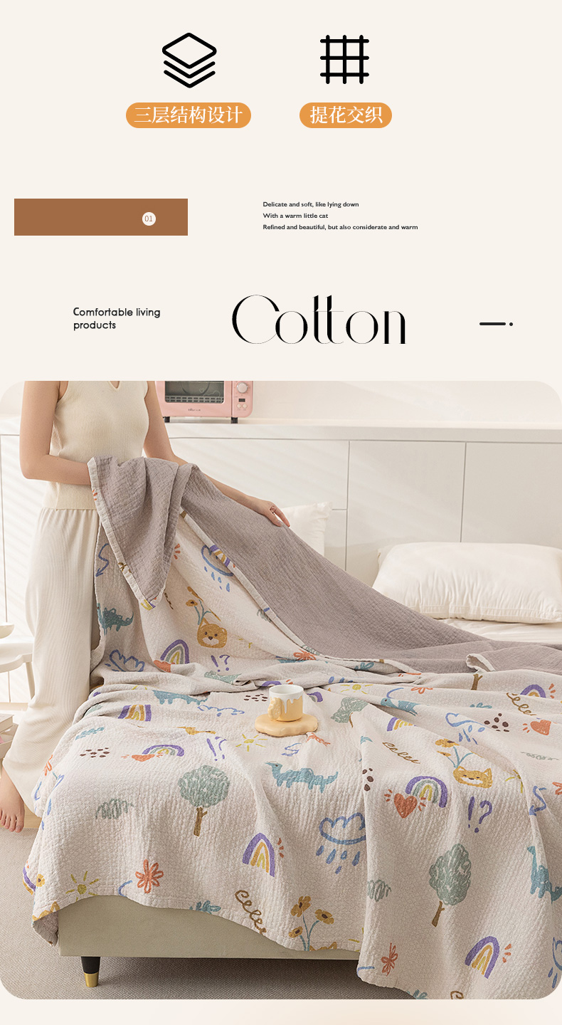 乐家毛巾被(工厂自产自销) 2025春夏新款三层全棉纯棉印花毛巾被 动物园